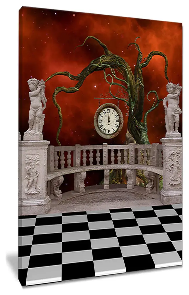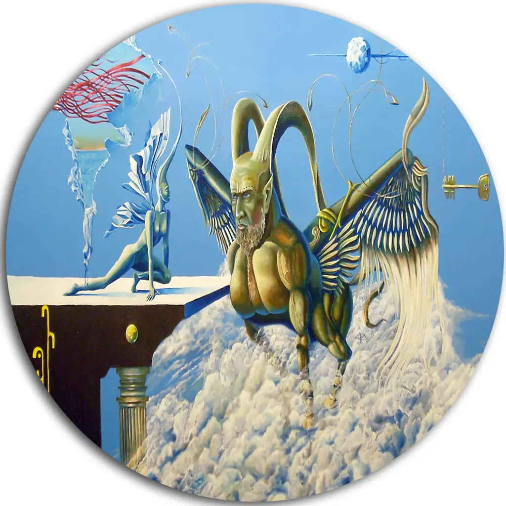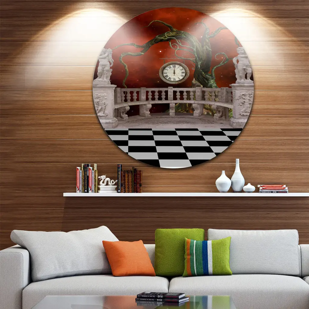 Bring Contemporary Abstraction to your home with this large Circle Metal wall art. This Balcony with Clock and Tree Angels Metal Artwork makes it the focal point of any room or office. - White Gloss Coating ensures colors are extra vibrant with light reflection.- Aluminum grade Sheet Metal with 1 inch mounting frame on the back giving the illusion that the artwork is floating on the wall..- Mounting Brackets are included along with instructions.- High Quality Digital images are created directly into a glossy aluminum panel producing a stunning and captivating print into the glossy finish of the metal.- Water, Fire and Scratch resistant HD Aluminum panels.- Looks better than any photo paper and guaranteed to last at least 20 years- Easy to clean with a microfiber cloth. Colors are far superior to regular Canvas Art. - Easy to Hang