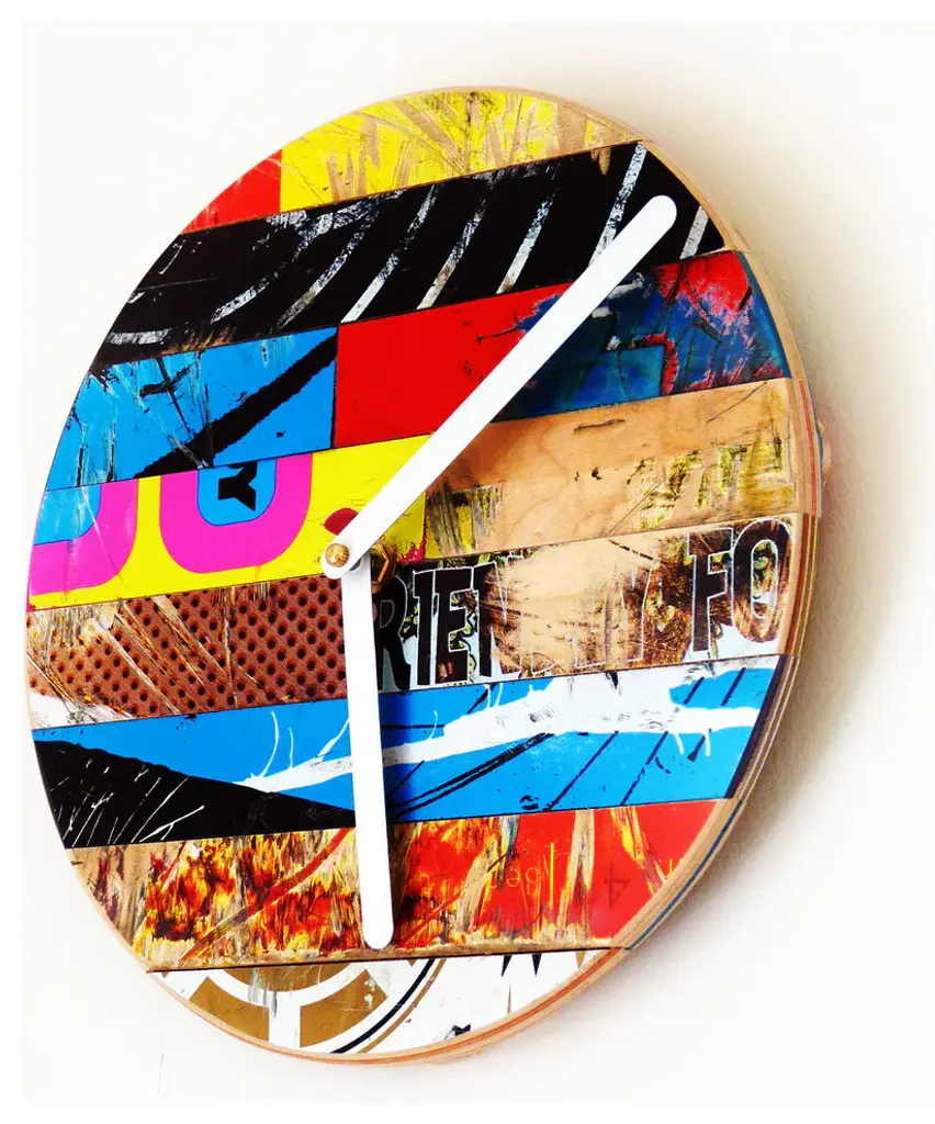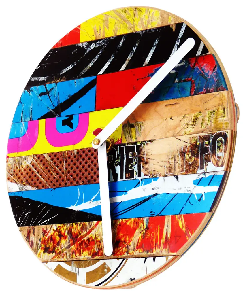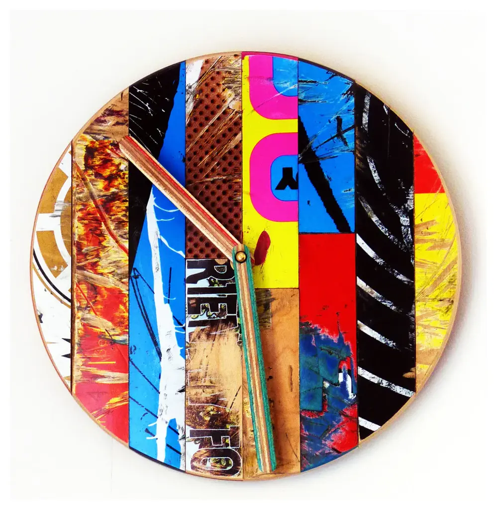 Minimal and modern, yet graphic and colorful. Handcrafted from 100% ripped and recycled skateboards, every clock is a one-of-kind piece of functional skate-art for your wall. The absence of numbers means the Basic skate clock may be oriented in any way you choose. Clock Size: 10" Diameter x 0.75" tk. (1.25" tk. including clock motor and hands.) The Basic SkateClock includes a USA made, quality "High Torque" Clock Motor/Hardware set, a Wall Hanger clip. (1) Set of "Popsicle Stick" shaped clock hands We will ship you a random Basic Skateboard Clock from our inventory. Made in the USA by Deckstool.