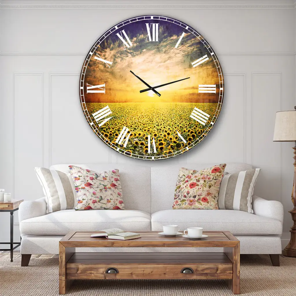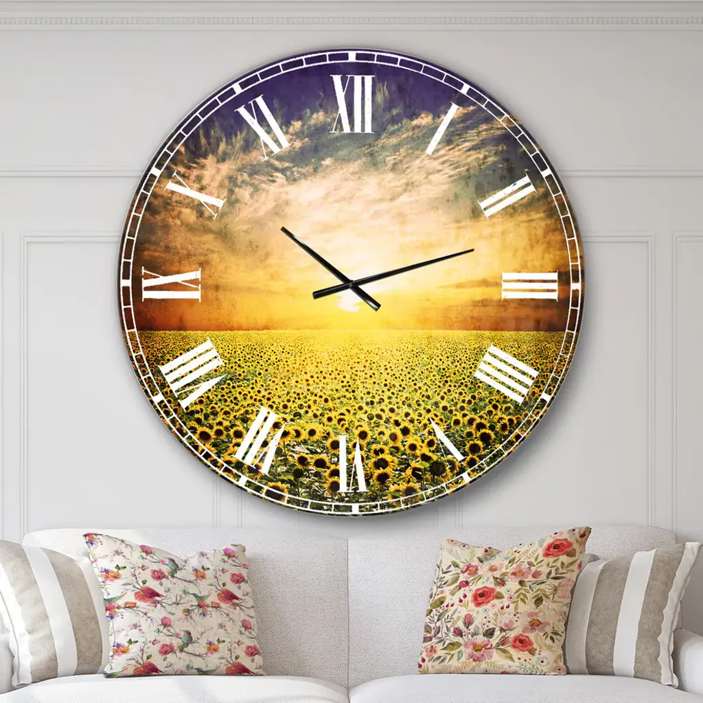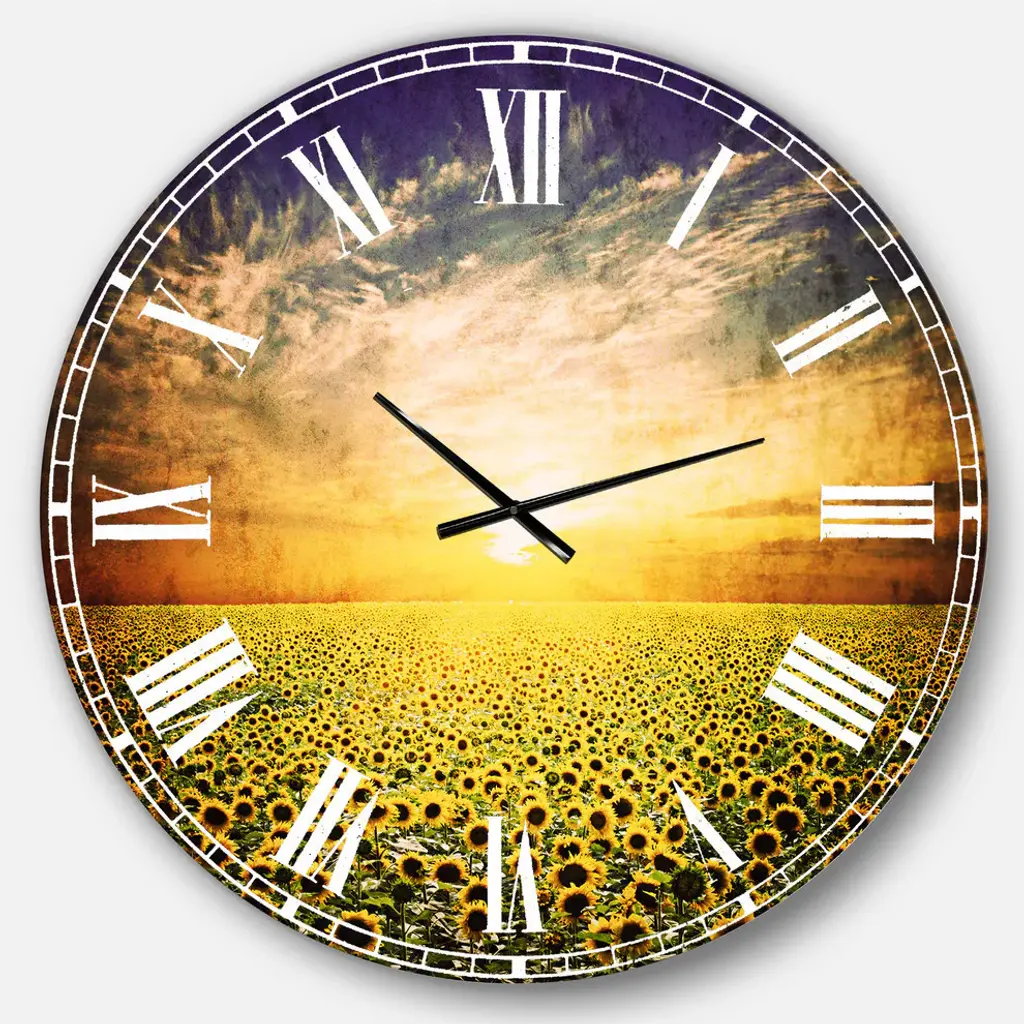 Beauty Sunset Over Sunflowers Field Floral Metal Clock, 36x36