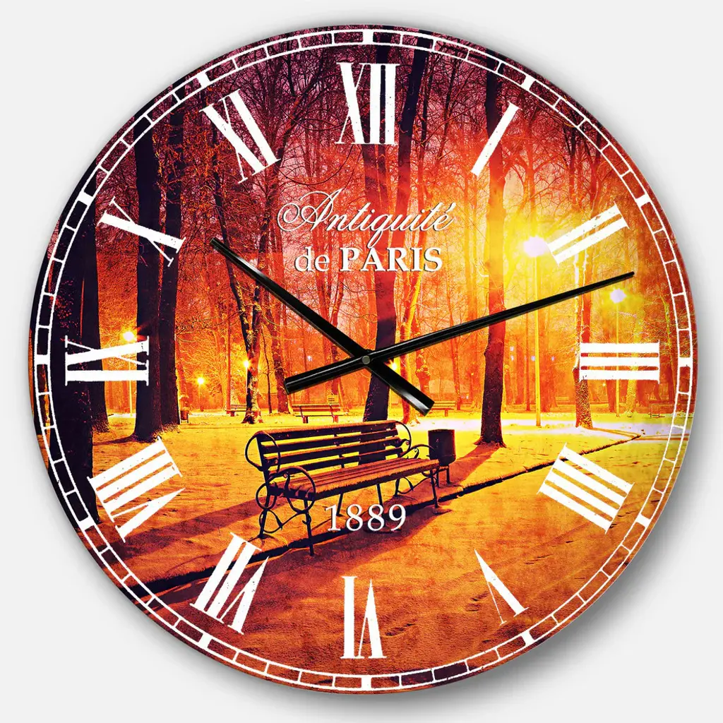 A beautiful addition to any home or office, this French Country round wall clock is made on 100% solid aluminum. It has a highly reflective glossy finish creating a sleek modern look. This Benches Covered in Winter Snow wall clock arrives completely ready to hang on the wall. Simply insert the �AAA� battery included with your order.Available in several size, this Modern Oversized Clock makes it the focal point of any room.Features - Ultra Gloss Coating ensures colors are extra vibrant with light reflection. - 1mm Aluminum grade sheet metal. - 1-inch mounting frame gives the illusion of artwork floating on the wall. - Mounting brackets and instructions are included. - High quality digital images are created directly into a glossy aluminum panel, producing a stunning and captivating print in the glossy finish of the metal. - Looks better than any photo paper and guaranteed to last at least 20 years. - Easy to clean with a microfiber cloth. - "AAA" battery included with your order. - Easy to hang. - Style: French Country - Material: Metal - Shape: RoundSee Options drop down for available sizes.
