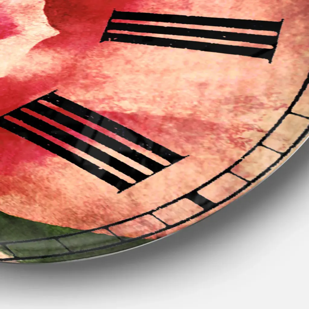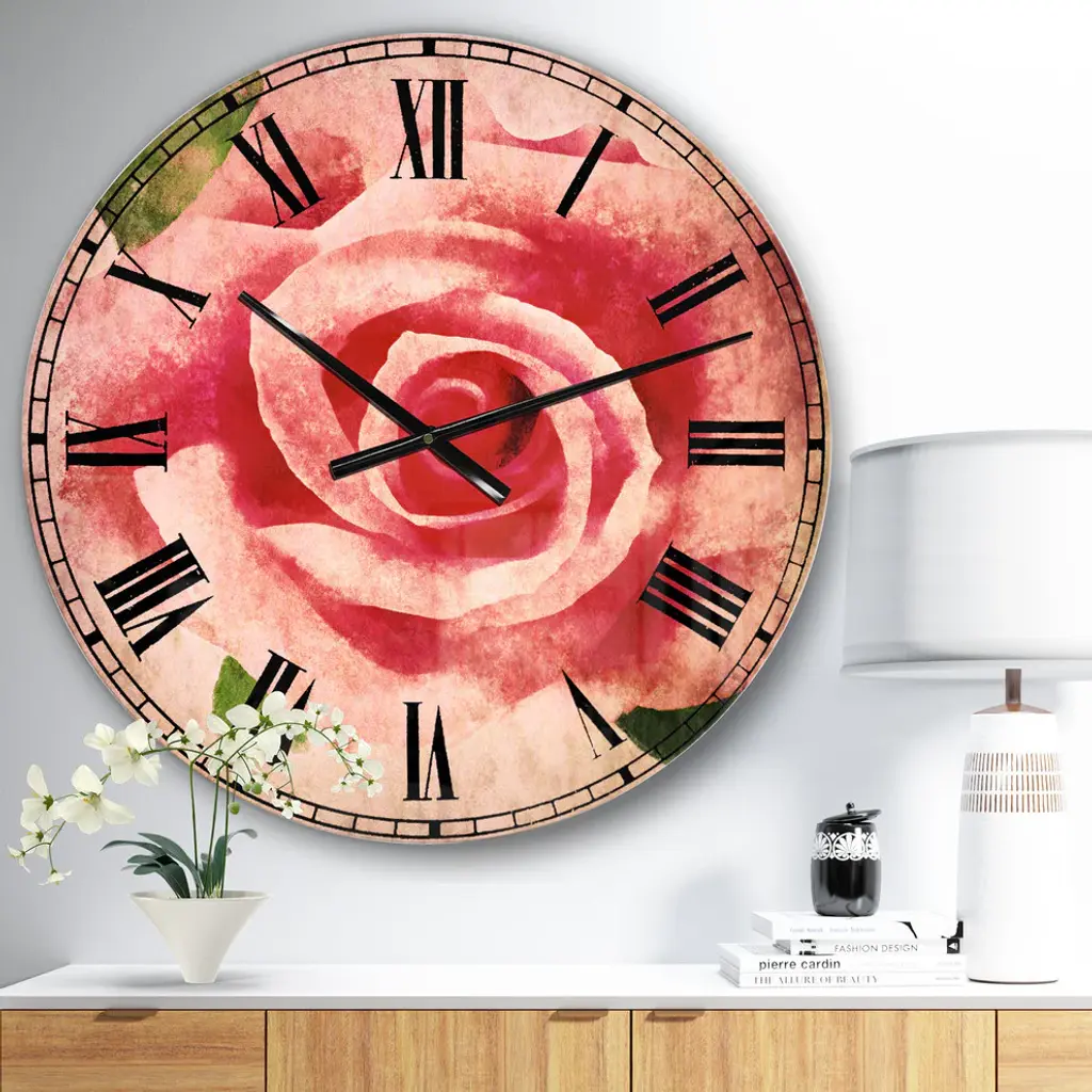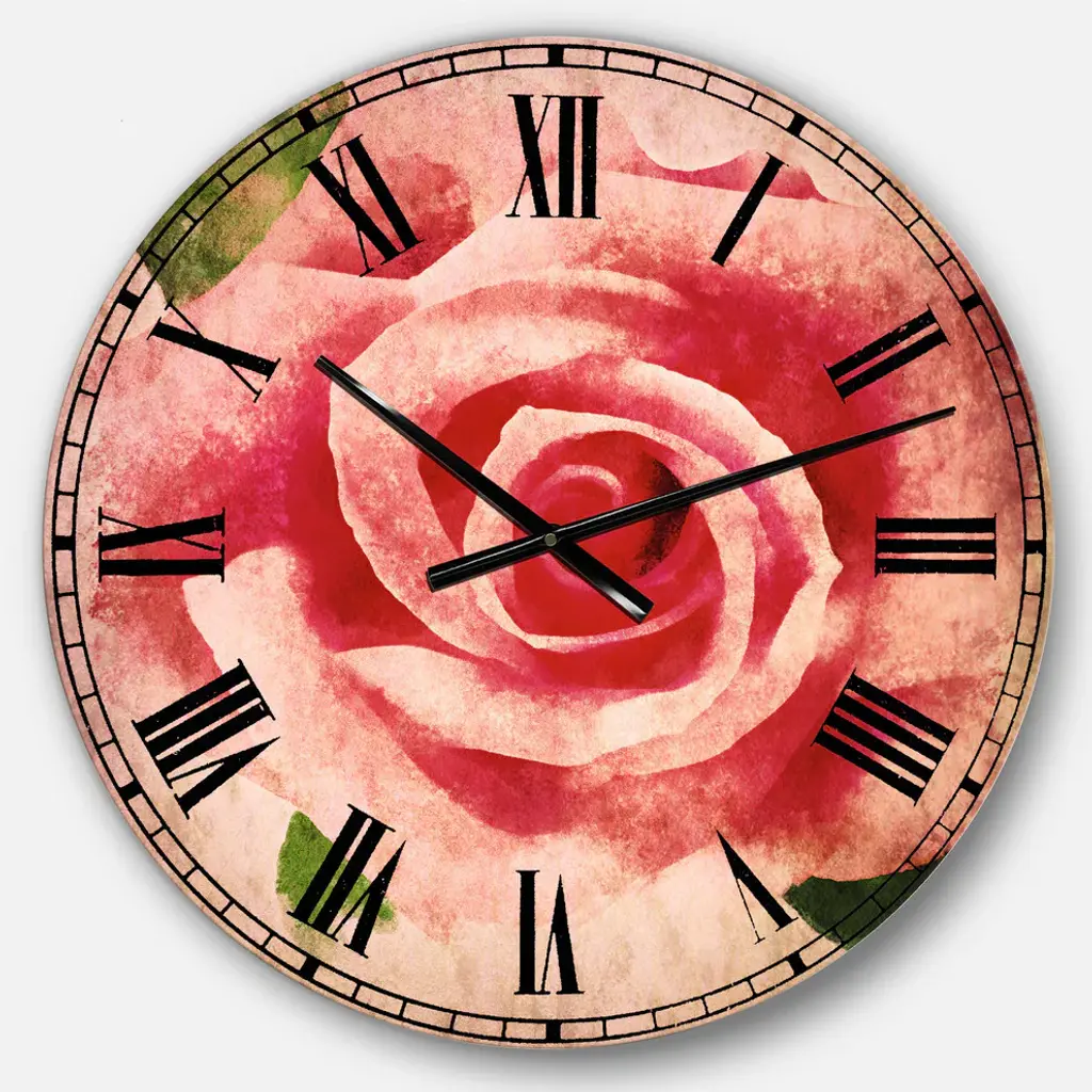 Big Pink Rose Flower With Leaves Floral Large Metal Wall Clock, 23x23
