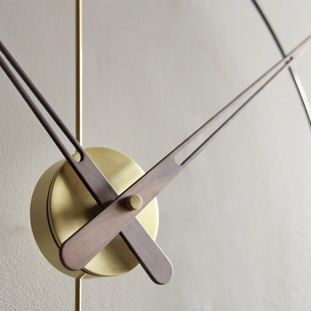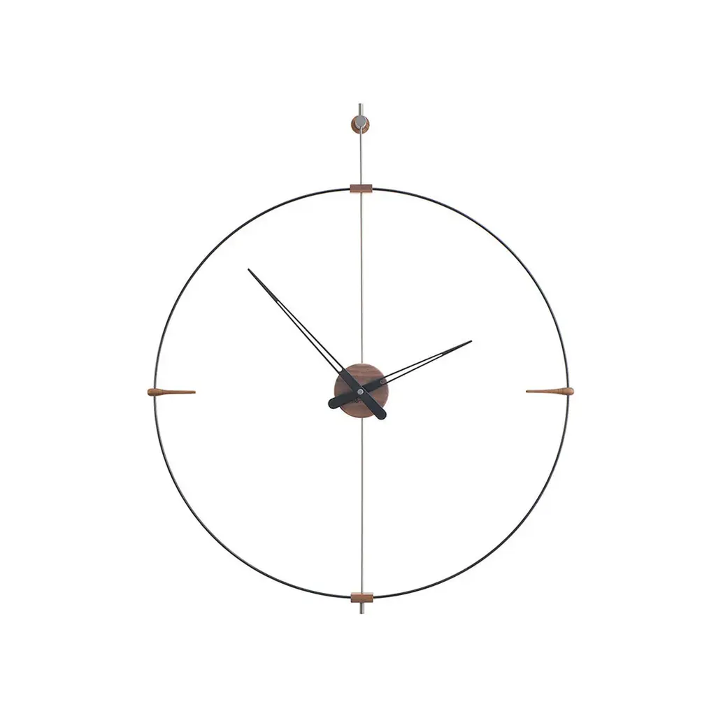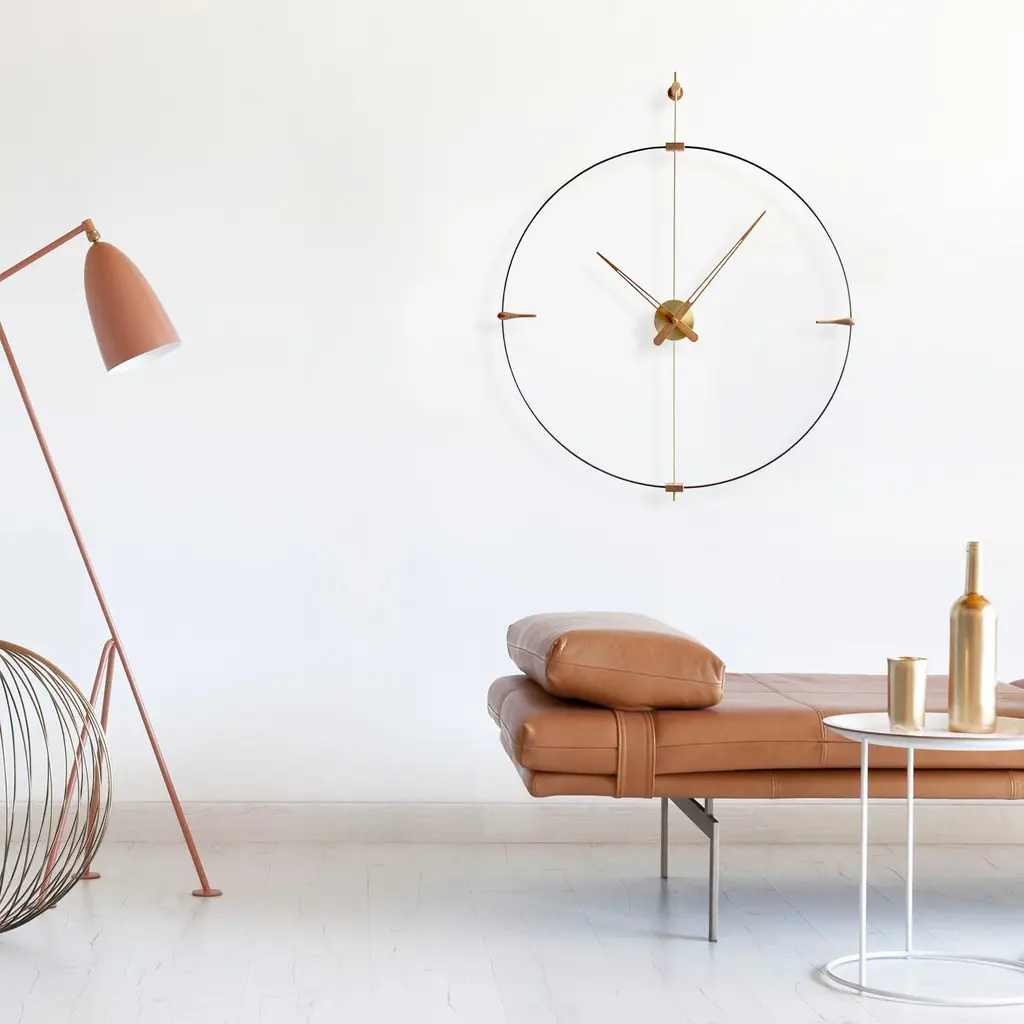 Bilbao's suspended ring enhances a minimalist vibe via Nomon’s crisp styling in a choice of black or white with needle hands to match or contrast — or choose an accent of gorgeous genuine walnut. Available in regular and mini versions, the handcrafted wall clock's metal support and center box come in complementary chrome or brass finishes. Battery-powered and made in Spain with a precision German quartz works, the statement clock is easily installed to elevate any space.