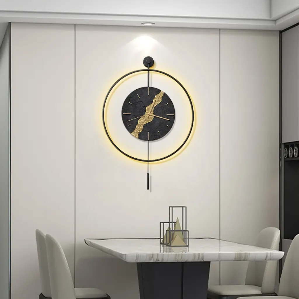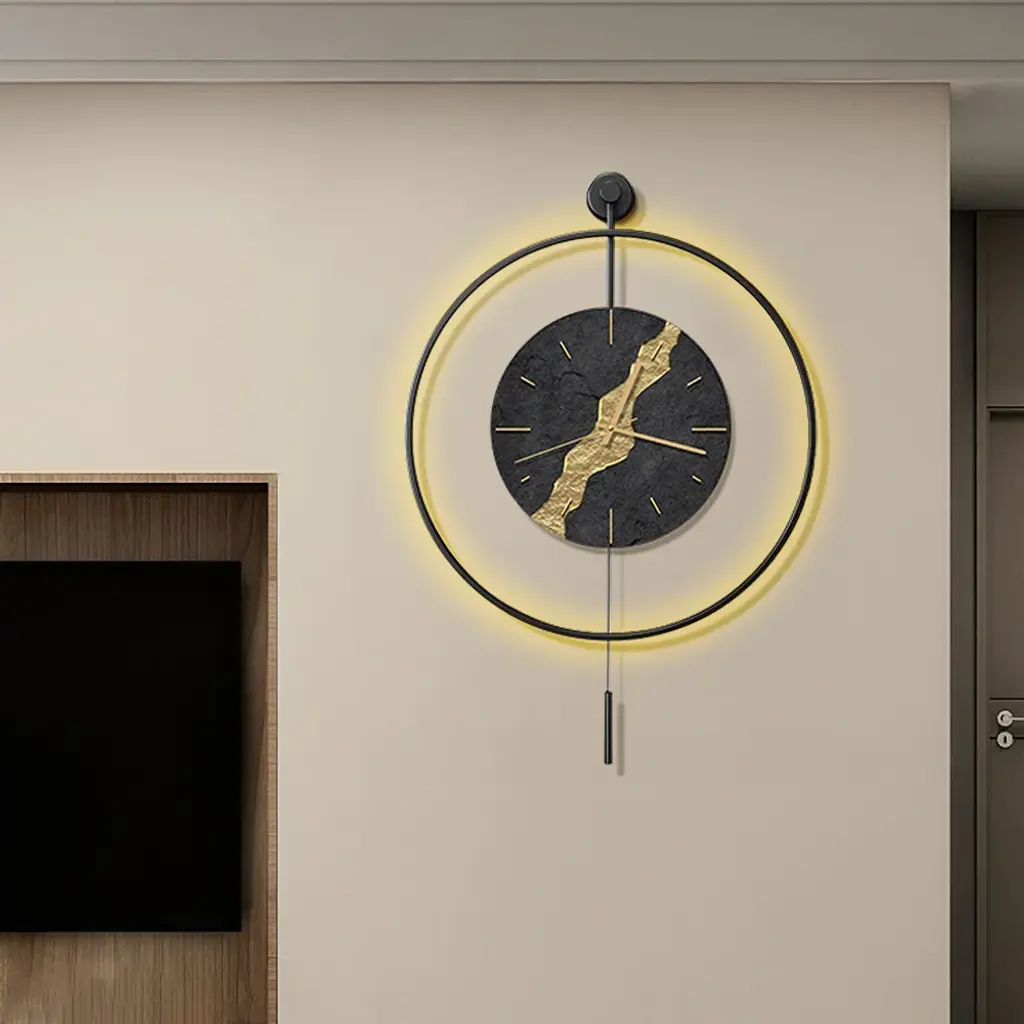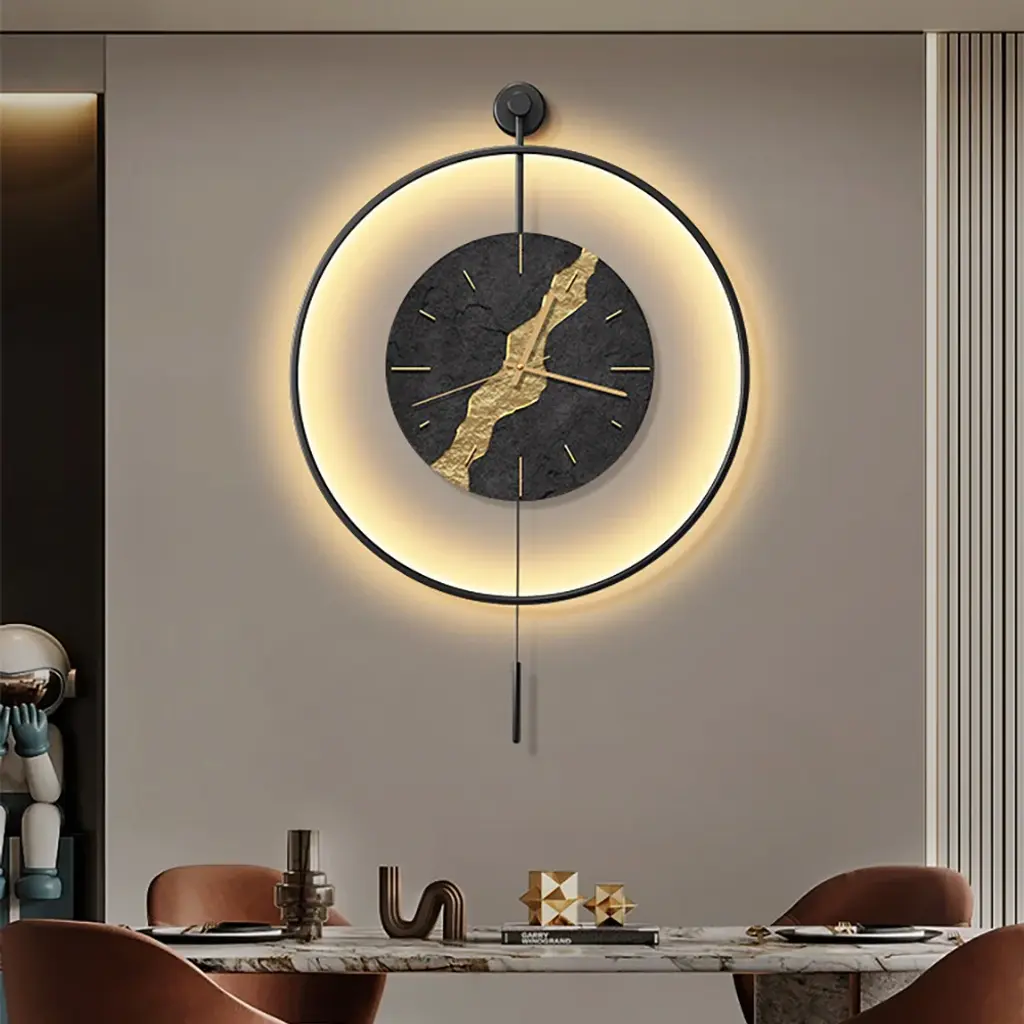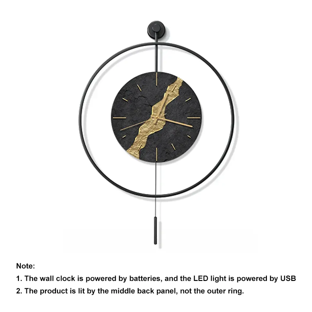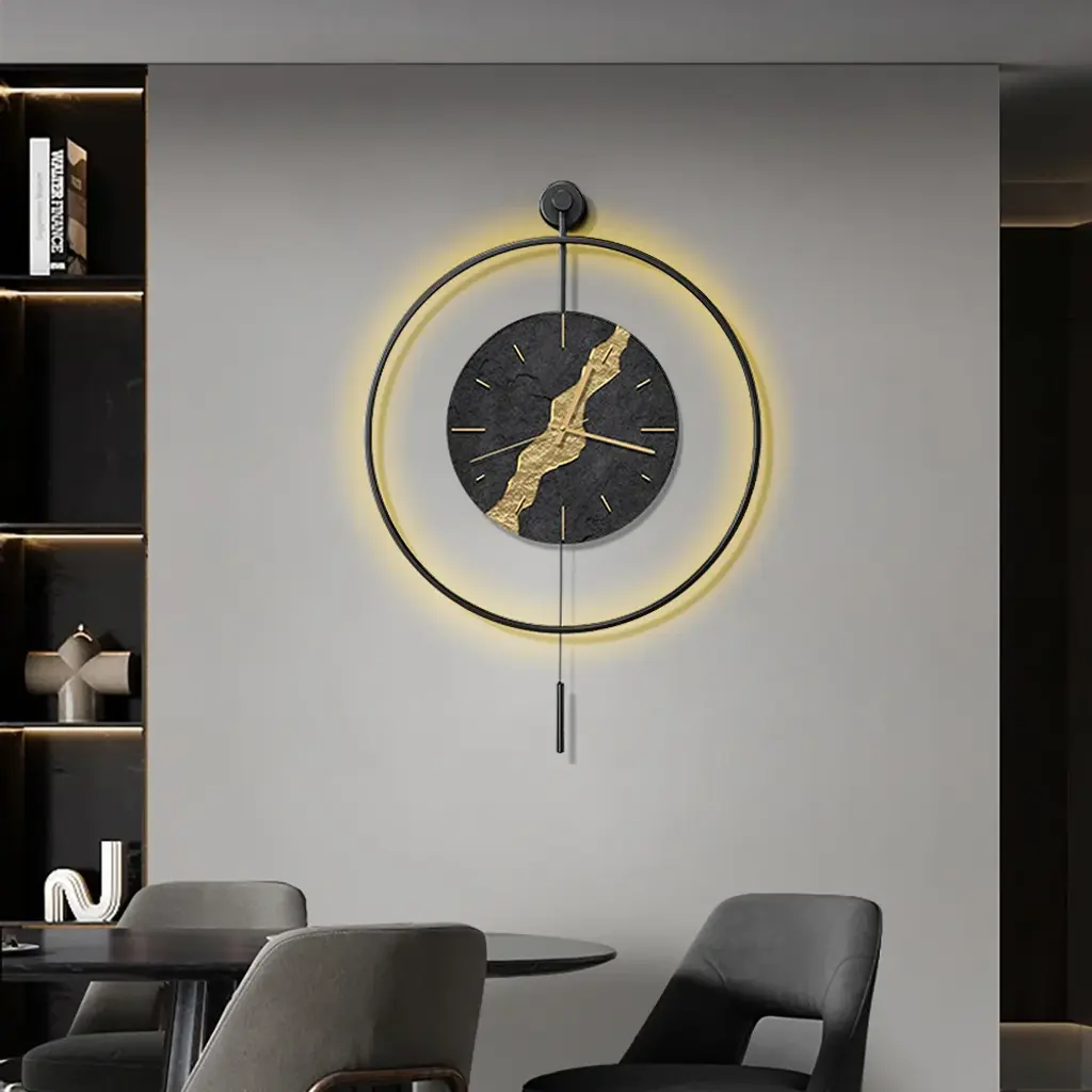 Black & Gold Led Light Pendulum Wall Clock Metal Wall Art Silent Wall Clock