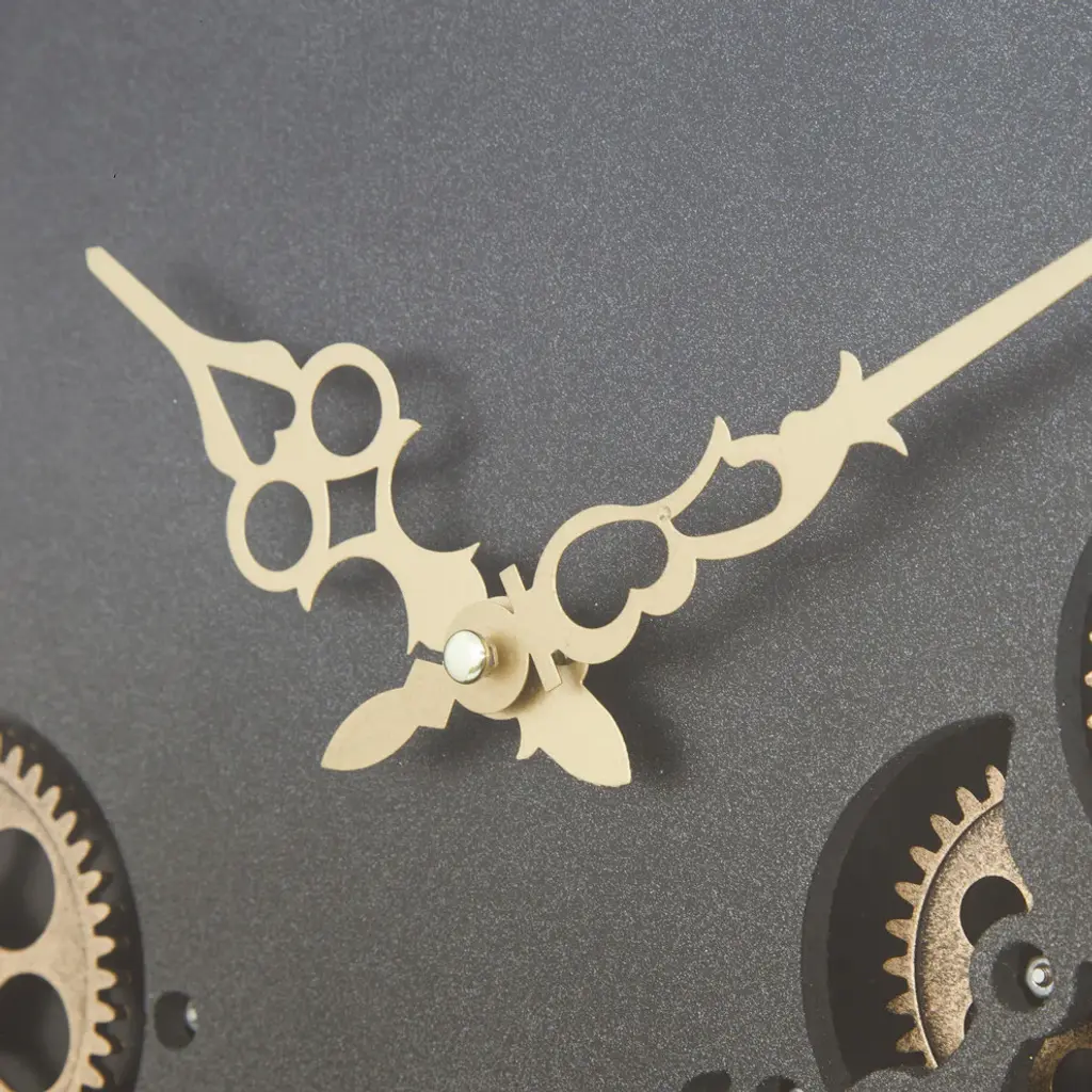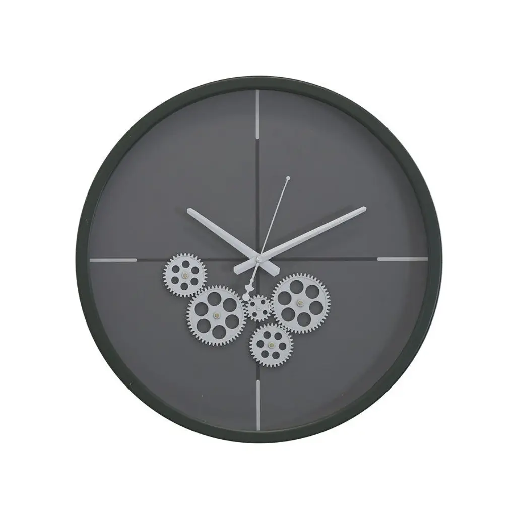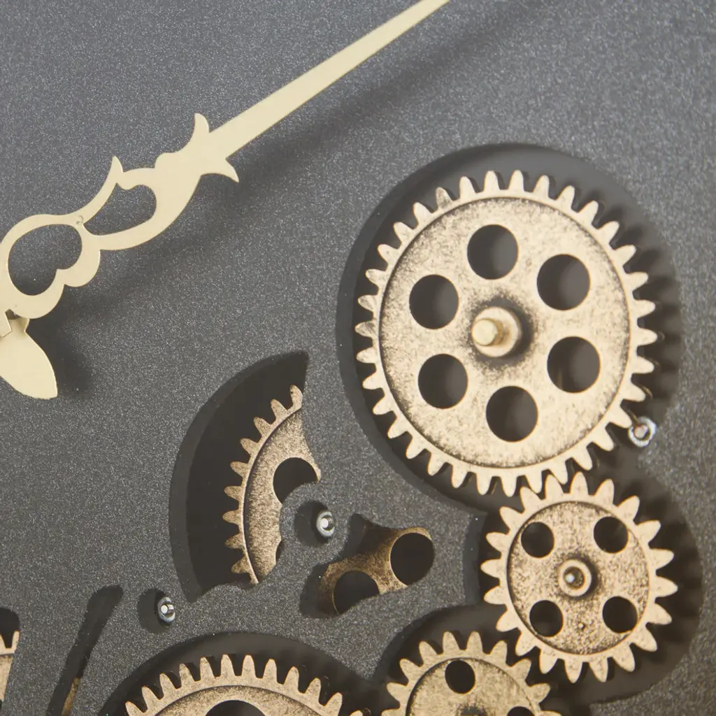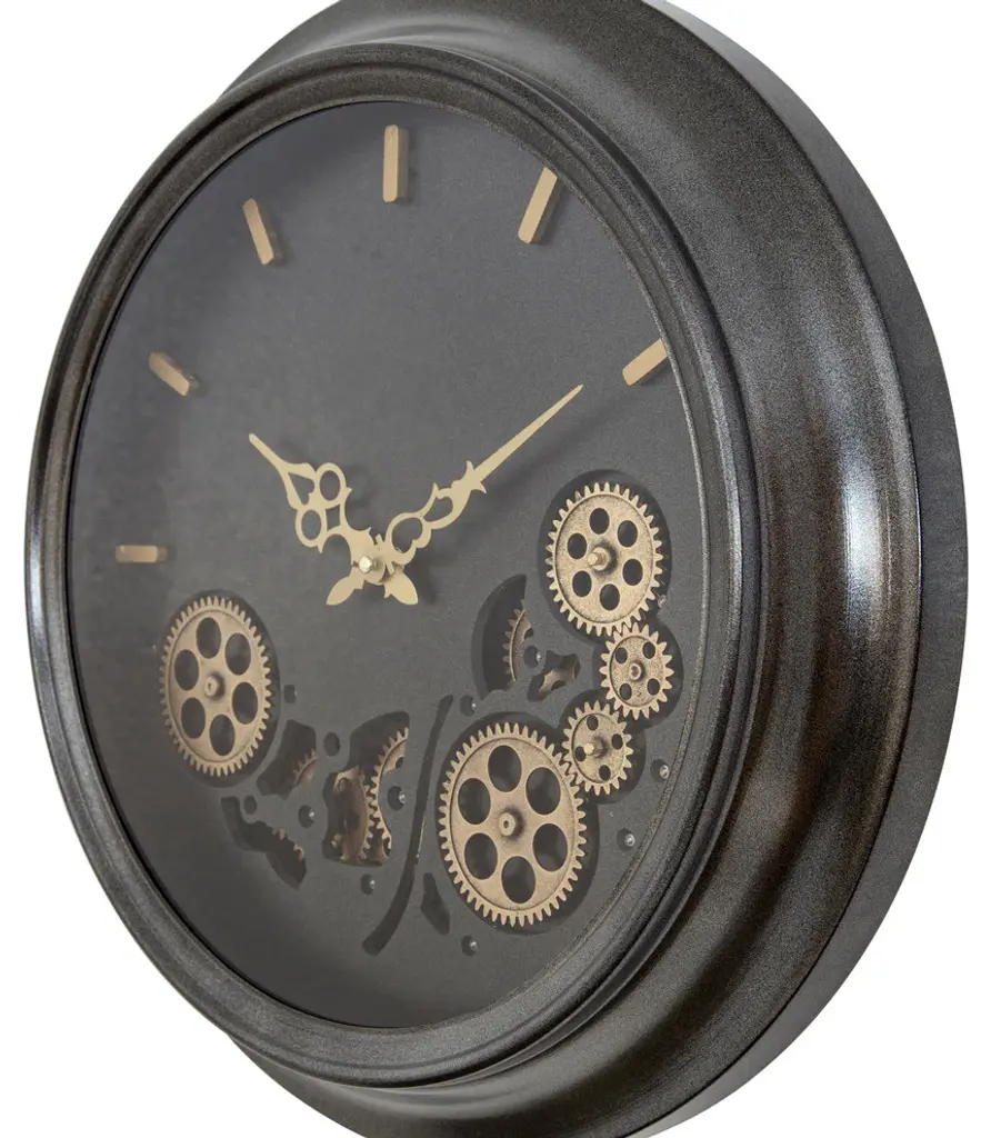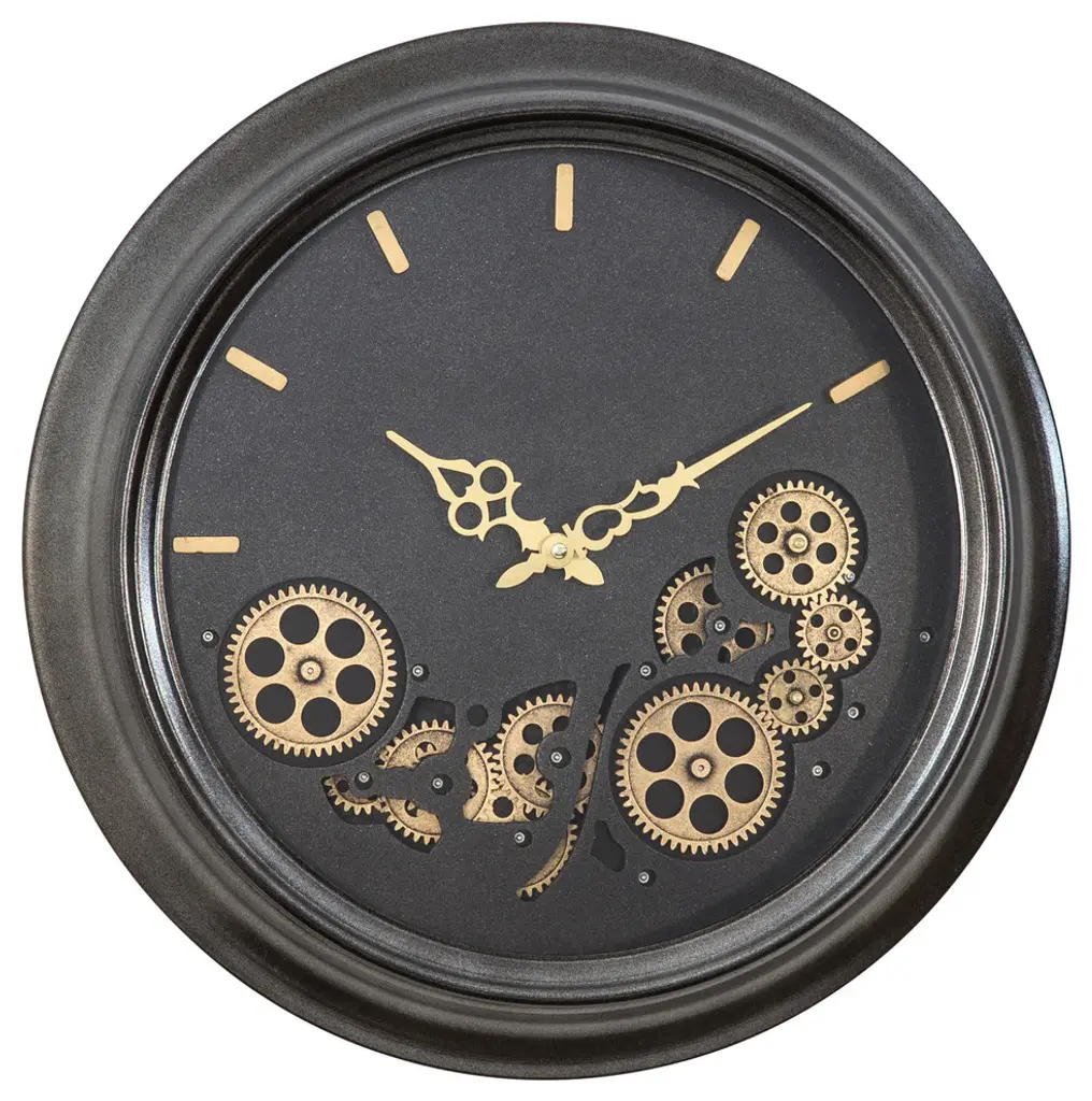 Yosemite Home Decor presents a collection of an Open Gear Wall Clocks. Main feature of all items in this collection are decorative moving gears, powered by two AA baterries. Additional separate AA battery is reqired for clock mechanism. Sophisticated design combines temiless classics and modern trends. Several conrasted finishes and layers of textures make open Gear Wall Clocks a statement and focal point well suiting to wide array of styles. There''s something captivating about the clean design of Black Round Gear Clock. It gear mechanism is partially exposed. From its simple black frame, to the dashes on the black clock face universal to time telling. All set underneath glass, the gold hands add to the chic style.