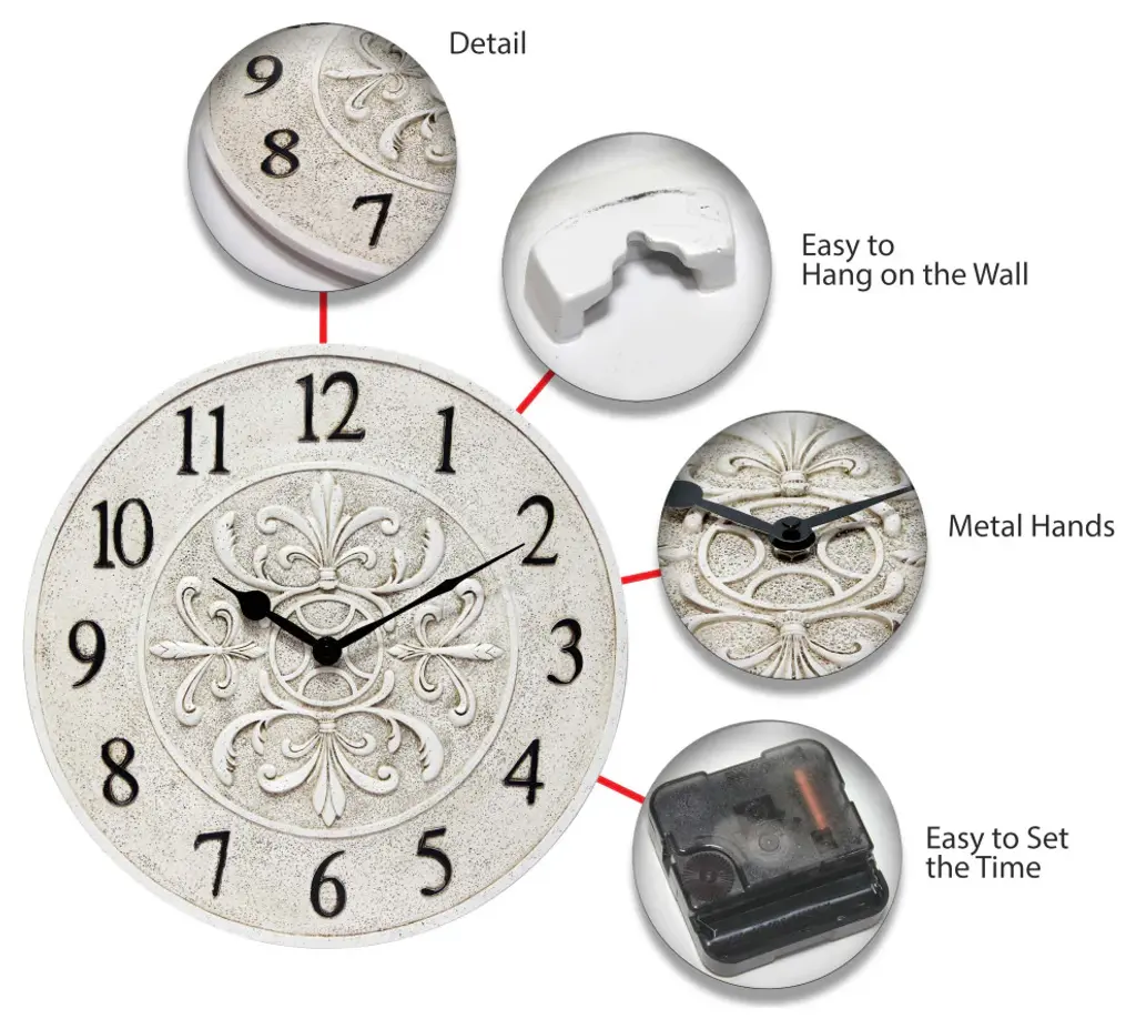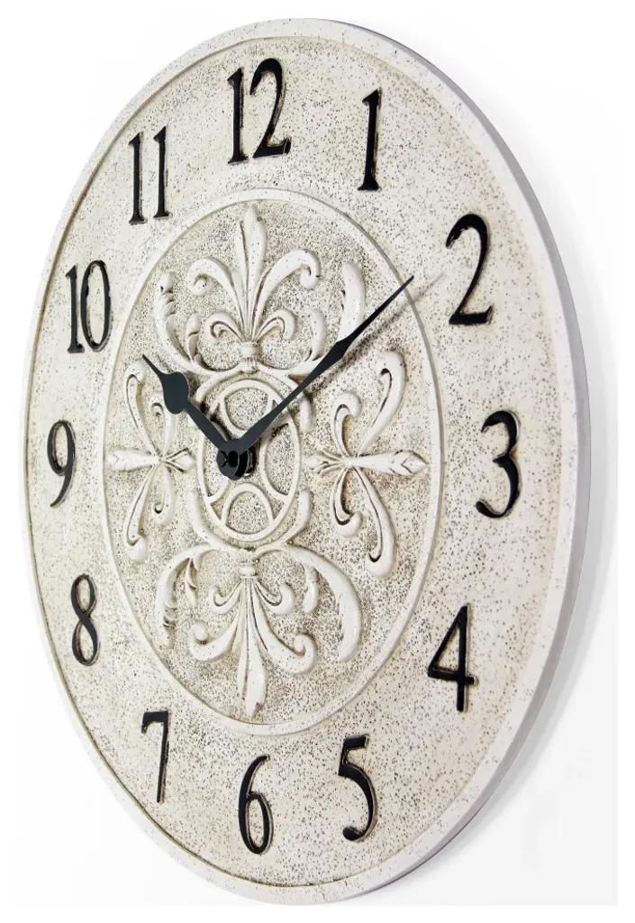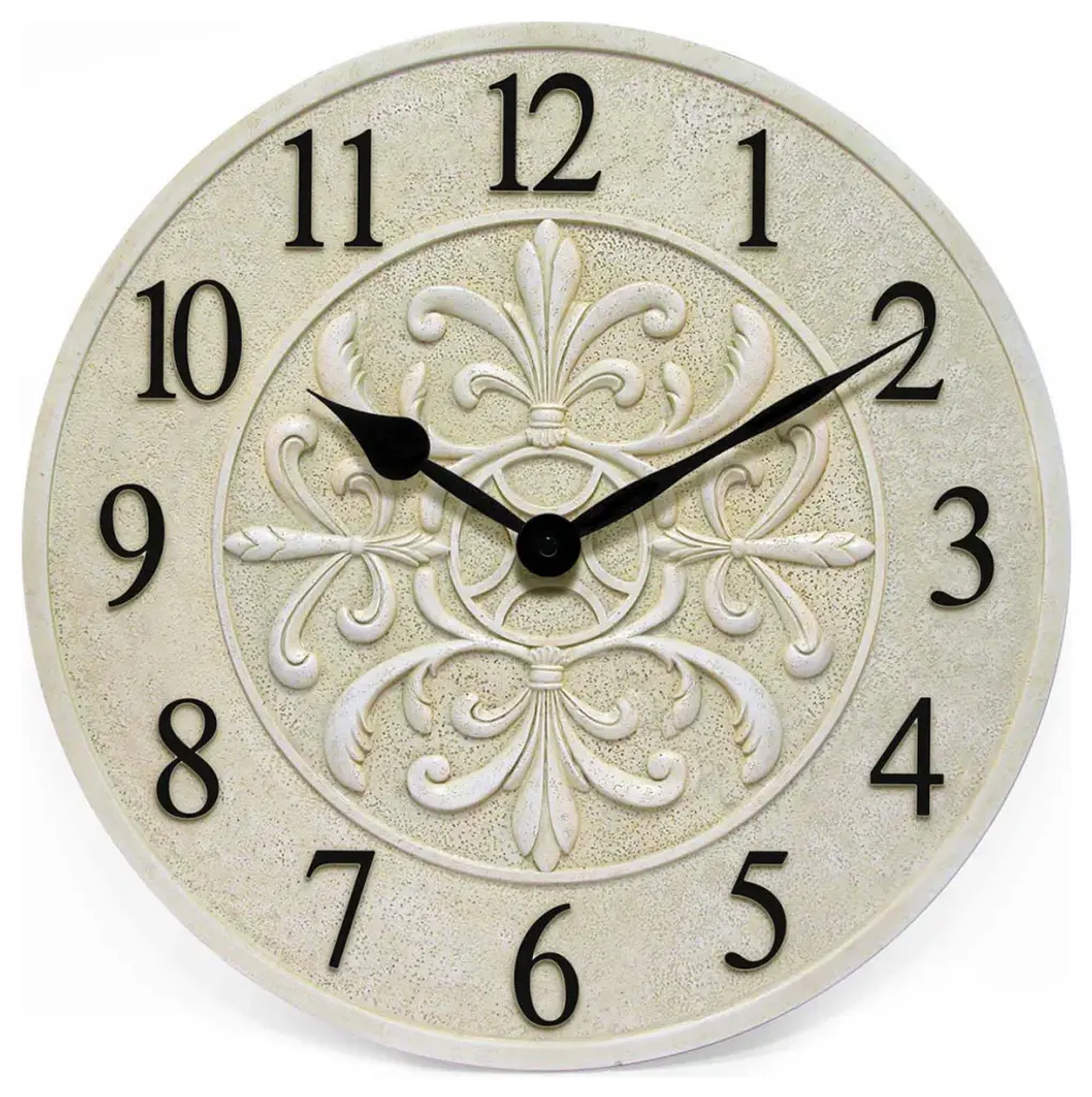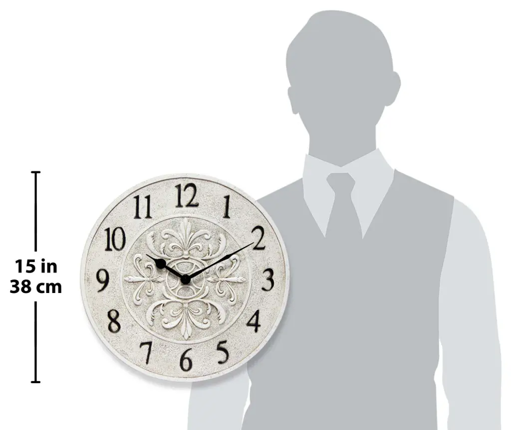 The Blanc Fleur indoor/outdoor clock from Infinity Instruments is proof that clocks can have style and flair. This 15" versatile wall clock has a weathered off-white finish, open-faced design, and features a raised fleur-de-lis pattern in the center. With bold Arabic numerals and hand, you can easily read the time in any outdoor space. This decorative clock is water-resistant for outdoor use.