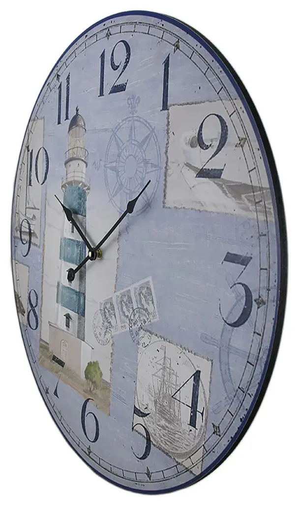 23 in. DiameterCrafted From WoodScreen Printed Clock FaceNautical and Postcard Print MotifRequires Just 1 AA Battery (not included)With a blue and white screen printed face featuring a nautical lighthouse and a postcard print motif with large, easy to read markers, this 23 inch diameter (58 cm) wooden wall clock just may be the finishing piece for your coastal, beach or nautical themed room. It requires just 1 AA battery (not included), and easily attaches to the wall using the hanger on the back. It''s a fine addition in any room, beach house or seaside cottage, and great as a gift for lighthouse lovers!
