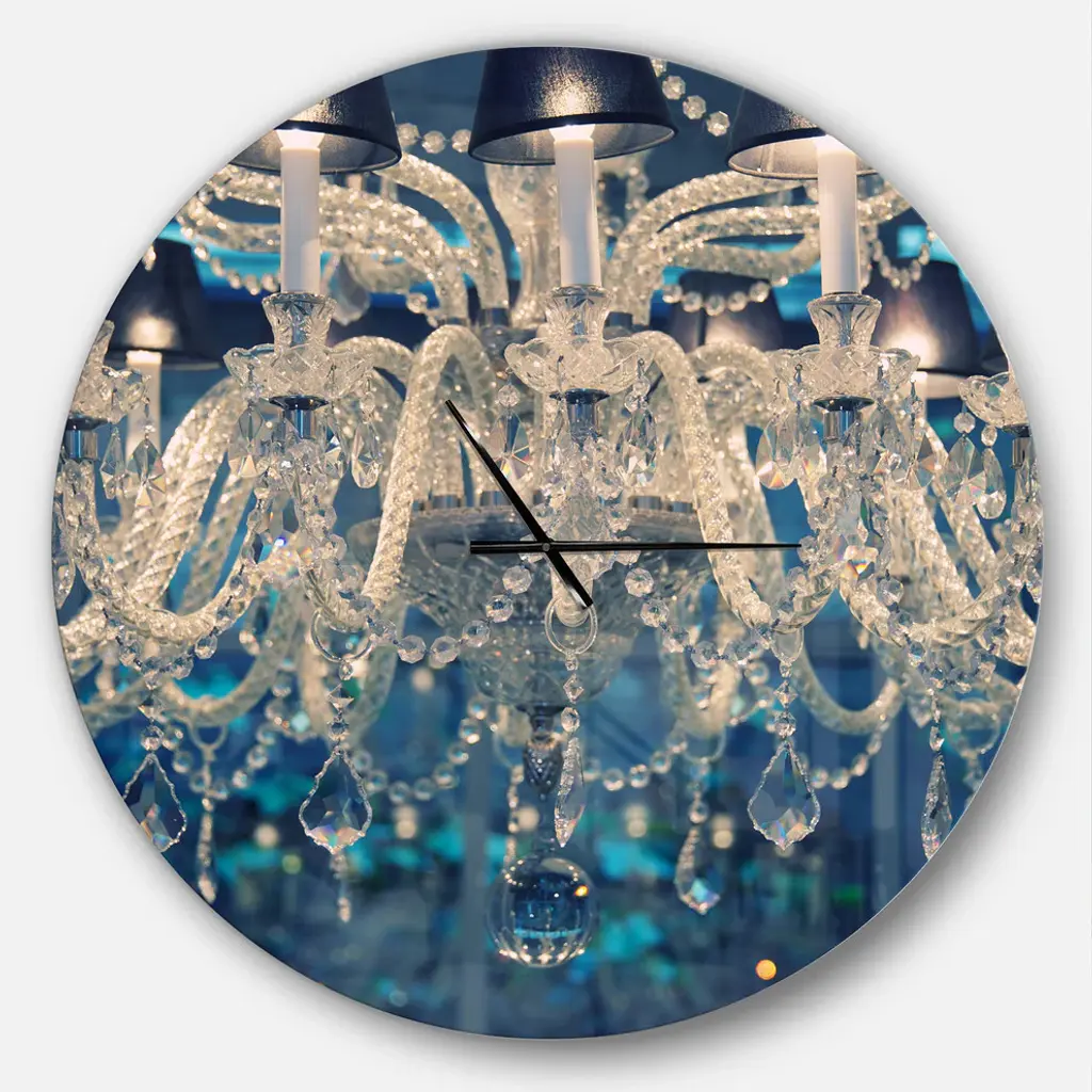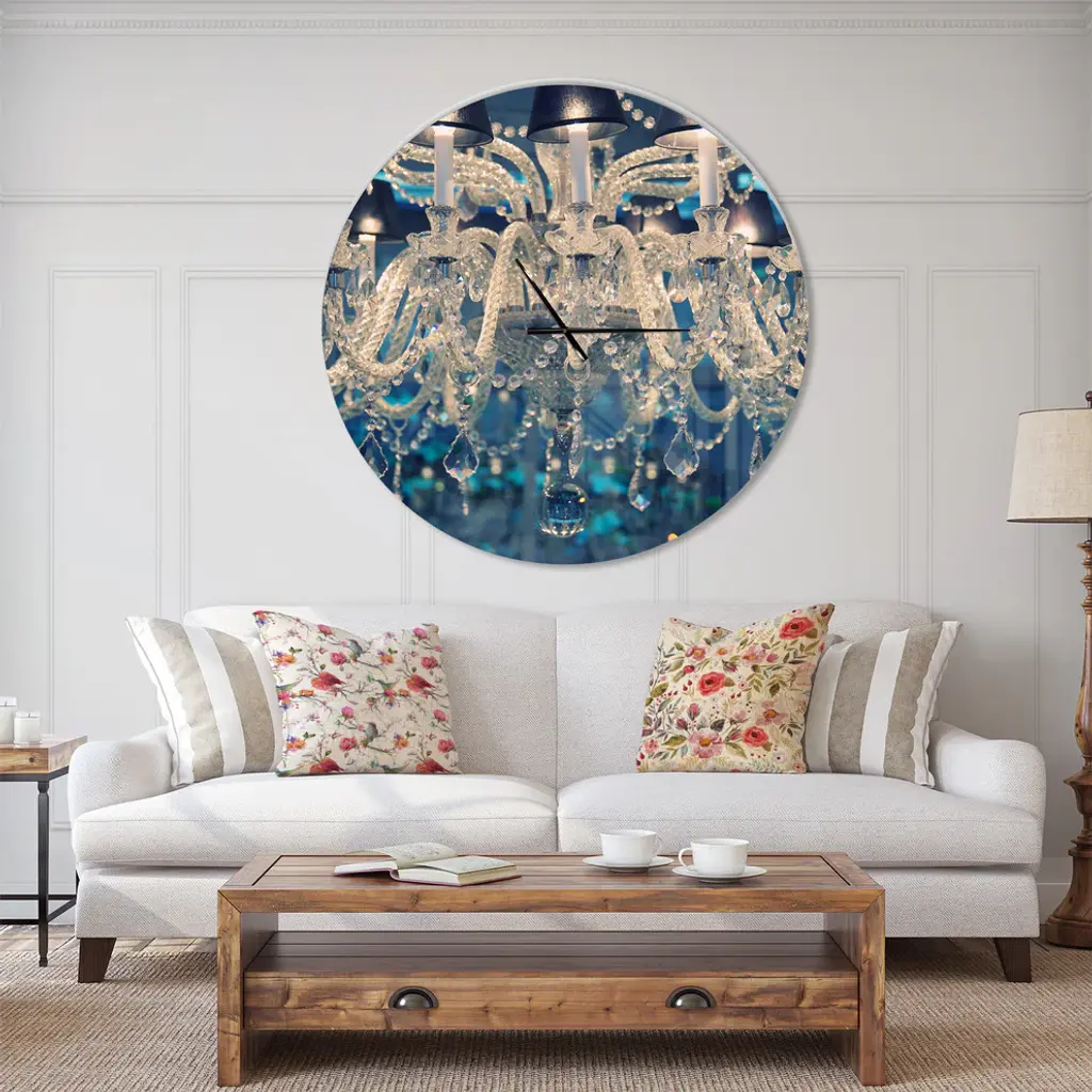 A beautiful addition to any home or office, this Shabby Chic round wall clock is made on 100% solid aluminum. It has a highly reflective glossy finish creating a sleek modern look. This Blue Vintage Crystal Chandelier wall clock arrives completely ready to hang on the wall. Simply insert the �AAA� battery included with your order.Available in several size, this Modern Oversized Clock makes it the focal point of any room.Features - Ultra Gloss Coating ensures colors are extra vibrant with light reflection. - 1mm Aluminum grade sheet metal. - 1-inch mounting frame gives the illusion of artwork floating on the wall. - Mounting brackets and instructions are included. - High quality digital images are created directly into a glossy aluminum panel, producing a stunning and captivating print in the glossy finish of the metal. - Looks better than any photo paper and guaranteed to last at least 20 years. - Easy to clean with a microfiber cloth. - "AAA" battery included with your order. - Easy to hang. - Style: Shabby Chic - Material: Metal - Shape: RoundSee Options drop down for available sizes.