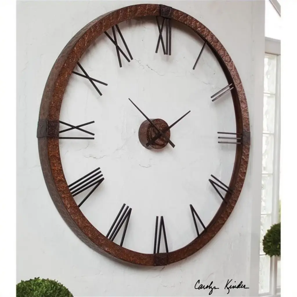 With the advanced product engineering and packaging reinforcement, Bowery Hill maintains some of the lowest damage rates in the industry. Each product is designed, manufactured and packaged with shipping in mind. Bowery Hill''s clocks combine premium quality materials with unique high-style design.This oversized clock features hammered copper sheeting with a light gray wash and aged black details. Center hands movement is separate from the outside frame.Features: • Designer: Carolyn Kinder • Hammered copper sheeting with a light gray wash and aged black details • Center hands movement is separate from the outside frame • Material: Metal • Uses one AA battery • Some assembly requiredSpecifications: • Product Dimensions: 60.25" H x 60.25" W x 4.25" D • Product Weight: 29 lbs. • Recommended Location: Indoor