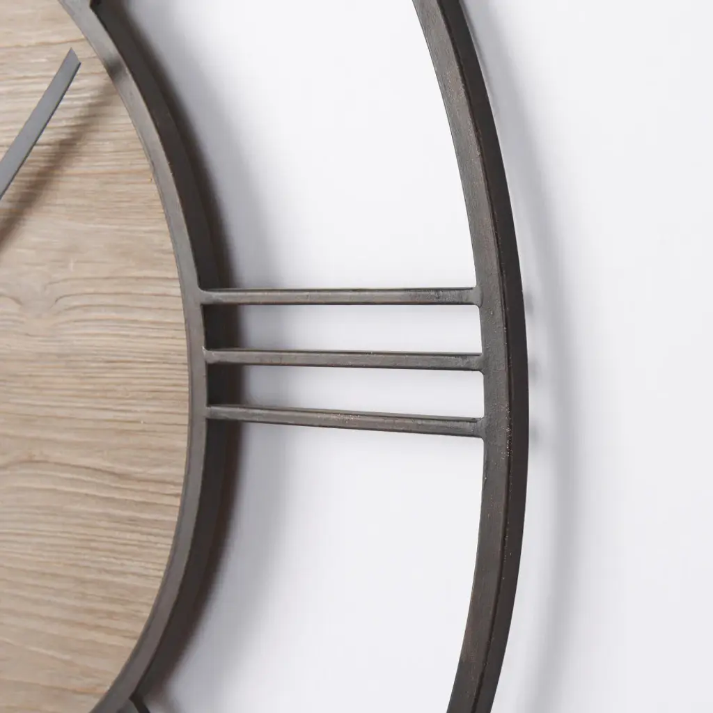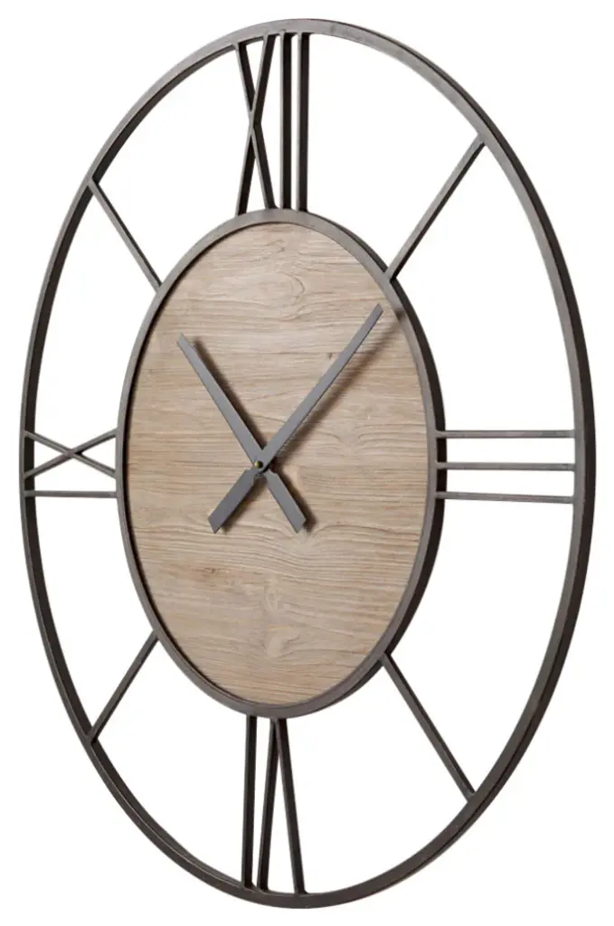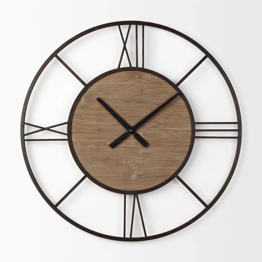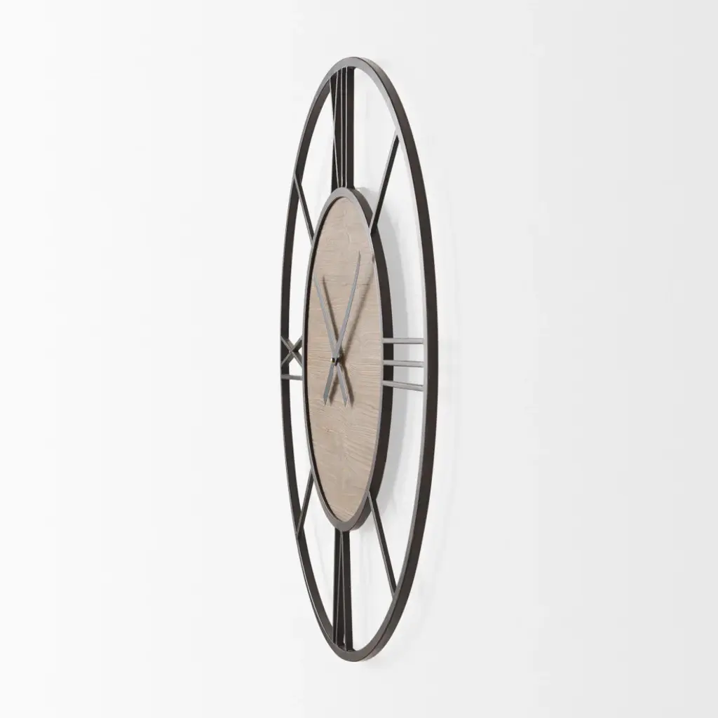This classic style wall clock features an open design with large, cut-out Roman Numerals encircled by a solid iron frame. The Roman Numerals are constructed from iron, and the center dial contrasts with wood.Brielle''s DimensionsThe Brielle clock measures 29.9L x 2.1W x 29.9H. Solid Wood and MetalThis classic style wall clock features an open design with large, cut-out Roman Numerals encircled by a solid iron frame. The Roman Numerals are constructed from iron, and the center dial contrasts with wood. Light Brown and Black FinishThe wood is smooth textured in a light brown finish that lets the natural color and grain show through. The iron elements feature an unfussy, matte black finish. Farmhouse Inspired DesignThe Brielle is a beautiful combination of classic elements and modern style - perfect for farmhouse living!