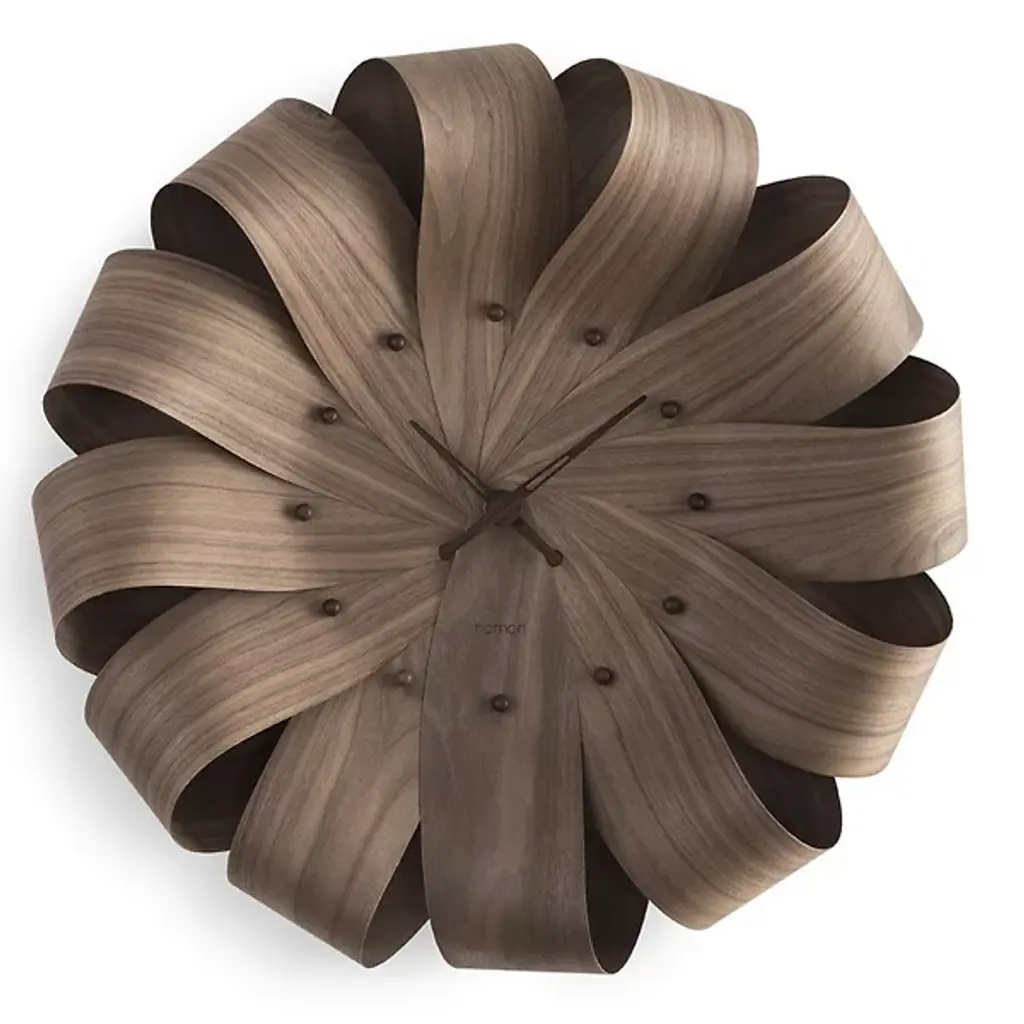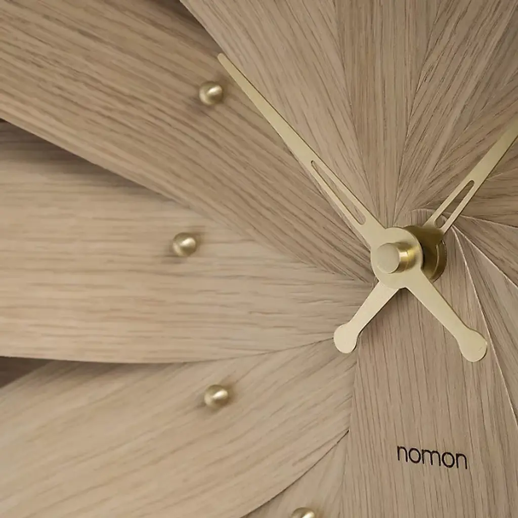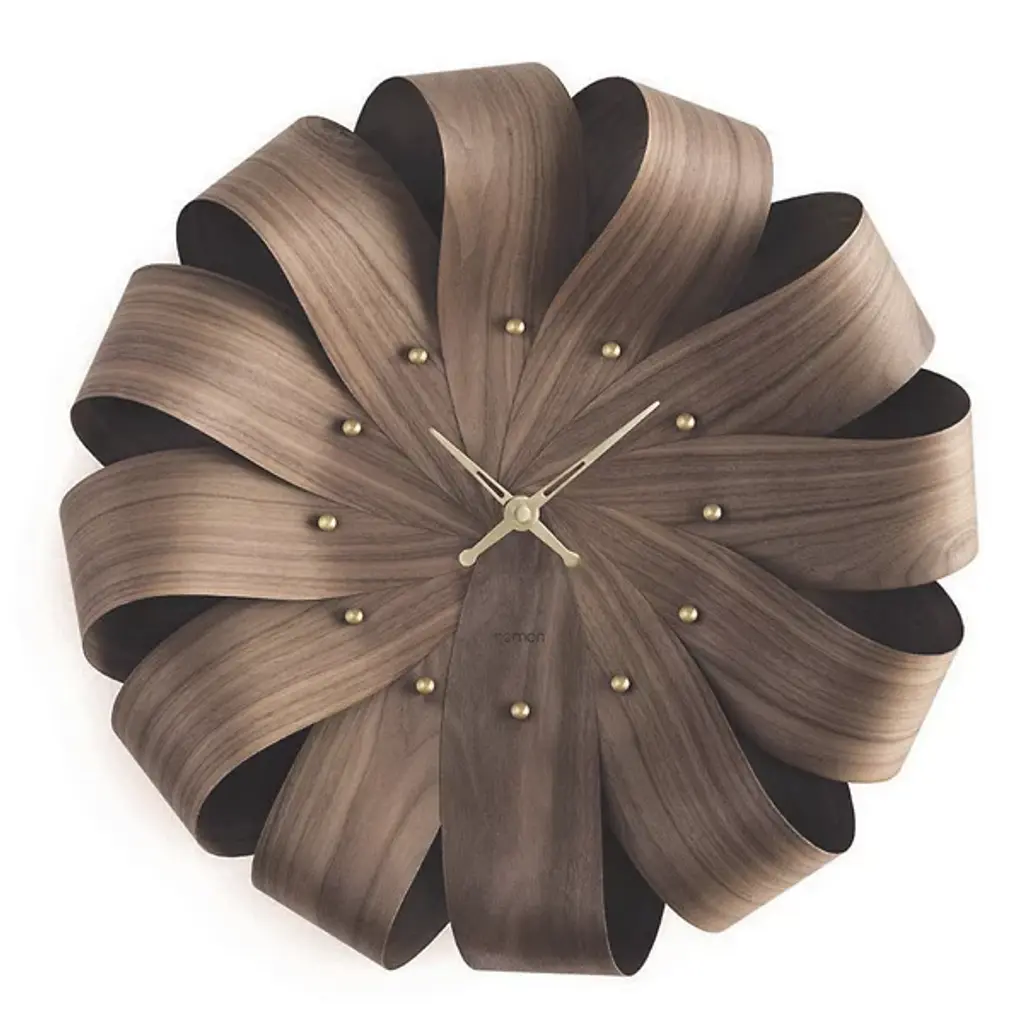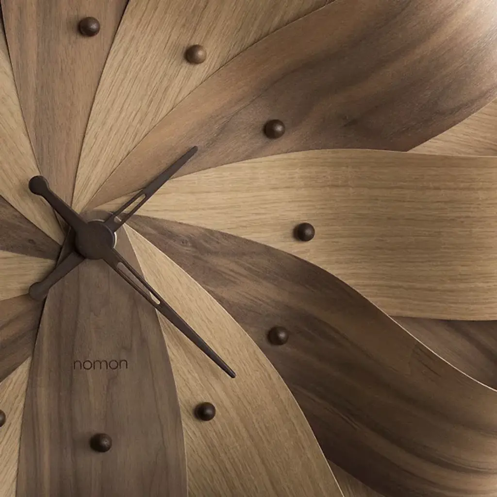 Add a fluid organic note to the room with the enchanting Brisa Wall Clock from Nomon. It's an Andres Martinez design made in Spain. Slim ribbons of bent wood swirl out from a central point, while small brass studs circle around slender clock hands to mark the hours. The time-telling metal accents contrast nicely with the textured grain of the natural wood. The ribbons bend into shadow-filled scoops that elegantly offset its rich, highlighted exterior texture.