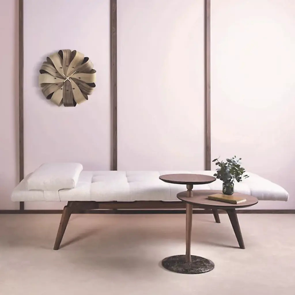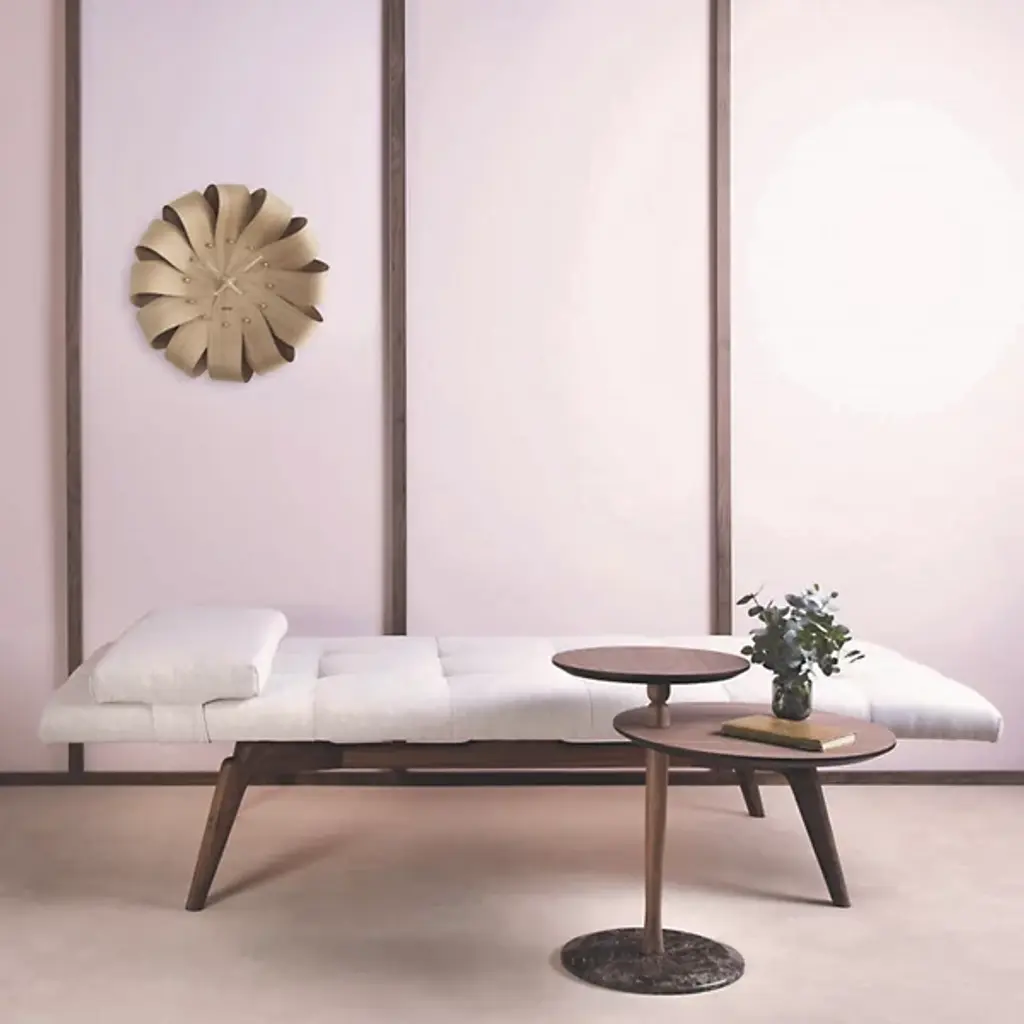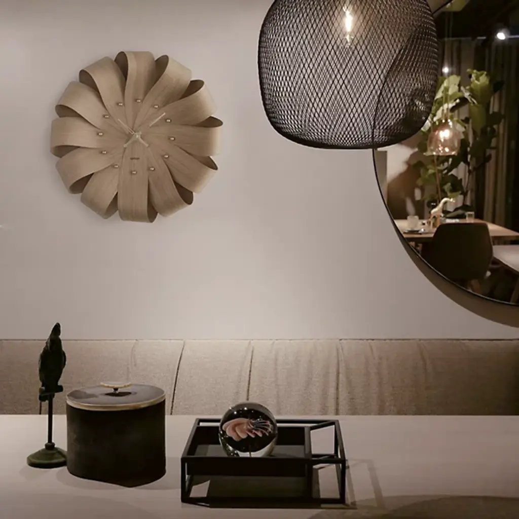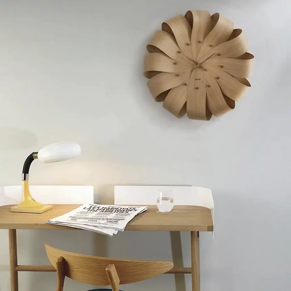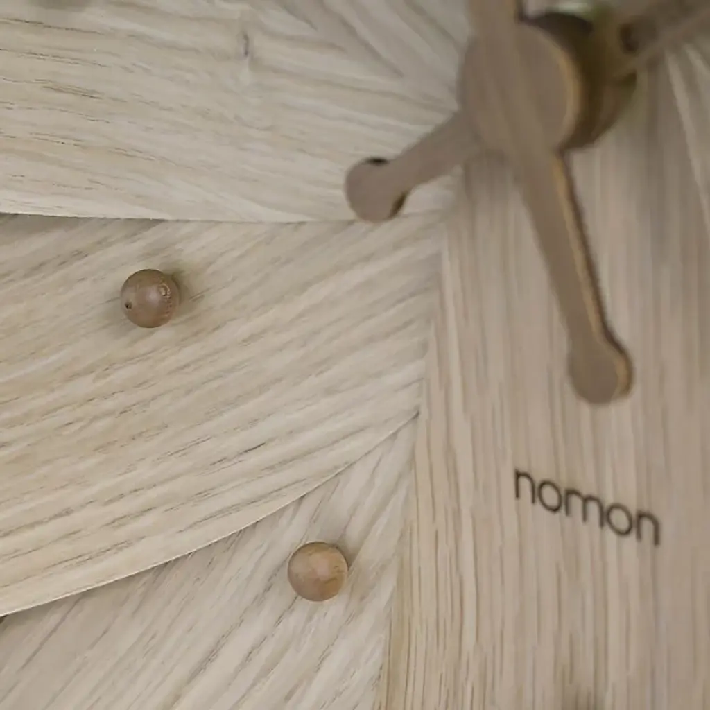 Add a fluid organic note to the room with the enchanting Brisa Wall Clock from Nomon. It's an Andres Martinez design made in Spain. Slim ribbons of bent wood swirl out from a central point, while small brass studs circle around slender clock hands to mark the hours. The time-telling metal accents contrast nicely with the textured grain of the natural wood. The ribbons bend into shadow-filled scoops that elegantly offset its rich, highlighted exterior texture.