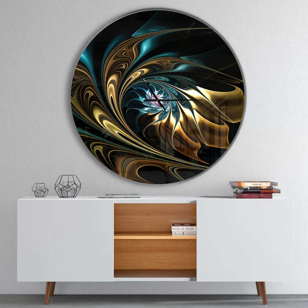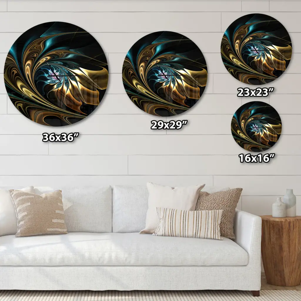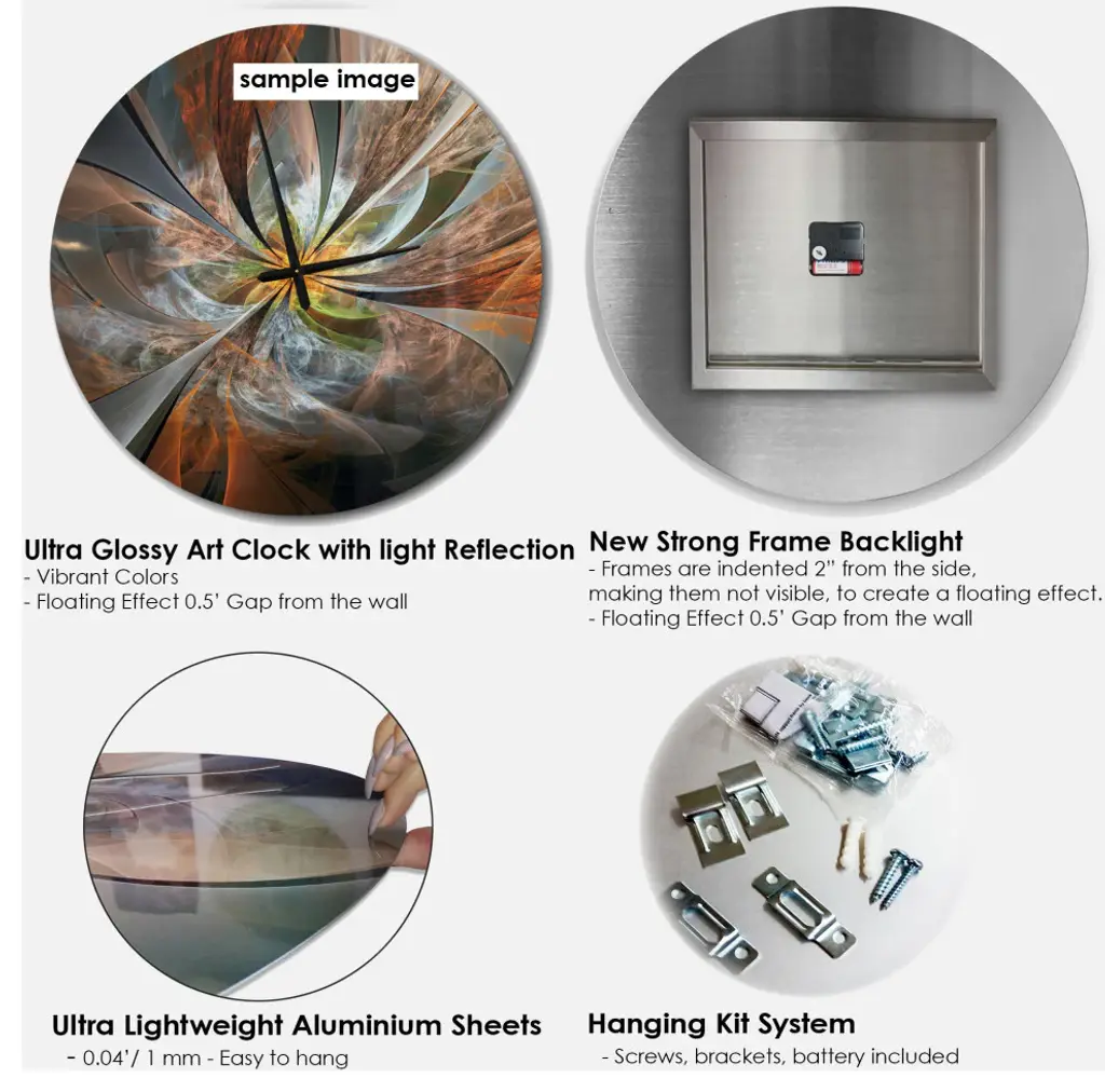 A beautiful addition to any home or office, this Modern & Contemporary round wall clock is made on 100% solid aluminum. It has a highly reflective glossy finish creating a sleek modern look. This Brown Blue Fractal Flower in Black wall clock arrives completely ready to hang on the wall. Simply insert the �AAA� battery included with your order.Available in several size, this Modern Oversized Clock makes it the focal point of any room.Features - Ultra Gloss Coating ensures colors are extra vibrant with light reflection. - 1mm Aluminum grade sheet metal. - 1-inch mounting frame gives the illusion of artwork floating on the wall. - Mounting brackets and instructions are included. - High quality digital images are created directly into a glossy aluminum panel, producing a stunning and captivating print in the glossy finish of the metal. - Looks better than any photo paper and guaranteed to last at least 20 years. - Easy to clean with a microfiber cloth. - "AAA" battery included with your order. - Easy to hang. - Style: Modern & Contemporary - Material: Metal - Shape: RoundSee Options drop down for available sizes.