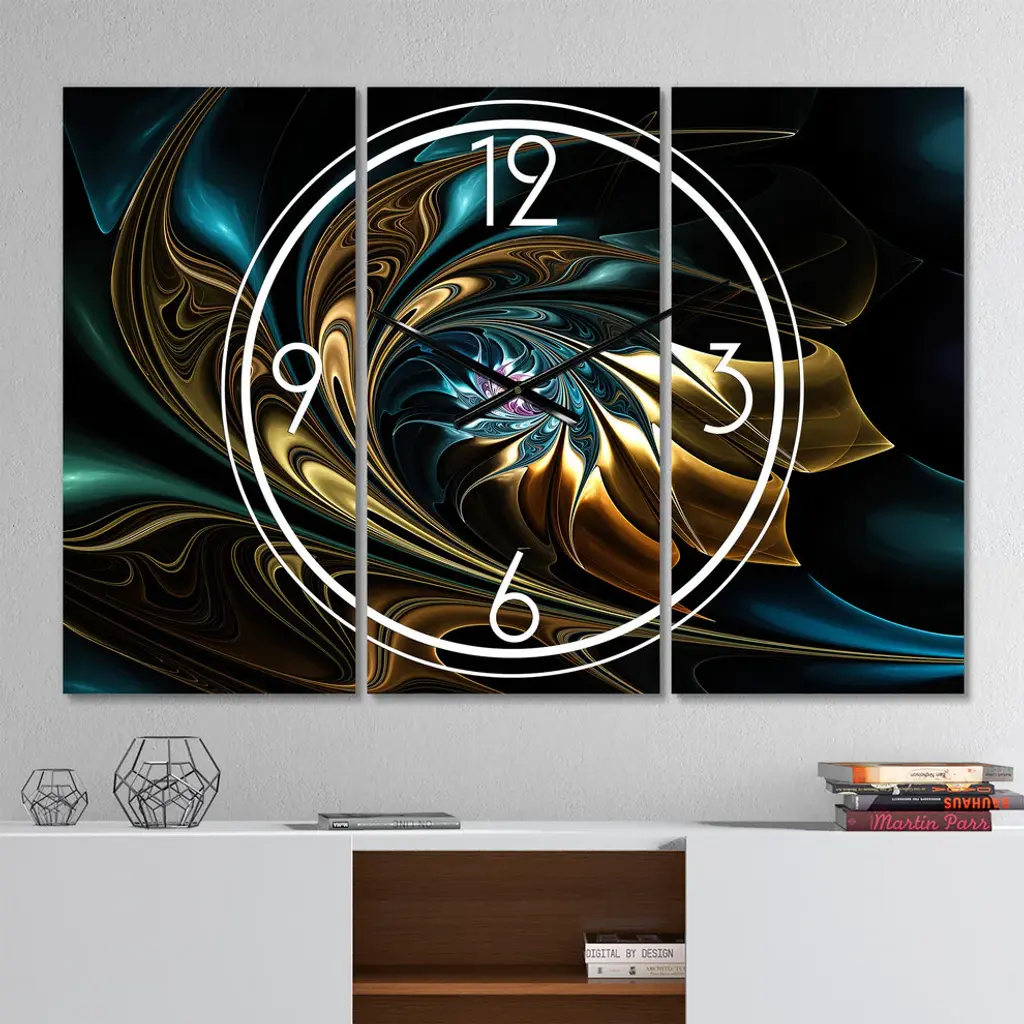 Brown Blue Fractal Flower In Black Modern Contemporary 3 Panels Clock