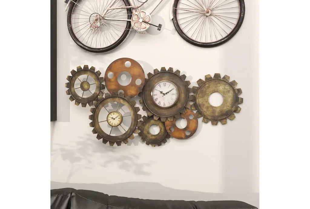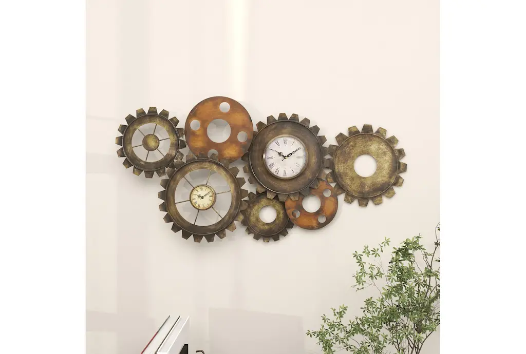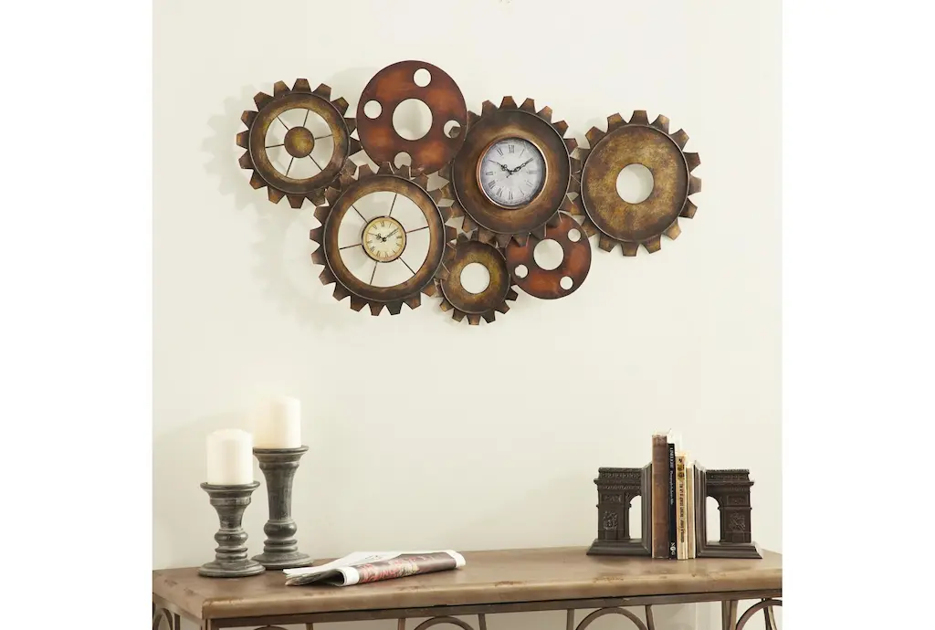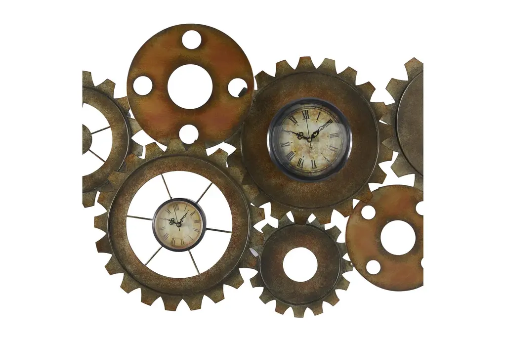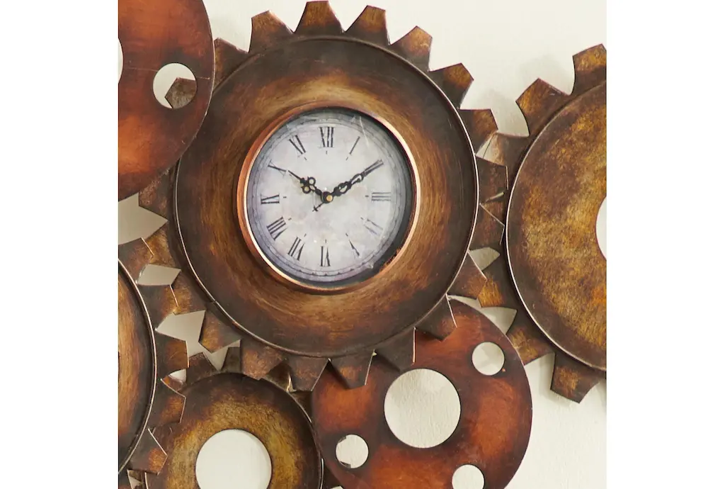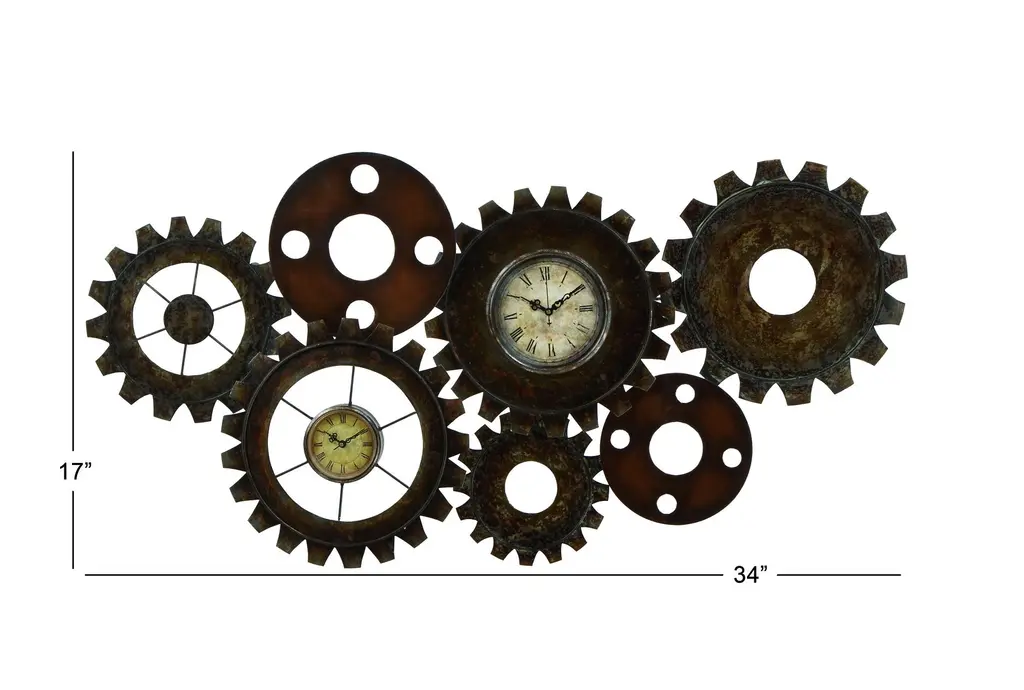 This gear clock will add some character to your industrial style inspired space when displayed on walls to complement the interior. Requires 1 AA battery. Battery not included. This item ships in 1 carton. A black roman numerals marking on white background with black clock hands. The clock mechanism runs silent. Features 2 clocks in one large industrial gear clock wall piece. Iron wall clock makes a great gift for any occasion. Can be hung vertically using the keyholes on the back; nails and screws not included. Suitable for indoor use only. This item ships fully assembled in one piece. This is a single brown colored oversized wall clock. Industrial style.