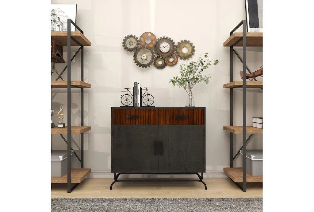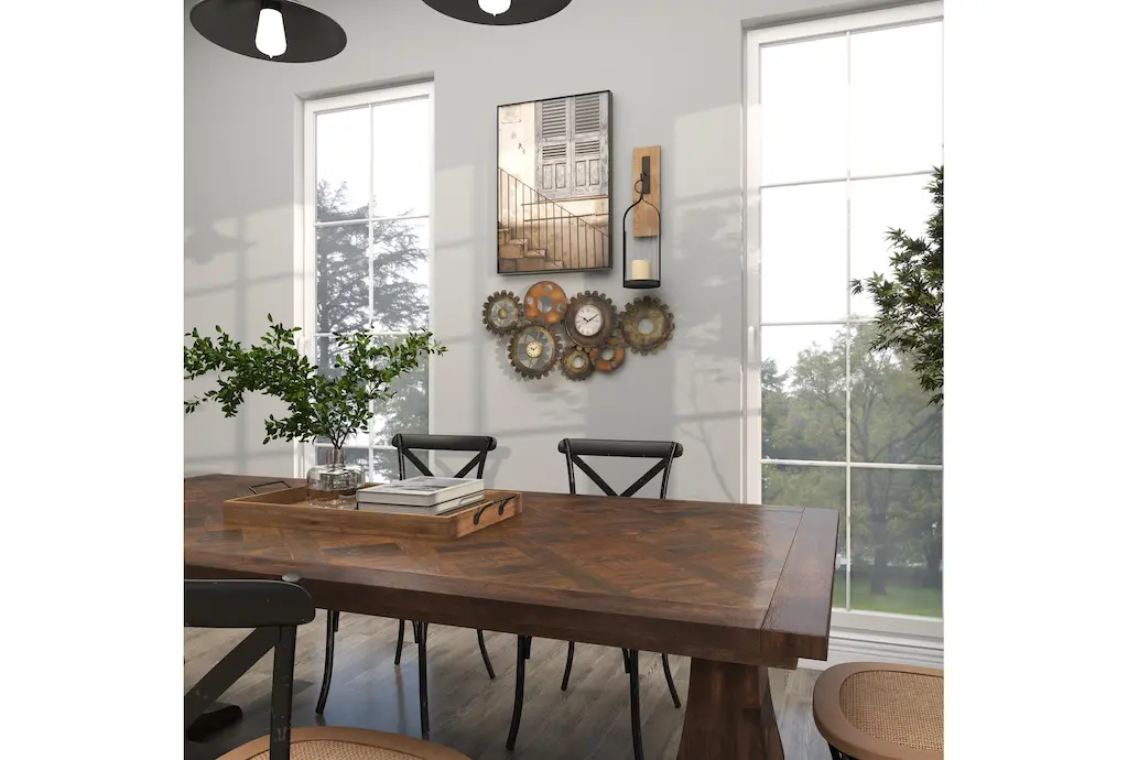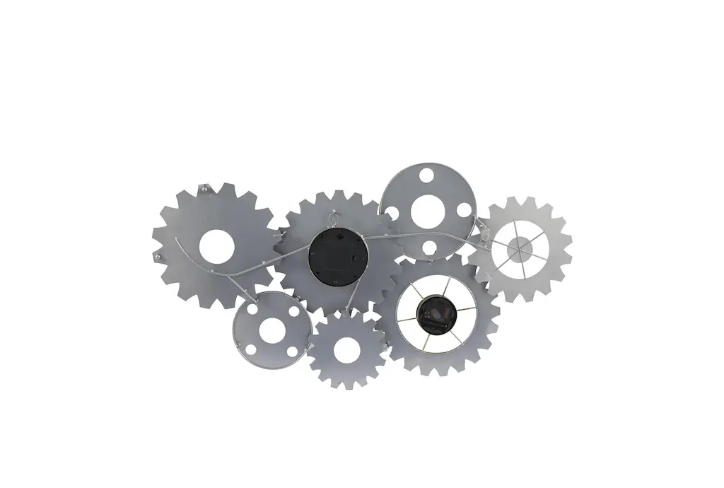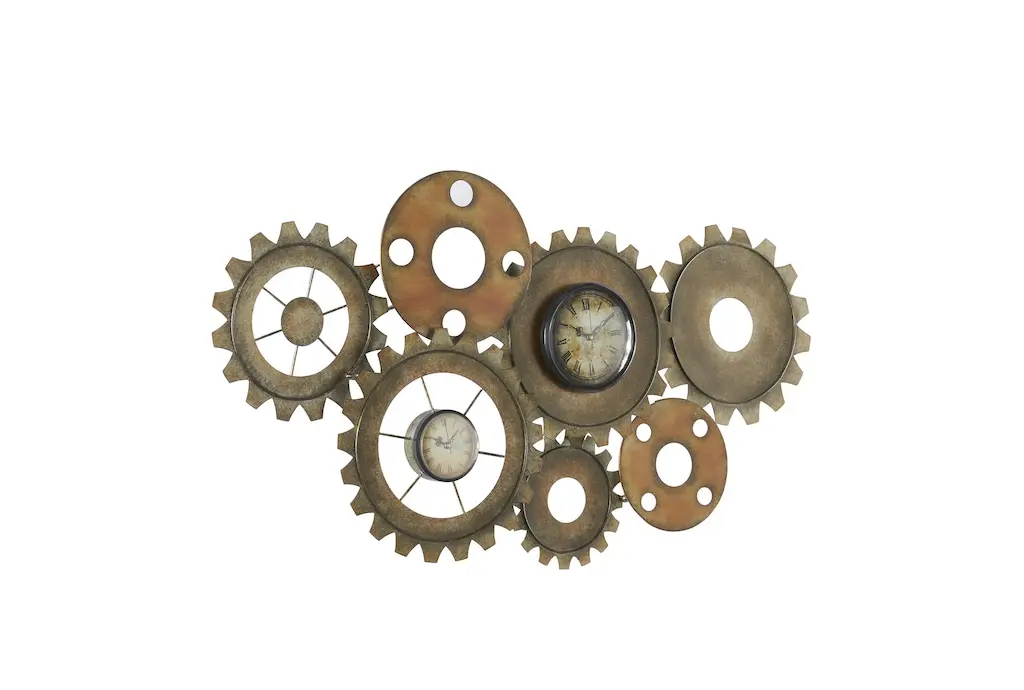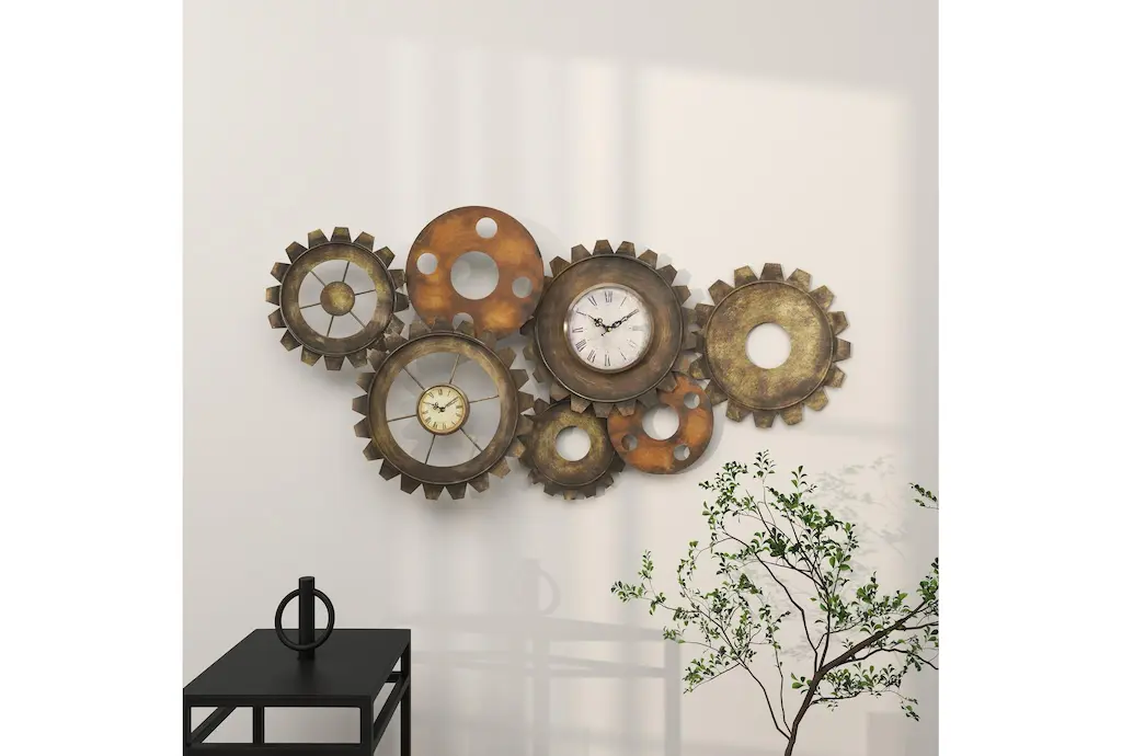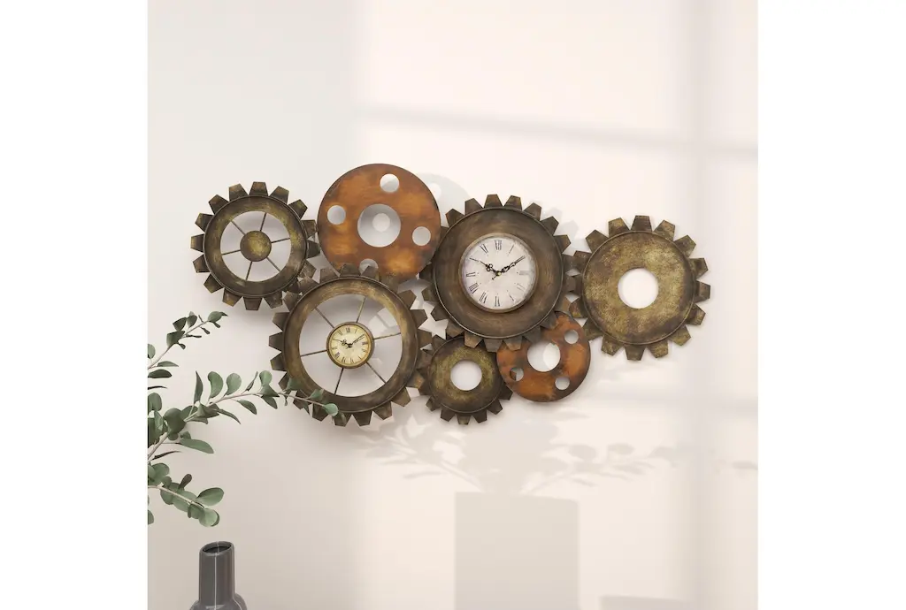 This gear clock will add some character to your industrial style inspired space when displayed on walls to complement the interior. Requires 1 AA battery. Battery not included. This item ships in 1 carton. A black roman numerals marking on white background with black clock hands. The clock mechanism runs silent. Features 2 clocks in one large industrial gear clock wall piece. Iron wall clock makes a great gift for any occasion. Can be hung vertically using the keyholes on the back; nails and screws not included. Suitable for indoor use only. This item ships fully assembled in one piece. This is a single brown colored oversized wall clock. Industrial style.