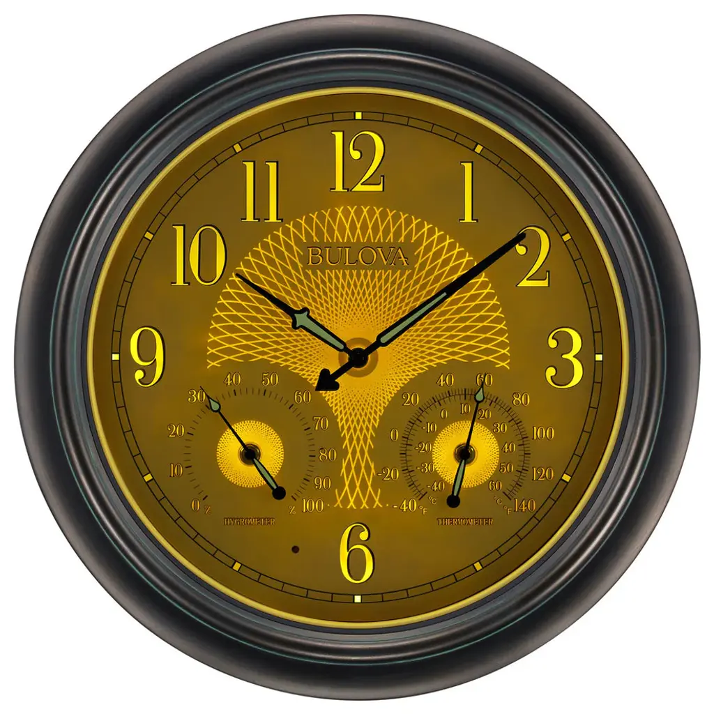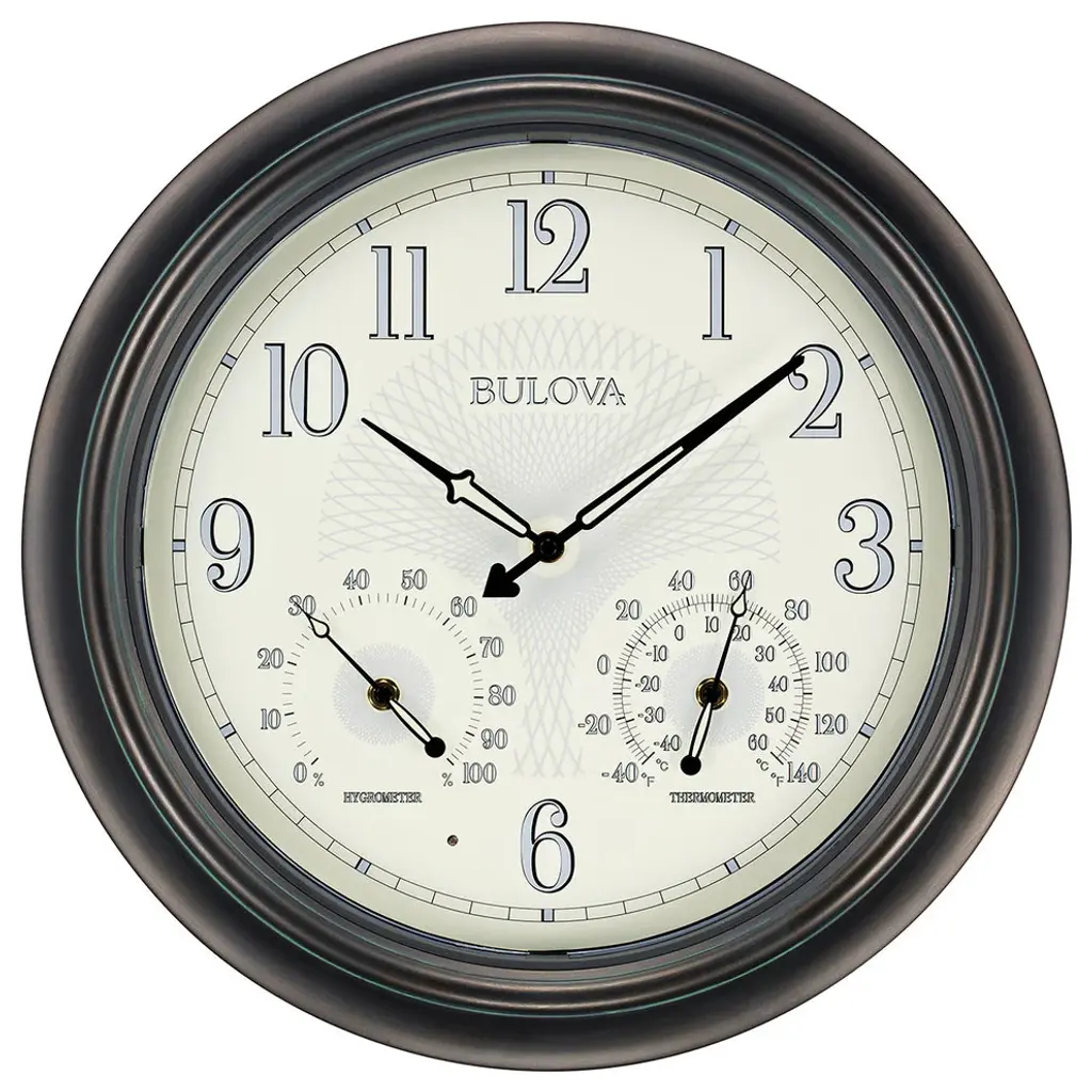 Bulova C4813 Weather Master ClockC4813 Weather MasterIlluminated outdoor wall clock with a two-step metal case in oil rubbed bronze finish. The movement is sealed with a gasket for protection from outdoor elements. Arabic numerals and instrument graphics are printed with a light reflective ink, then covered with a clear acrylic diffusing overlay. Four strategically placed battery-powered LED lights, controlled by a light-sensor, illuminate at dusk and keep the dial visible until automatically shutting off at dawn. The hour and minute hands are luminescent for 24-hour viewing. Includes a thermometer with Fahrenheit and Celsius scales and a hygrometer, both also legible at night, as well as a protective gasketed glass lens. Requires (1) AA battery for clock, (4) D batteries for LED light, not included. Dia.: 18" D: 3.25" (Dia.: 45.7 cm D: 8.2 cm)Brand:-BulovaBulova C4813 Weather Master ClockProduct Dimension W:-17.75Product Dimension L:-3.25Product Dimension H:-17.75ItemNumber#C4813Product Dimensions (W x D x H): 17.75 x 3.25 x 17.75