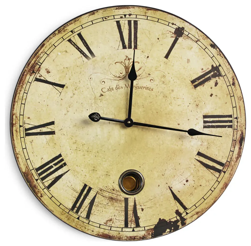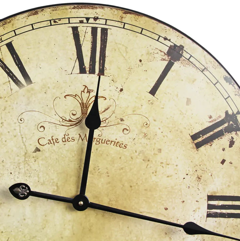 Vintage style wall clock with "Cafe des Marguerites" name and emblem at top. Features black Roman numerals and antiqued distressed white / yellow background. Smooth photo print on wood. Battery operated.