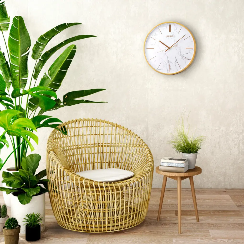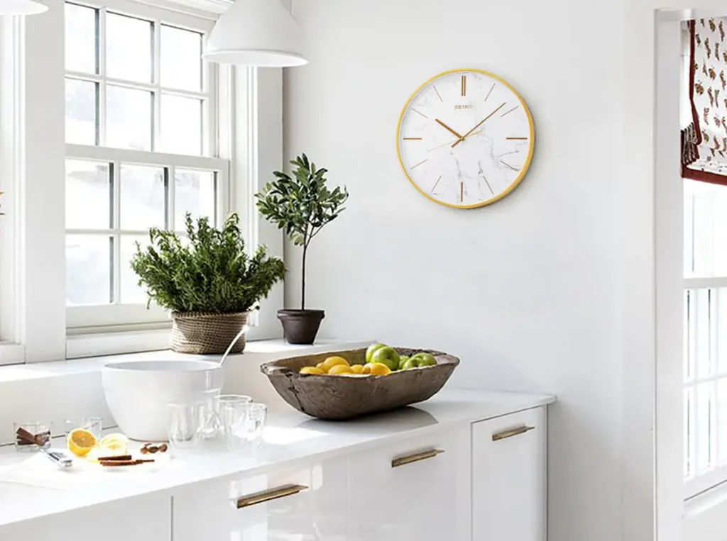 The 16" Carrara Wall clock is as elegant as its name. Evoking the look of white marble in a wall clock. Features include golden color numeral markings, quiet sweep and a glass cover.Powered by 1 AA battery (included)