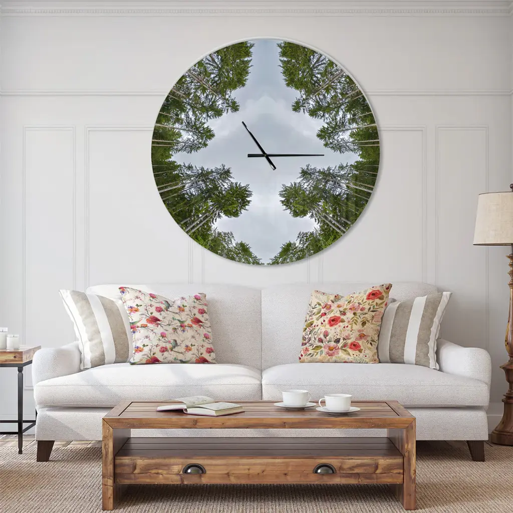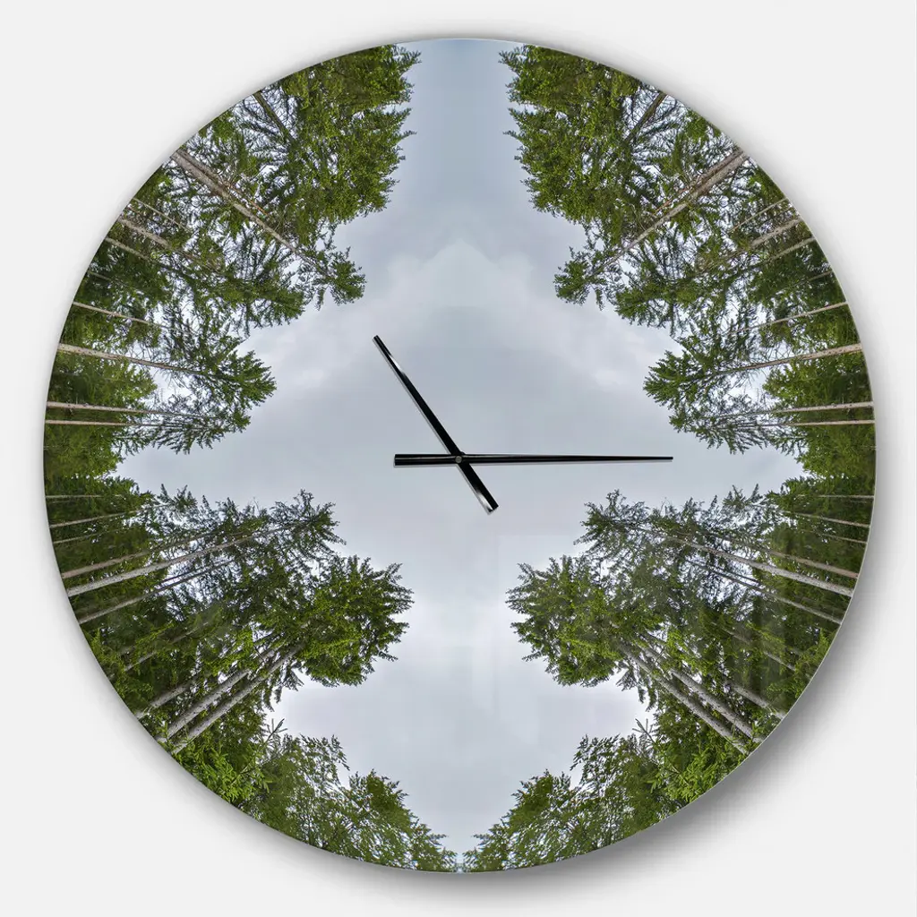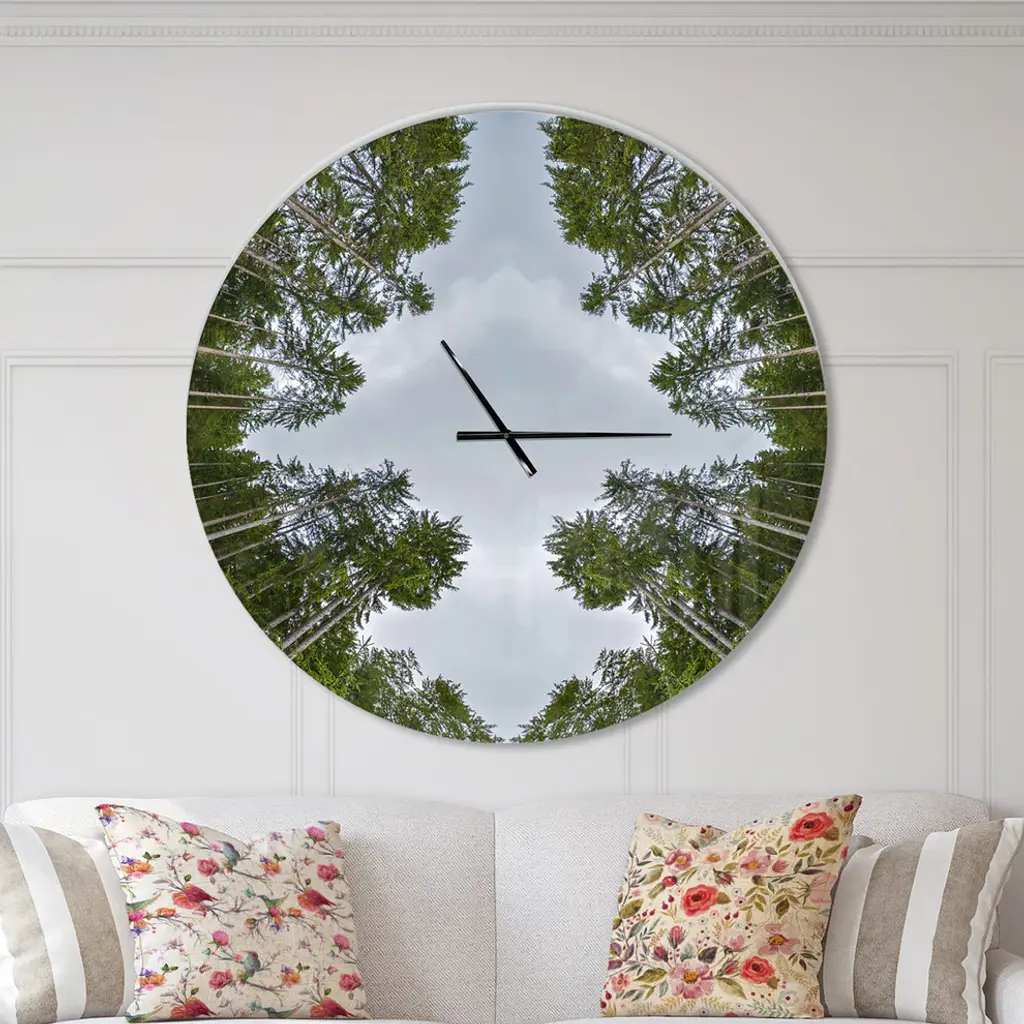 A beautiful addition to any home or office, this Modern & Contemporary round wall clock is made on 100% solid aluminum. It has a highly reflective glossy finish creating a sleek modern look. This Circle Composition of Coniferous Trees wall clock arrives completely ready to hang on the wall. Simply insert the �AAA� battery included with your order.Available in several size, this Modern Oversized Clock makes it the focal point of any room.Features - Ultra Gloss Coating ensures colors are extra vibrant with light reflection. - 1mm Aluminum grade sheet metal. - 1-inch mounting frame gives the illusion of artwork floating on the wall. - Mounting brackets and instructions are included. - High quality digital images are created directly into a glossy aluminum panel, producing a stunning and captivating print in the glossy finish of the metal. - Looks better than any photo paper and guaranteed to last at least 20 years. - Easy to clean with a microfiber cloth. - "AAA" battery included with your order. - Easy to hang. - Style: Modern & Contemporary - Material: Metal - Shape: RoundSee Options drop down for available sizes.