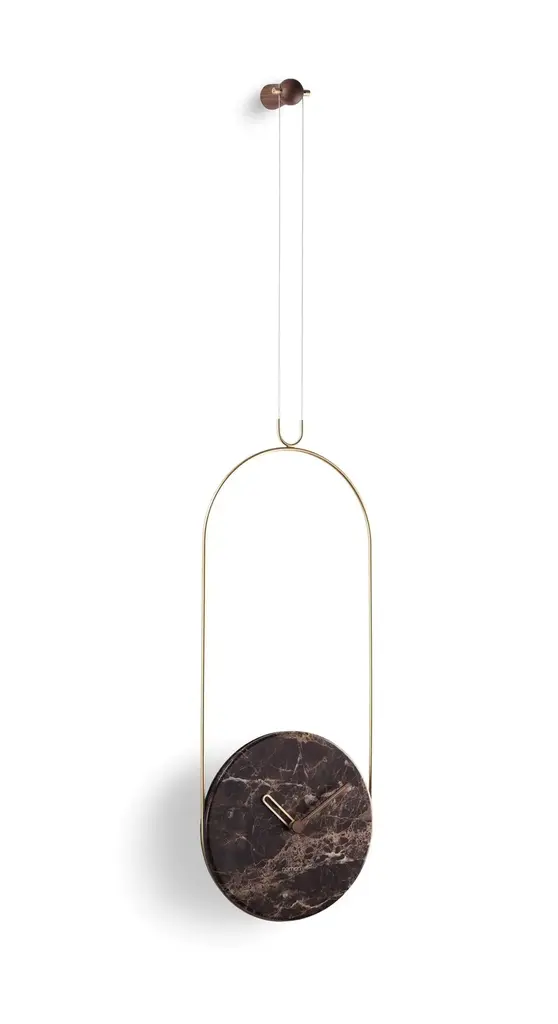 Colgante is a wall clock with Sahara Noir marble frame, walnut wood and polished metal hands, brass ring (COLGG0ME) or metal ring with black finish (COLGB0ME).Also available in the Calacatta Gold marble, Sahara Noir marble and walnut wood versions.