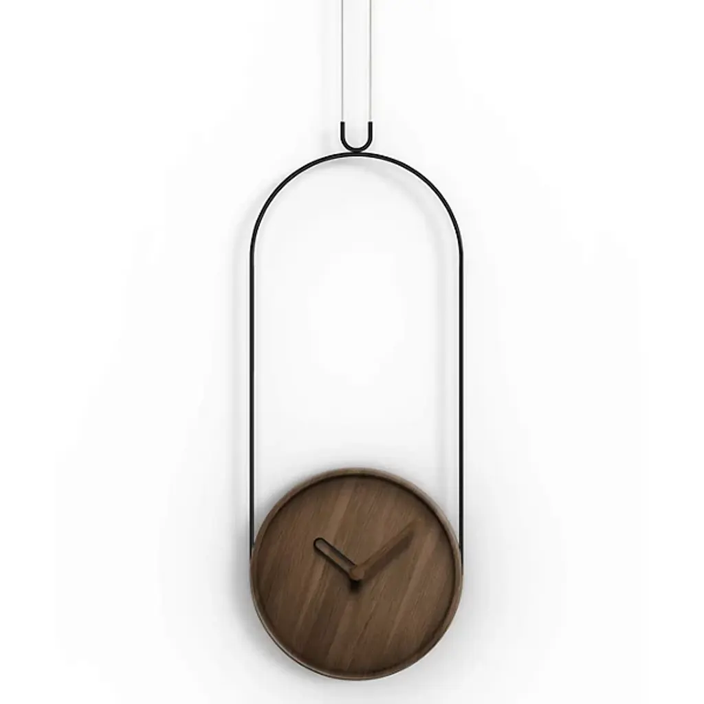 Add a decorative touch to your modern home with the Colgante Walnut Wall Clock by Nomon. From Spanish designer Andres Martinez, this minimalistic piece starts with a slim metal ring that smoothly upholds the rounded clock. Crafted from solid walnut wood, the clock presents a smooth and natural surface with matching wooden and polished metal hands adorning its face.