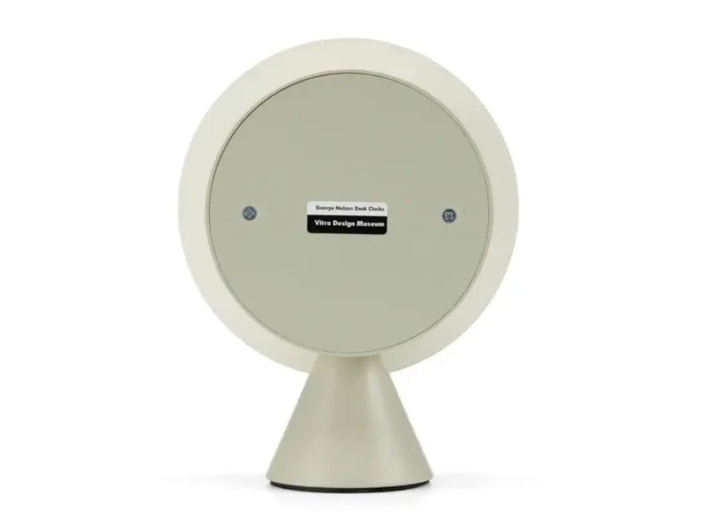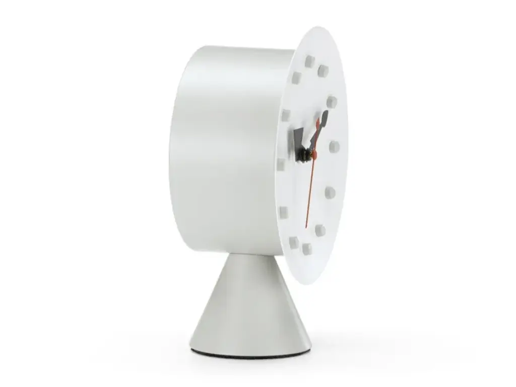 Cone Base Clock is a polyurethane table clock, part of George Nelson's Desk Clocks collection.In 1947, the American designer George Nelson was commissioned to create a collection of clocks. Nelson analysed how people used clocks and concluded that they read the time by discerning the relative position of the hands, which made the use of numbers unnecessary. Furthermore, since most people wore wristwatches, he assumed that clocks had become more of a decorative element for interiors.These ideas provided the basis for the first collection of 14 timepieces, consisting of a completely new style of wall clocks and compact table clocks, which were launched on the market in 1949. Although the models all shared one common feature – the absence of numbers – the diversity of their shapes, colours, materials and designs could hardly have been greater.In the 35 years that followed, the designers at Nelson Associates conceived more than a hundred different clock models: wall clocks, portable table clocks and built-in clocks. After Nelson’s death in 1986, his archival estate, encompassing roughly 7400 manuscripts, plans, drawings, photographs and slides dating from 1924 to 1984, was acquired by the Vitra Design Museum.Vitra began reissuing the Nelson Clocks in 1999 and updates the collection from time to time. The Desk Clocks are available in various shapes and materials. Equipped with high-quality quartz movements, they continue to offer a refreshing alternative to conventional clocks.Materials:- Materials: brass, acrylic glass, polyurethane, solid walnut.- Product contents: high-quality quartz clock movement, 1.5 volt battery included.- Origin of wood: walnut (Juglans nigra) from Western Europe and/or Poland.