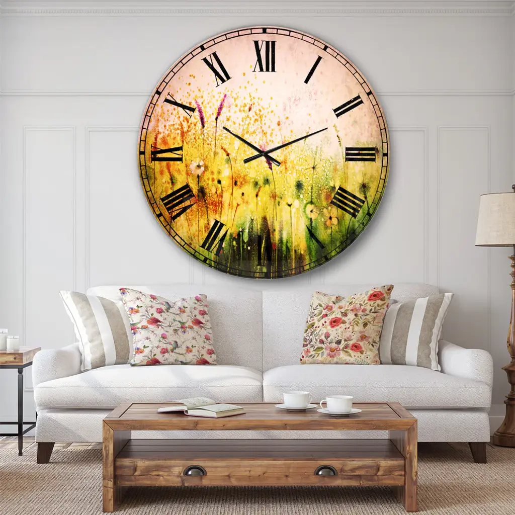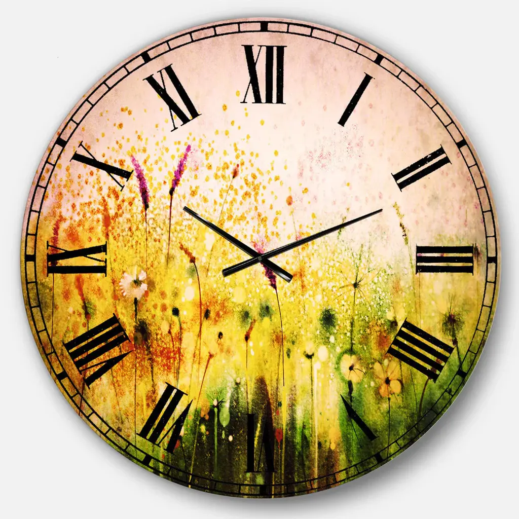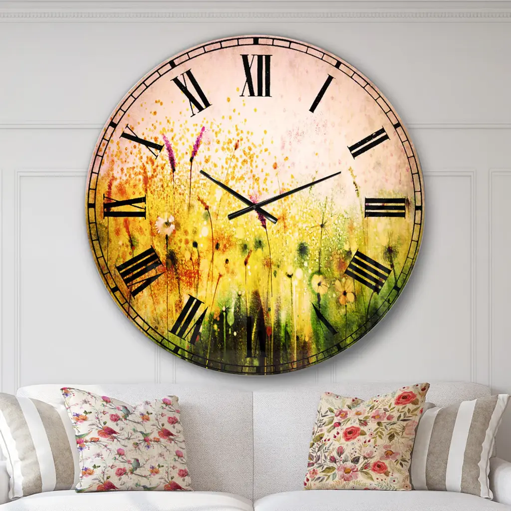 A beautiful addition to any home or office, this Traditional round wall clock is made on 100% solid aluminum. It has a highly reflective glossy finish creating a sleek modern look. This Cosmos Flowers and White Wildflowers wall clock arrives completely ready to hang on the wall. Simply insert the �AAA� battery included with your order.Available in several size, this Modern Oversized Clock makes it the focal point of any room.Features - Ultra Gloss Coating ensures colors are extra vibrant with light reflection. - 1mm Aluminum grade sheet metal. - 1-inch mounting frame gives the illusion of artwork floating on the wall. - Mounting brackets and instructions are included. - High quality digital images are created directly into a glossy aluminum panel, producing a stunning and captivating print in the glossy finish of the metal. - Looks better than any photo paper and guaranteed to last at least 20 years. - Easy to clean with a microfiber cloth. - "AAA" battery included with your order. - Easy to hang. - Style: Traditional - Material: Metal - Shape: RoundSee Options drop down for available sizes.