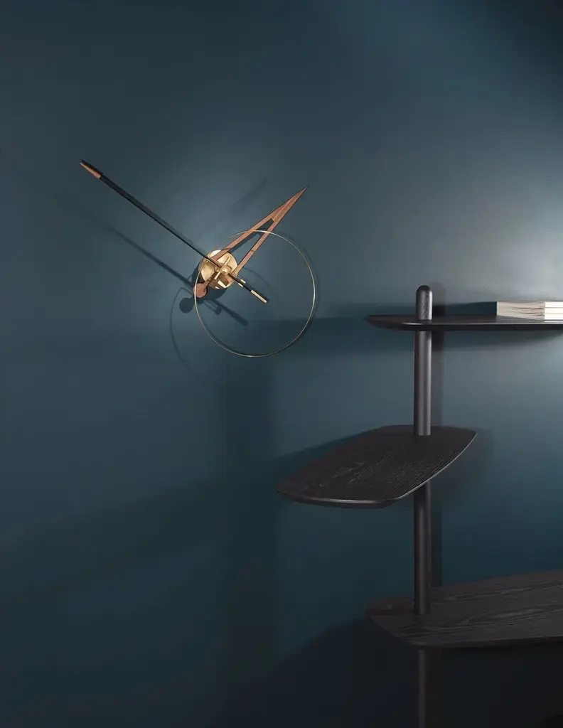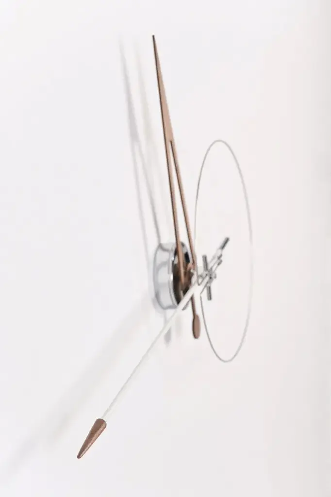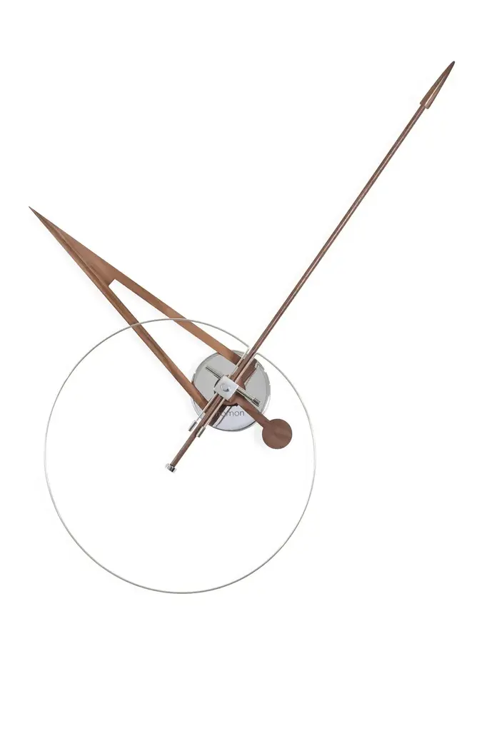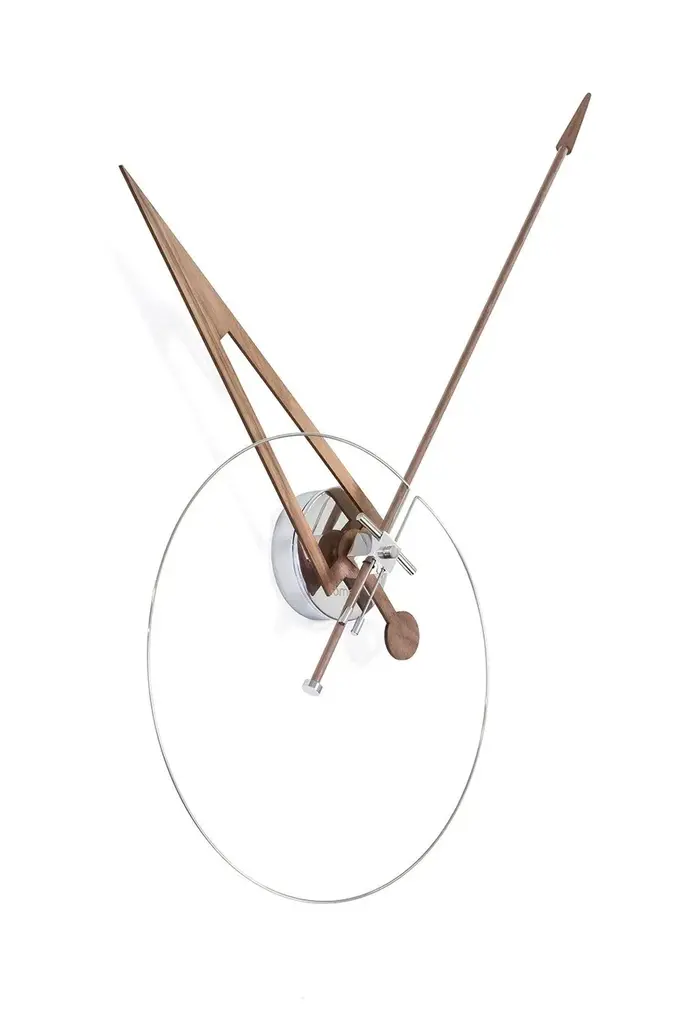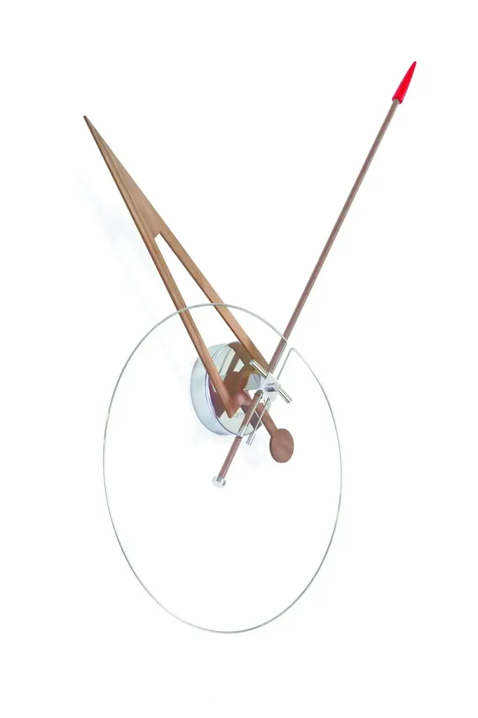 CRIS is a wooden and metal wall clock. Just like a Dadaist poem, Nomon breaks all the rules, punctuation marks and conventions. The dial flows on one side, the watch hands, different, on the other. The fine and fiberglass minute hand, is lengthened. The hour hand, on the other hand, emulates a confident, sober and resolute walnut wood arrow. Materials: Cris N: Chromed box, minute hand in walnut and red arrow (CRN00NNR);Cris N: Chromed box, minute hand white fiberglass and walnut arrow (CRN000BN);Cris G: Polished brass box, minute hand in black fiberglass and walnut arrow. (CRND00NN).