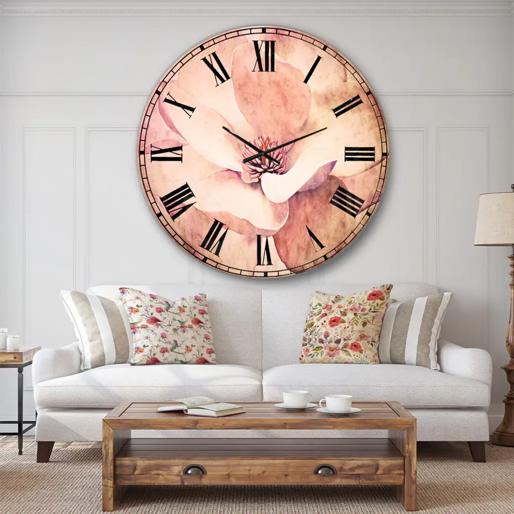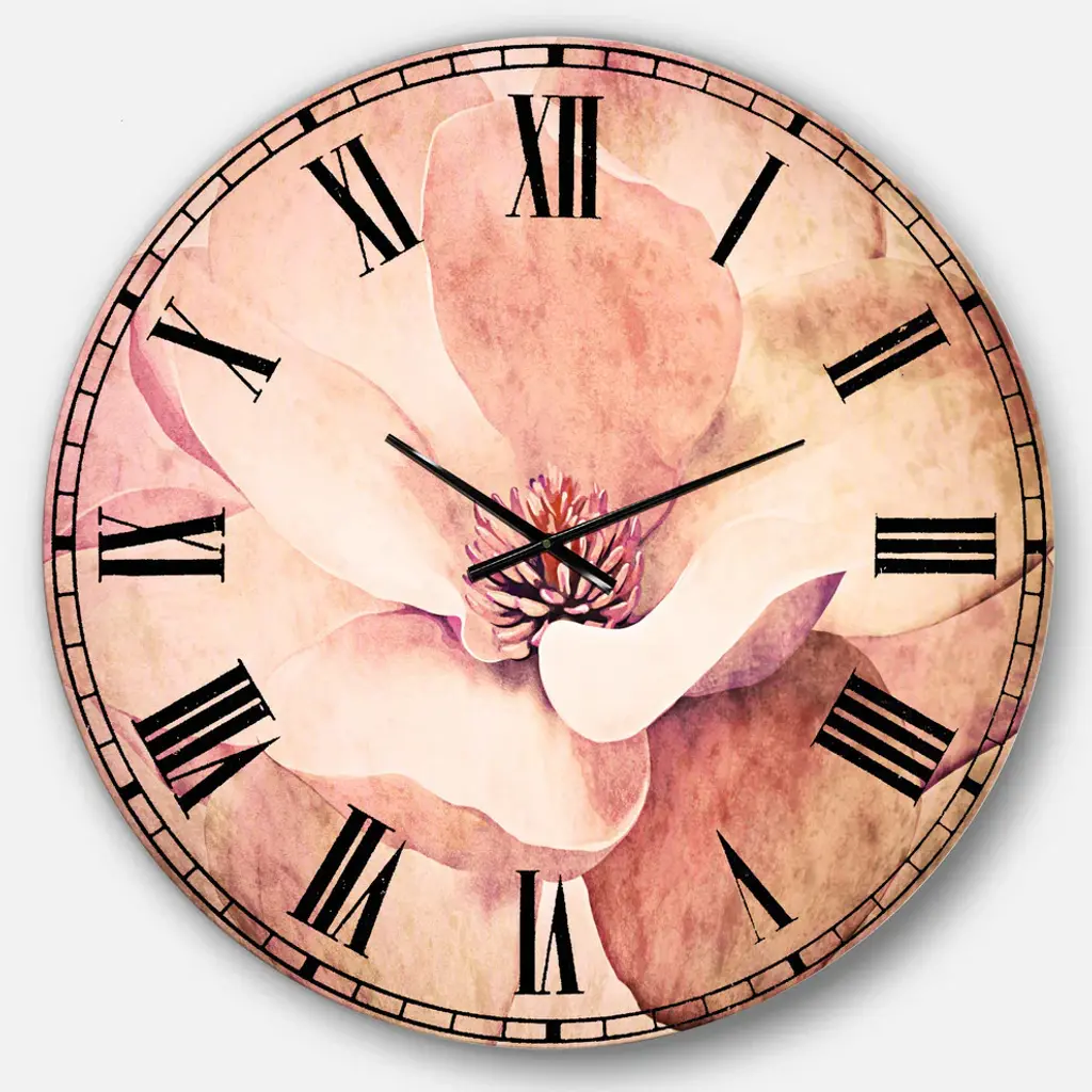 A beautiful addition to any home or office, this Traditional round wall clock is made on 100% solid aluminum. It has a highly reflective glossy finish creating a sleek modern look. This Cute Light Pink Magnolia Flower wall clock arrives completely ready to hang on the wall. Simply insert the �AAA� battery included with your order.Available in several size, this Modern Oversized Clock makes it the focal point of any room.Features - Ultra Gloss Coating ensures colors are extra vibrant with light reflection. - 1mm Aluminum grade sheet metal. - 1-inch mounting frame gives the illusion of artwork floating on the wall. - Mounting brackets and instructions are included. - High quality digital images are created directly into a glossy aluminum panel, producing a stunning and captivating print in the glossy finish of the metal. - Looks better than any photo paper and guaranteed to last at least 20 years. - Easy to clean with a microfiber cloth. - "AAA" battery included with your order. - Easy to hang. - Style: Traditional - Material: Metal - Shape: RoundSee Options drop down for available sizes.
