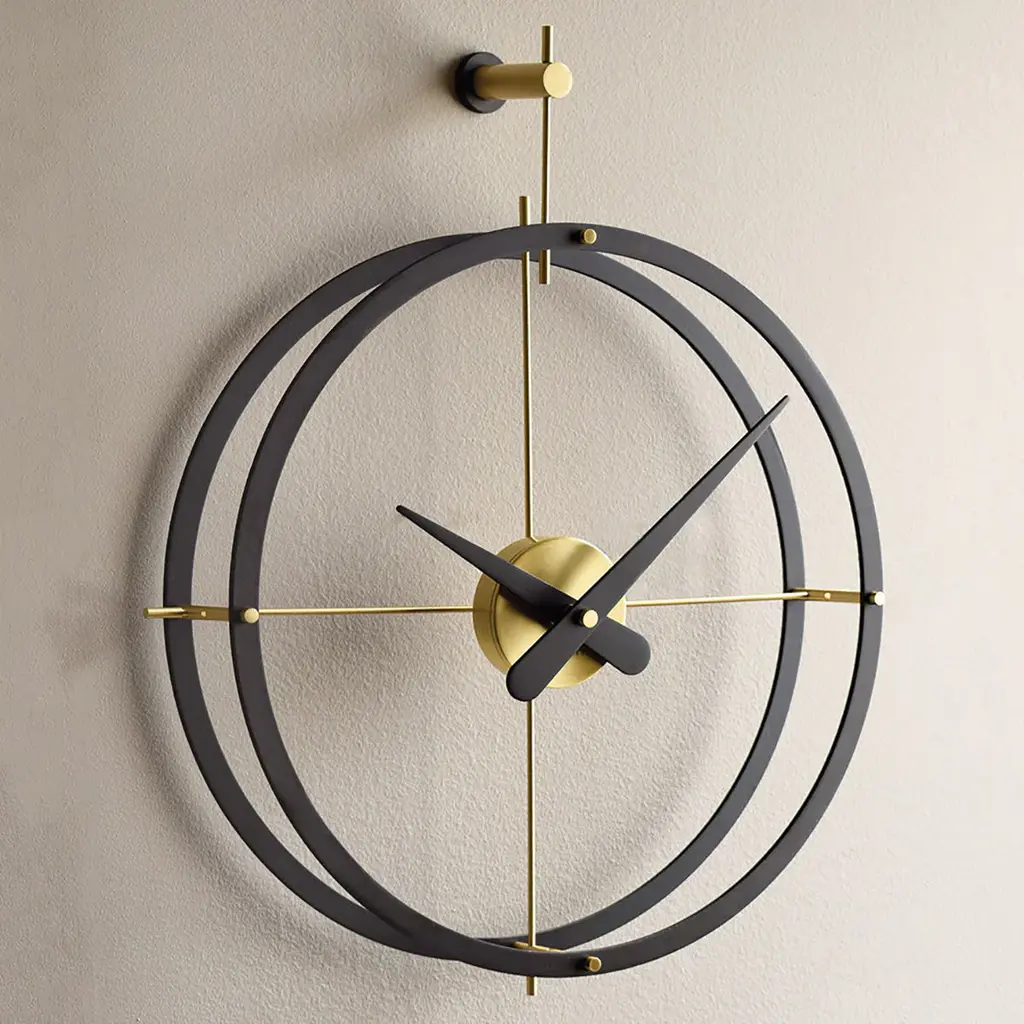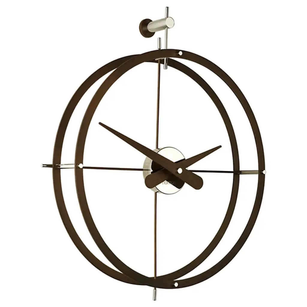 Nomon’s sleight of hand in juxtaposing luxe elements enlivens 2 Puntos, encircled by double rings with clock hands in a contrasting material. Discreetly suspended on a slim rod formation, the open face reveals the wall behind and lends its own presence to a room while offering precision timekeeping via its German quartz movement.