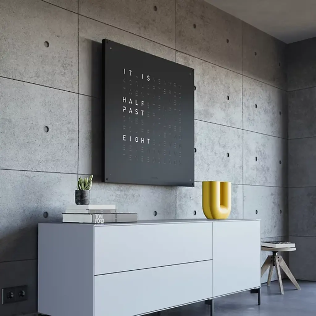 The Biegert & Funk EARTH 90 Wall Clock literally doubles the cool modern style spelled out by the original QLOCKTWO wall clock. It spans an impressive three feet, with laser cut letters in the stainless steel faceplate spelling out the time with strategic LED illumination. Choose from a range of colors and languages.