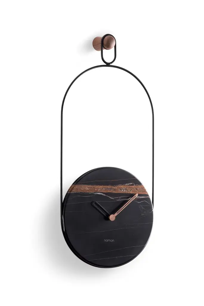 Eslabon is a wall clock distinguished with a Silver Delta Award. This model draws directly from the world of jewelry. A curved rod supports the marble or walnut wood dial, endowing it of a certain weightlessness.It also stands out for its exquisite use and combination of materials, culminating in rounded hands, each made of a different material. Eslabón is a unique piece that reinforces the know-how acquired by the design team after twenty years of history.Materials: Sahara Noir marble plate, walnut wood and polished metal hands, metal with brass or black finish circle (ESLAG0MS);Available in Calacatta Gold marble plate (ESLAG0MC) and Emperador marble version (ESLAG0ME).