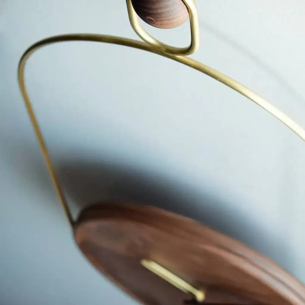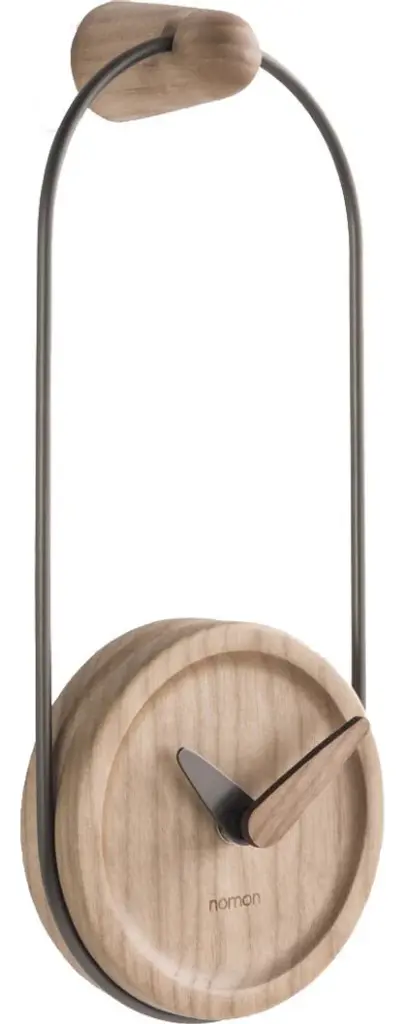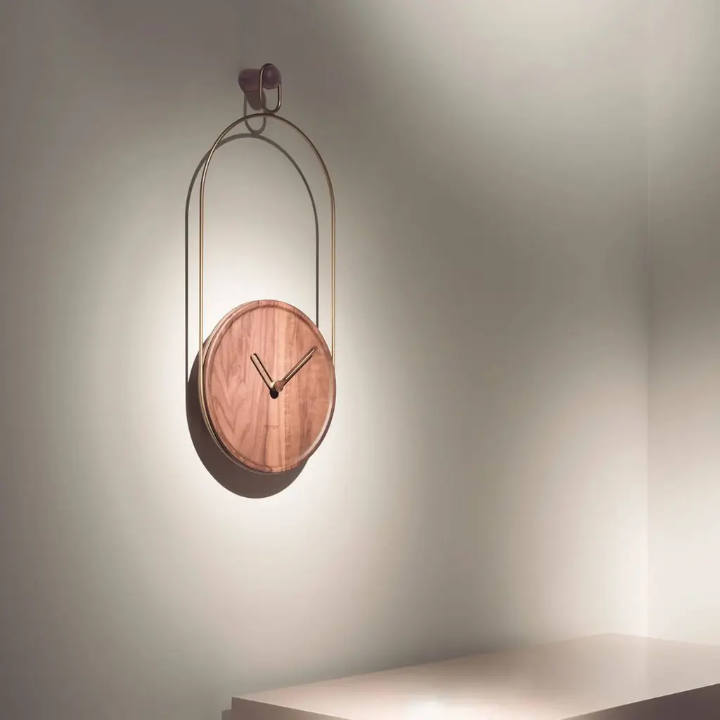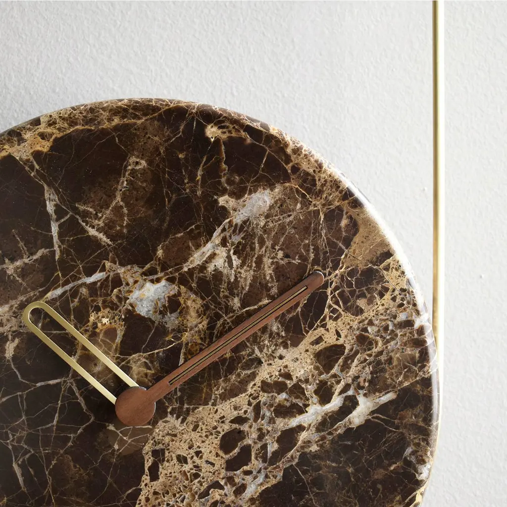In a pendulum-like suspension, Eslabón presents a luxurious face in rich walnut or opulent marble with time-telling hands in contrasting wood and metal. Designer Andres Martinez' wall clock features an oval metal framework in matte brass or black and is precision-crafted with a UTS quartz works by Spanish maker Nomon.