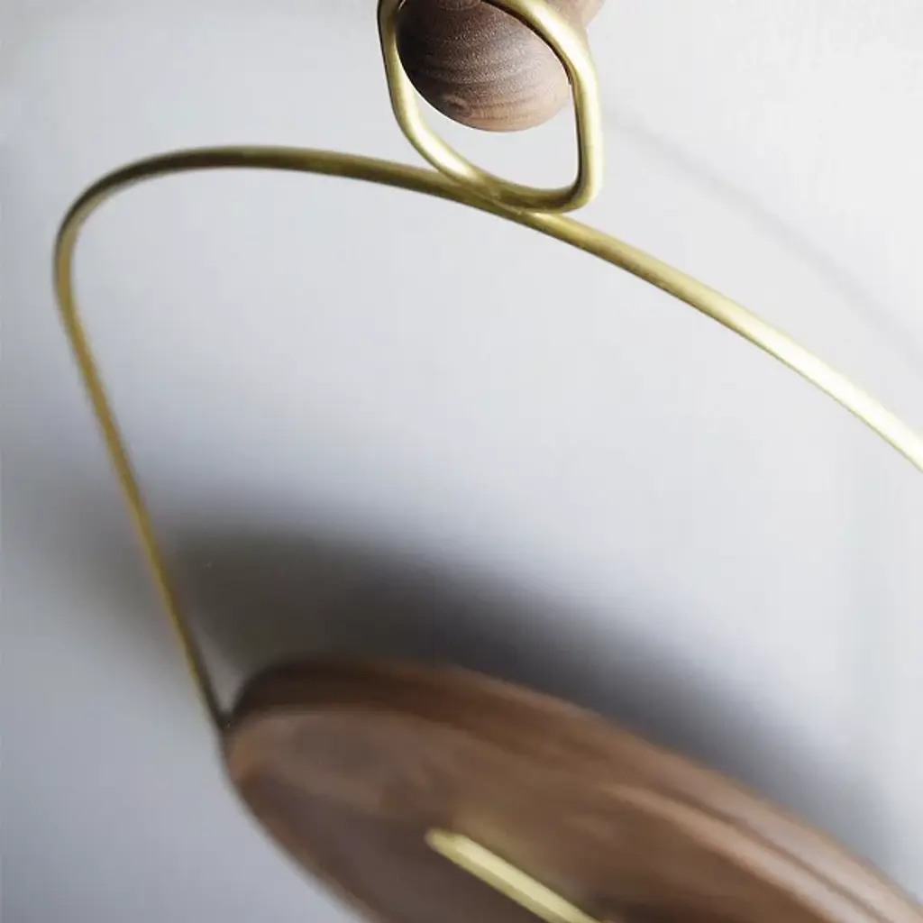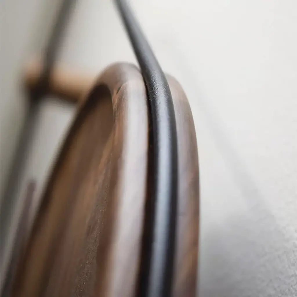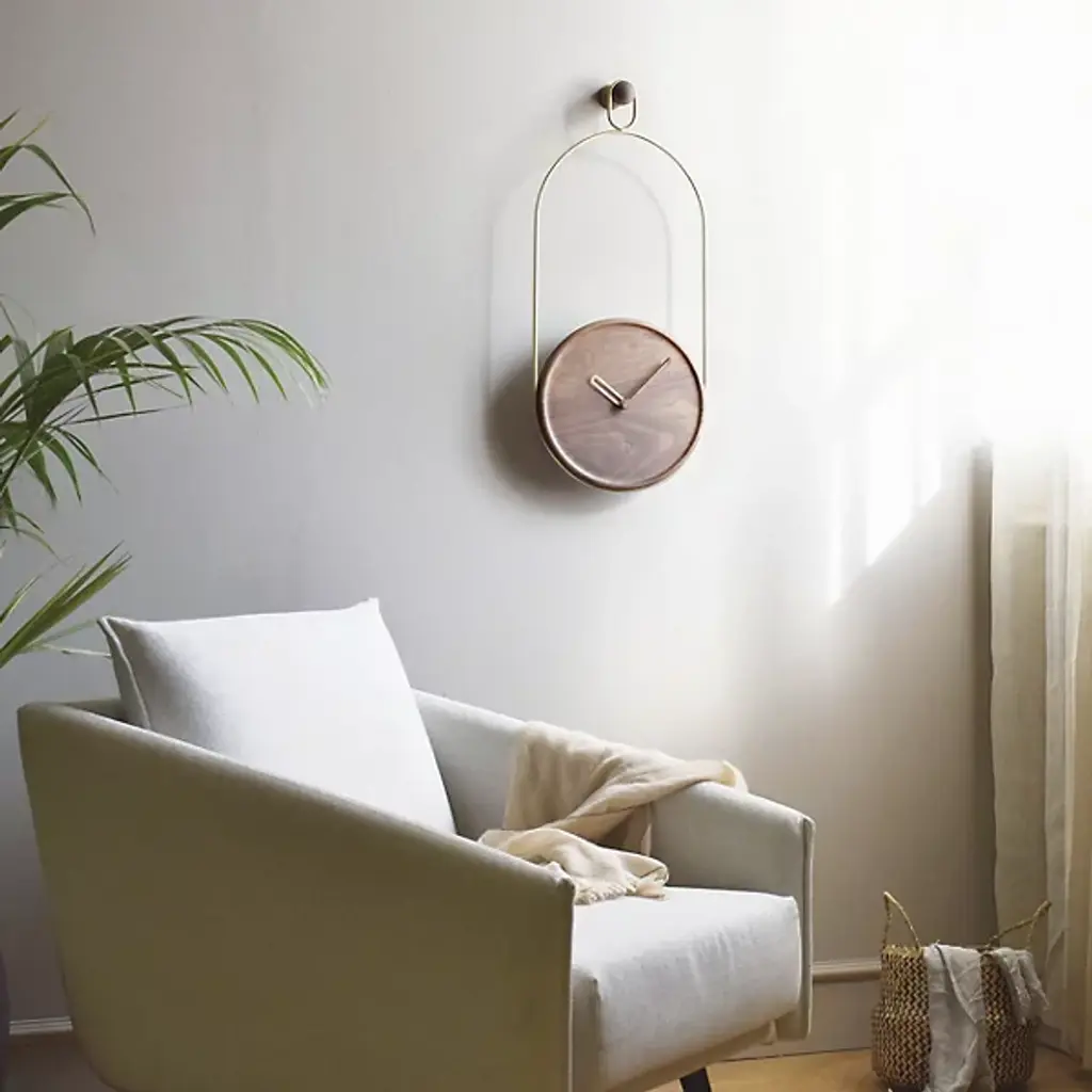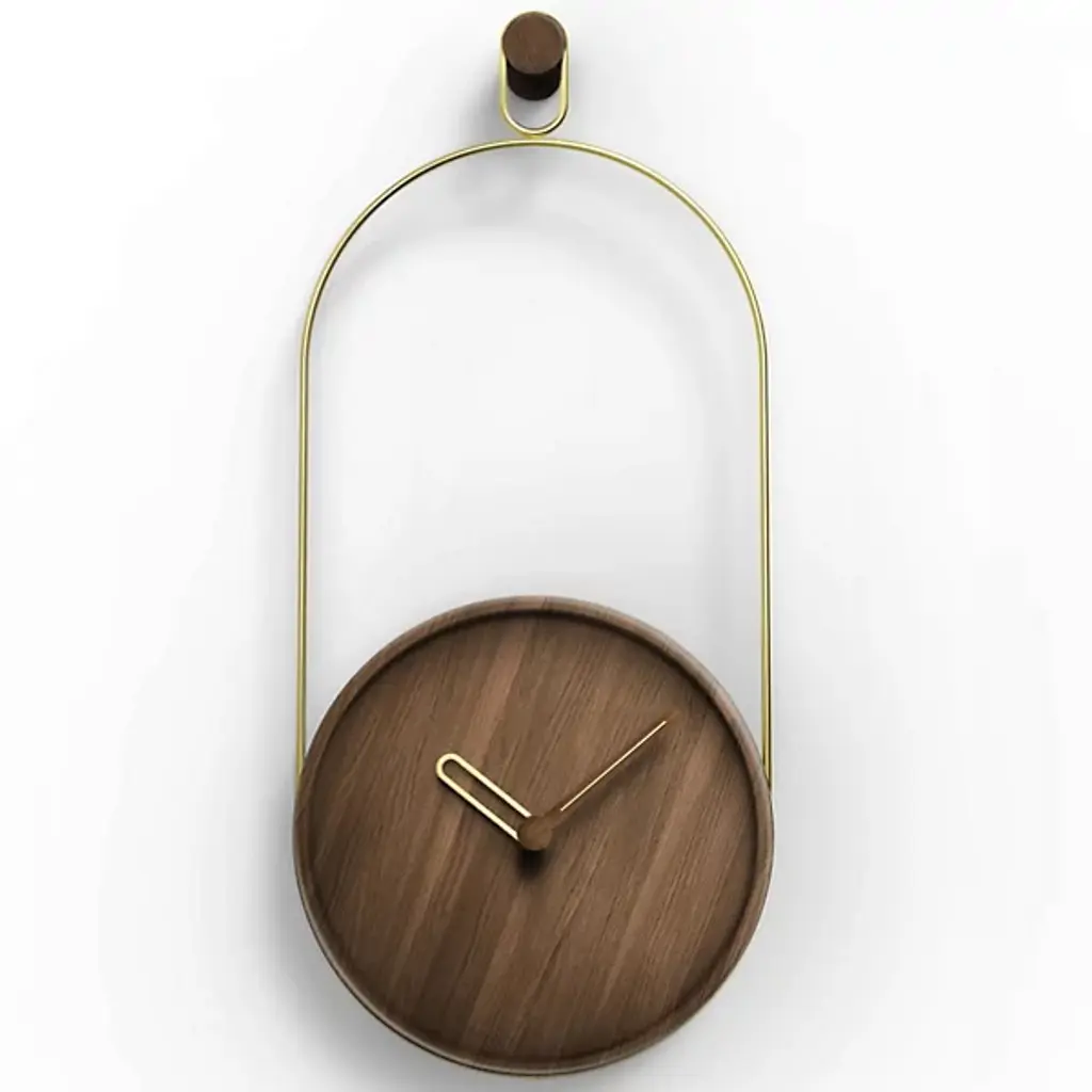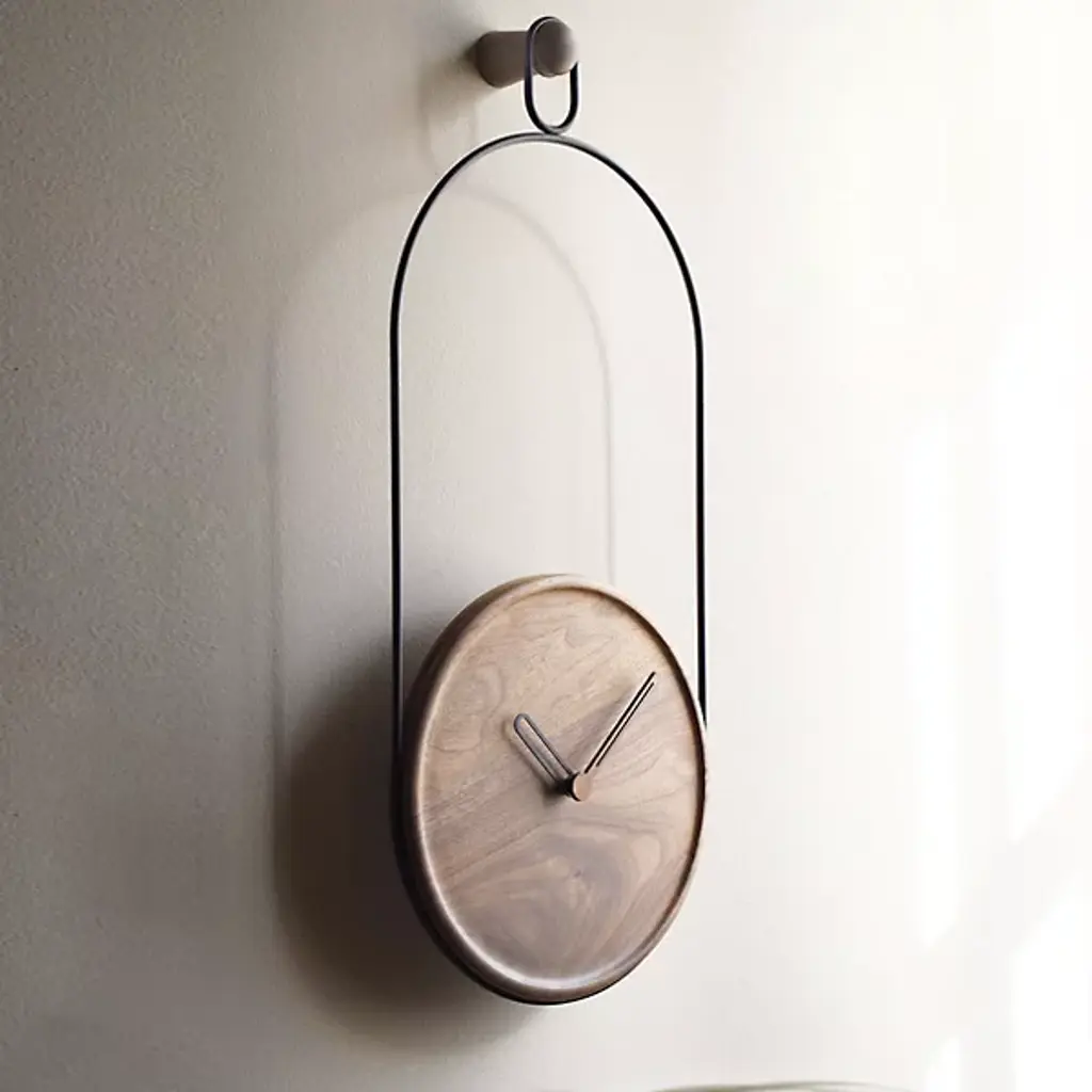 A sensible, elegant display perfect for the modern home. The Eslabon Walnut Wall Clock by Nomon is characterized by its pendulum-like suspension. This fixture hangs from a thin wire, with a slender steel ring forming a hook frame. The clock itself is constructed from solid walnut wood, with wooden and polished metal hands adding a contrasting touch.