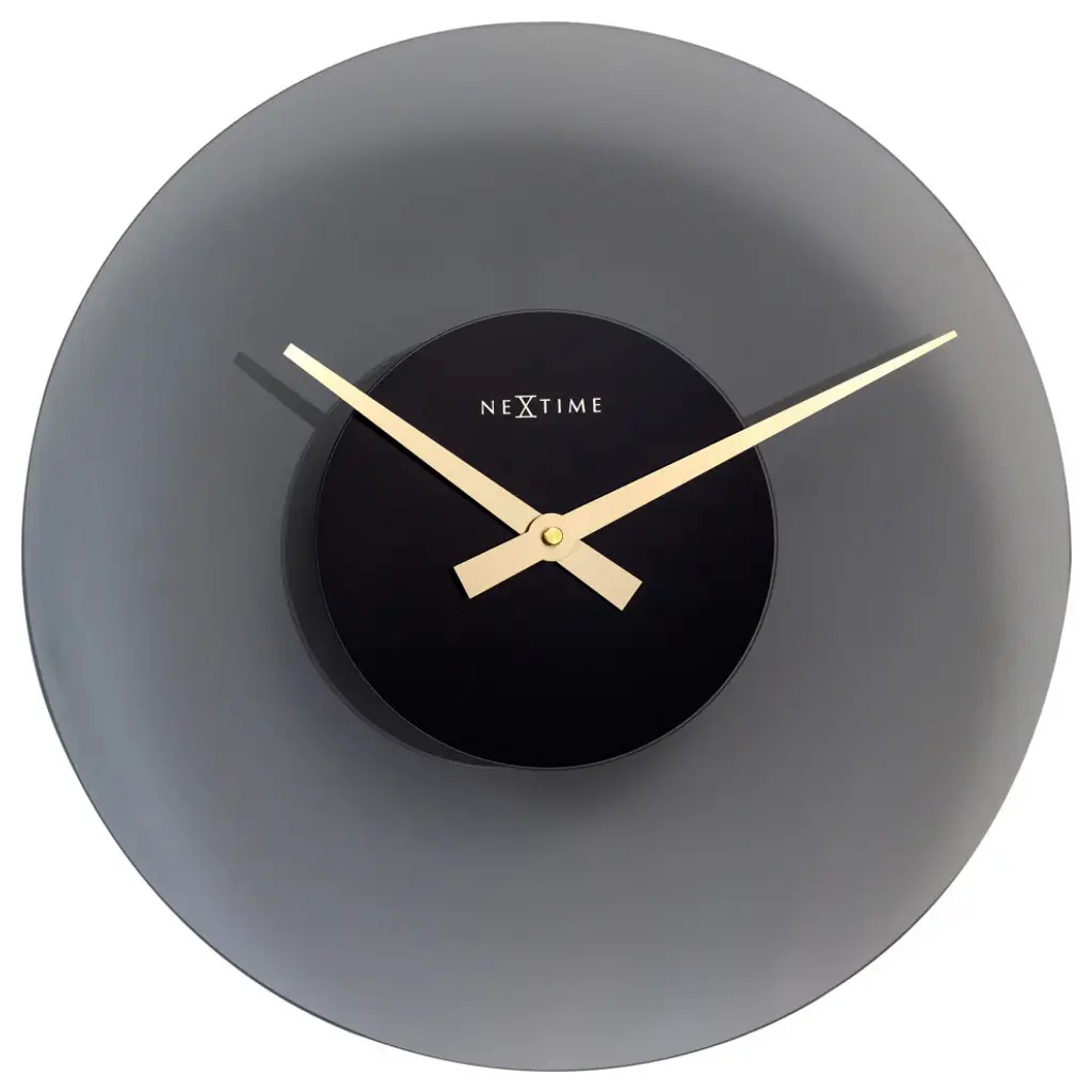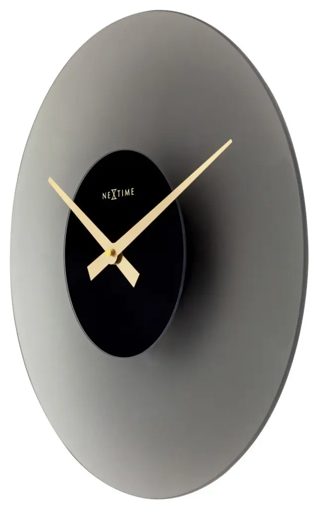 NeXtime Float is a silent 15.75-inch wall clock that uses glass as the primary material. It floats effortlessly on the wall with a curved frosted glass in grey set behind a black glossy dial and golden hands, creating a contrast between the soft and hard, and the solid and opaque. This clock runs on 1 x AA battery (not included)