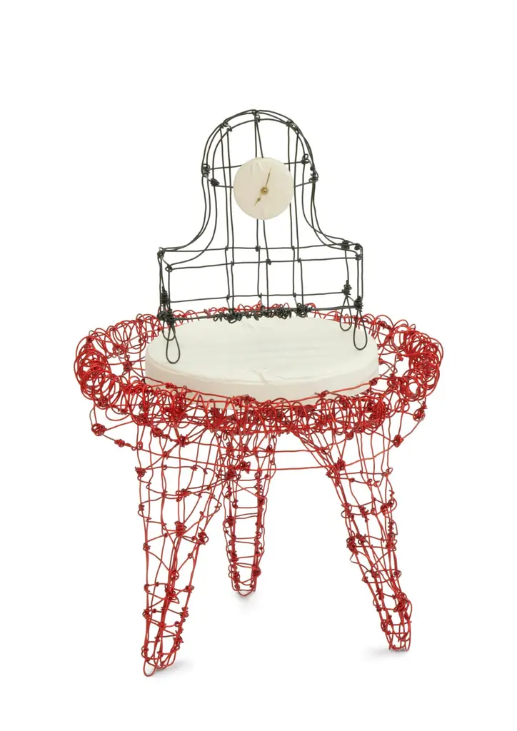 Kiki van Eijk designed floating frames as a collection of handmade objects in anodized aluminium wire. Each piece is meticulously handmade in her workshop; no two items are alike. Showing only the skeleton of the object yet representing a function in full state, these metal wire pieces seem to float in space. Kiki takes a single line and transforms it into a whimsical sculptural piece. By interweaving a ceramic part she highlights its function. The collection includes lighting, coffee table, candleholder, a mantel clock, wall clocks and a high cabinet, as an addition to the existing Floating Frames collection.Finishes: Brass, Brass sandblasted, Copper, Copper sandblasted, Copper oxidized, Copper sulphur, Copper sandblasted nickel plated, Copper 24-karat gold-plated, Copper nickel plated, Copper oxidized copper plated, Aluminium, Aluminium blue anodized, Aluminium red anodized, Aluminium black anodized. The clocks include a battery powered quartz clockwork.