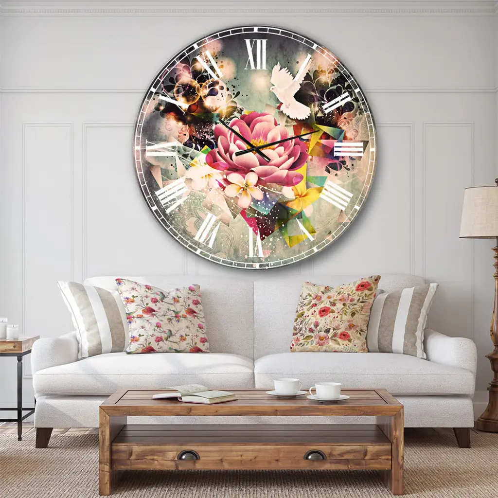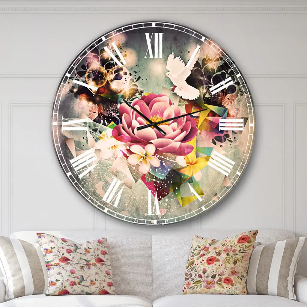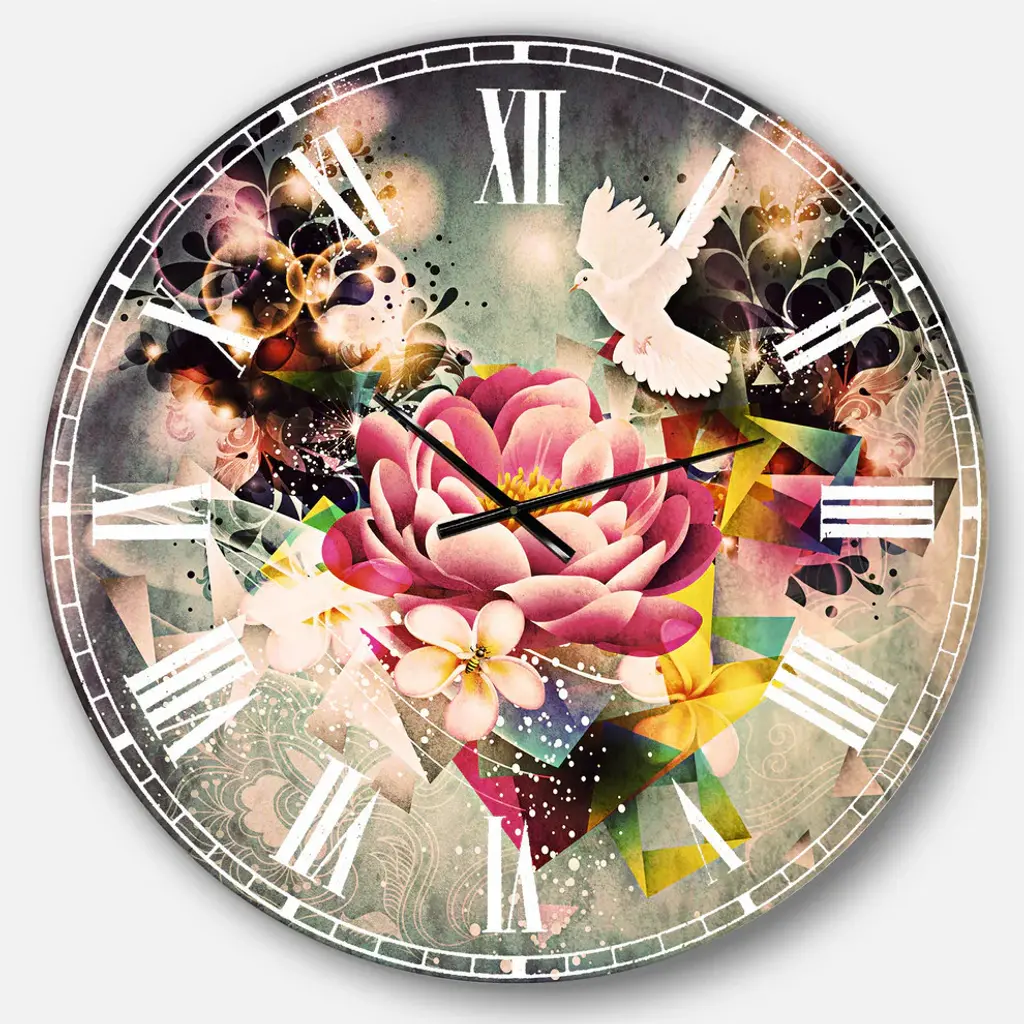 Flowers And Dove Abstract Design Floral Large Metal Wall Clock, 36x36