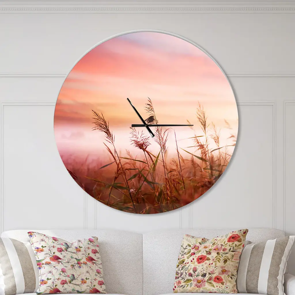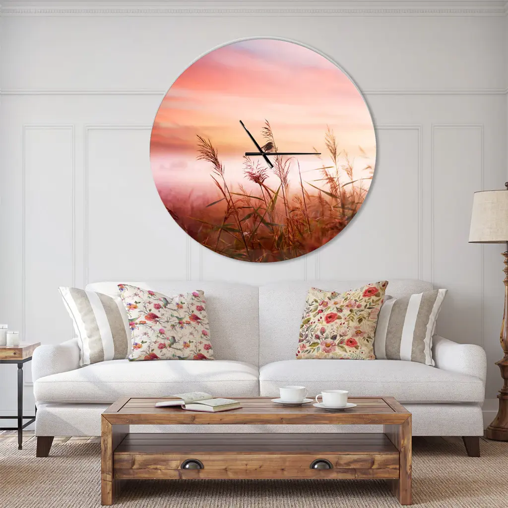 A beautiful addition to any home or office, this Farmhouse round wall clock is made on 100% solid aluminum. It has a highly reflective glossy finish creating a sleek modern look. This Foggy Land with Early Morning Mist wall clock arrives completely ready to hang on the wall. Simply insert the �AAA� battery included with your order.Available in several size, this Modern Oversized Clock makes it the focal point of any room.Features - Ultra Gloss Coating ensures colors are extra vibrant with light reflection. - 1mm Aluminum grade sheet metal. - 1-inch mounting frame gives the illusion of artwork floating on the wall. - Mounting brackets and instructions are included. - High quality digital images are created directly into a glossy aluminum panel, producing a stunning and captivating print in the glossy finish of the metal. - Looks better than any photo paper and guaranteed to last at least 20 years. - Easy to clean with a microfiber cloth. - "AAA" battery included with your order. - Easy to hang. - Style: Farmhouse - Material: Metal - Shape: RoundSee Options drop down for available sizes.