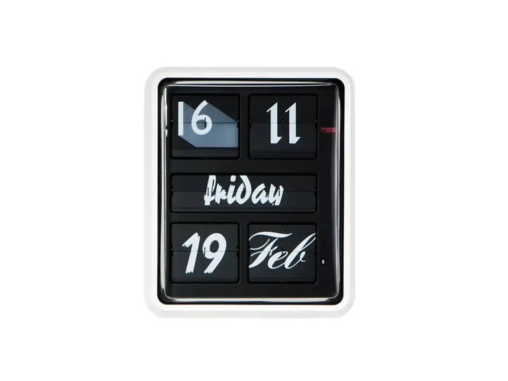 Font Clock is a wall clock made of ABS and transparent perspex.An instant design icon, Sebastian Wrong’s Font Clock features an ever-changing display that uses twelve different typefaces and a flip mechanism, in a design that is both nostalgic and contemporary.Materials:White ABS plastic, transparent perspex.