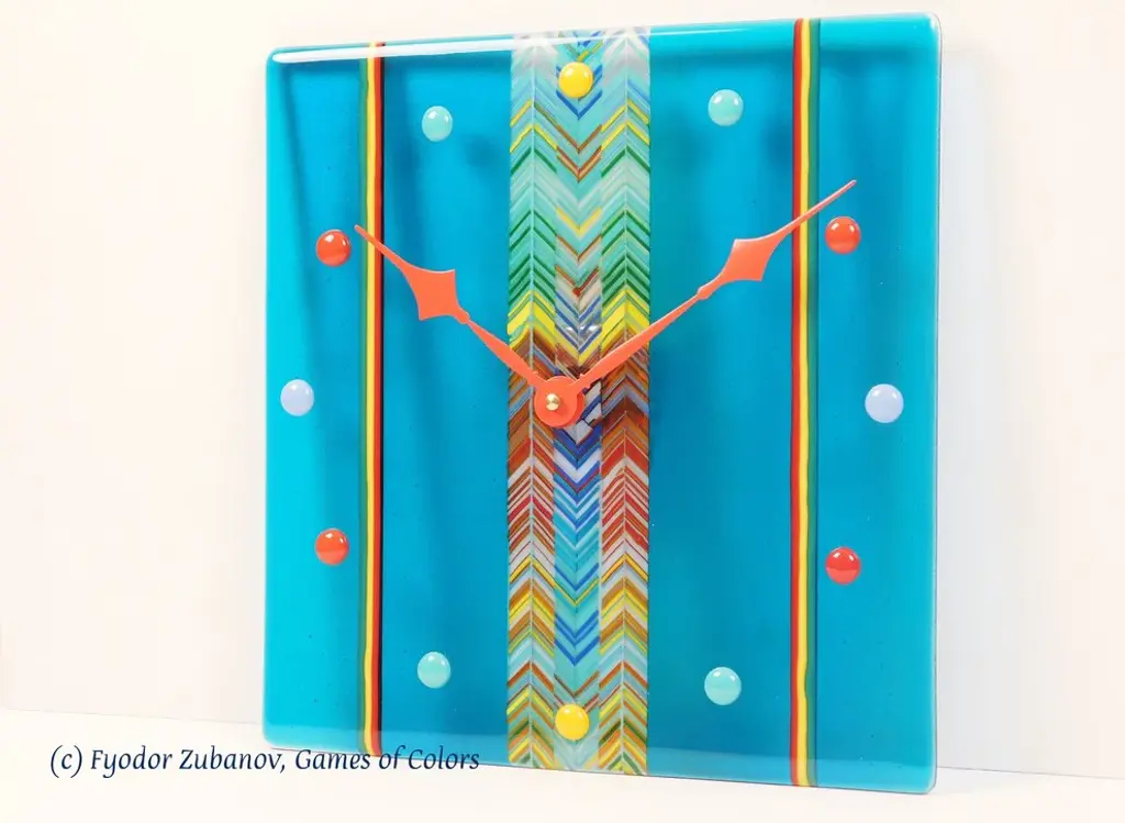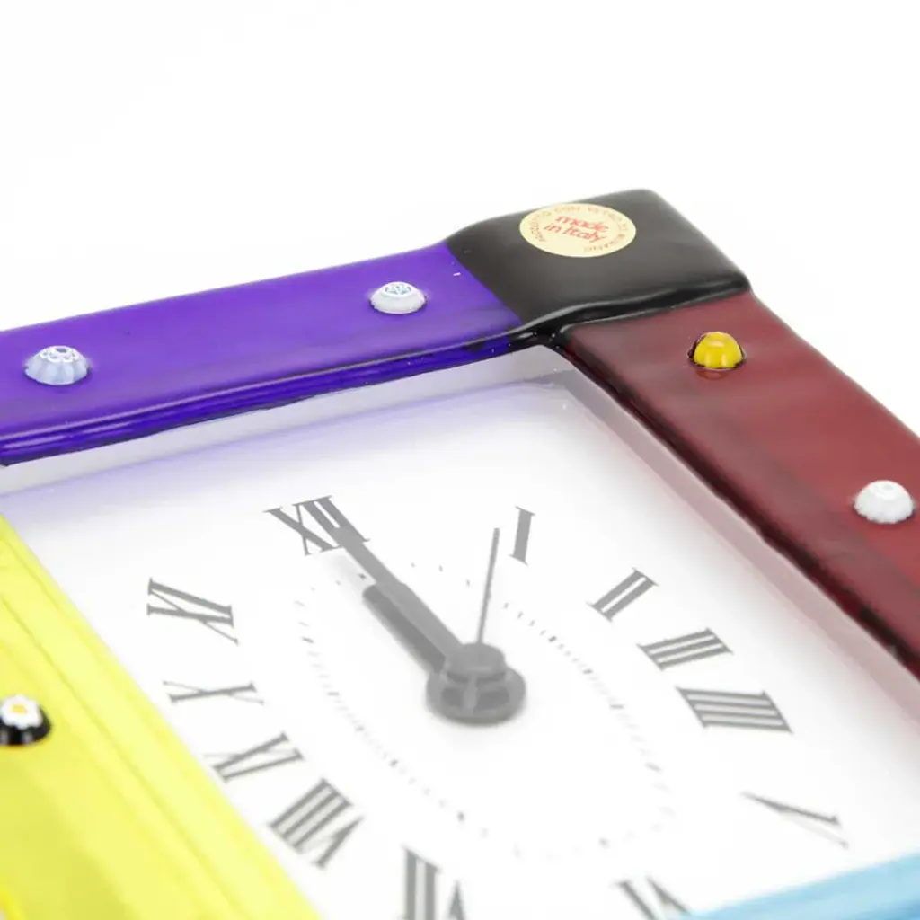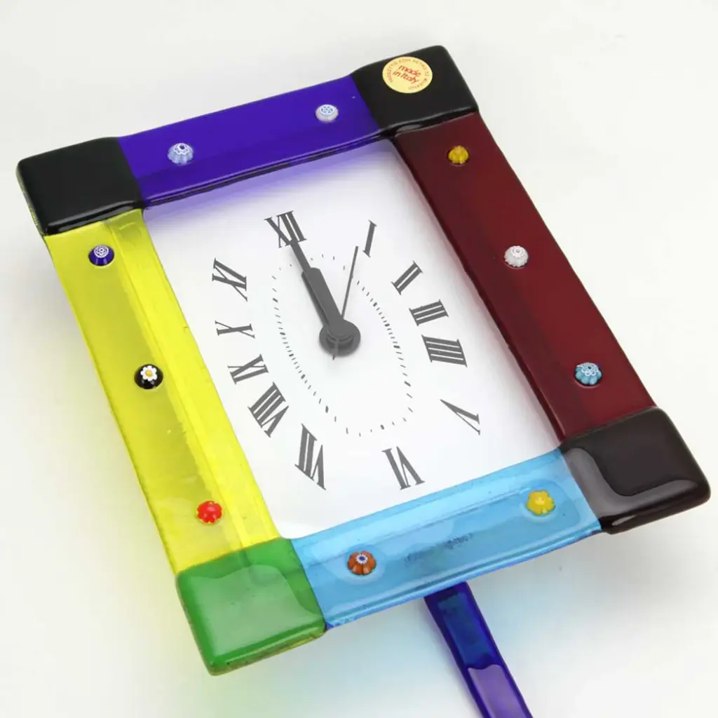 The passage of time is made easier by these wonderful Murano Glass wall Clocks in warm Mediterranean colors. Elegant, stylish, showcasing the contemporary Venetian art trends, this clock will add a refined accent to your decor and will remind you of Venice every time you look at it. The clock is handcrafted in a family-owned Murano workshop where talented Venetian artisans have been making beautiful glass for generations. Under fine Murano Glass-framed face there is a high quality Japanese movement ensuring not just decorative but also functional usefulness of this beautiful clock.This elegant clock is also perfect as a gift to someone who will appreciate Italian style and quality workmanship.Measurements: The Venetian glass clock face measures 7 in x 5 1/2 in, the length of the pendulum is 6 inches.Because each item is a unique work of art made by hand, slight variations of colors and patterns are possible.