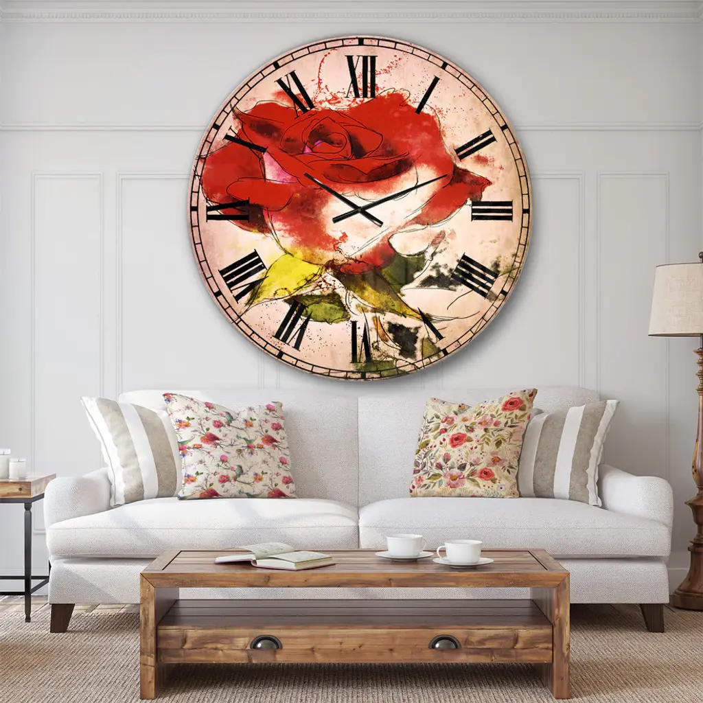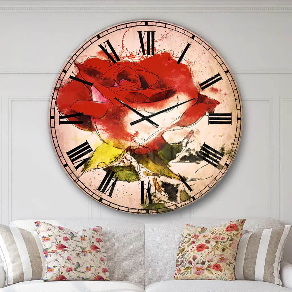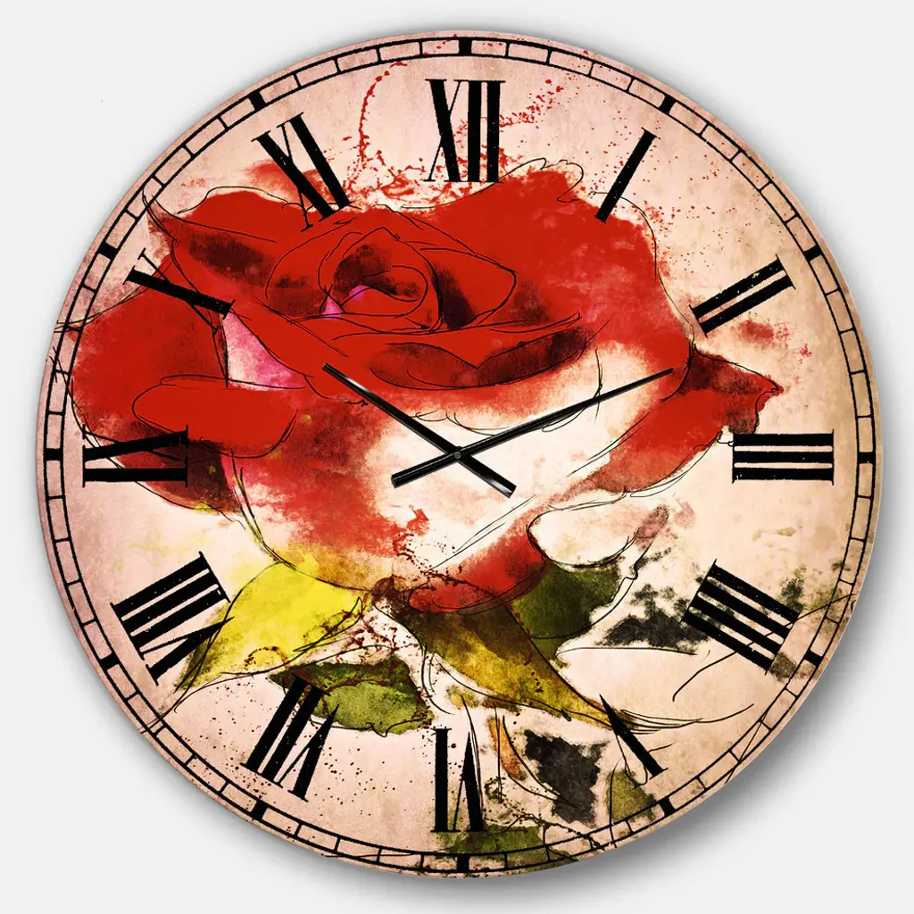 Hand Drawn Watercolor Rose Flower Floral Large Wall Clock, 36x36