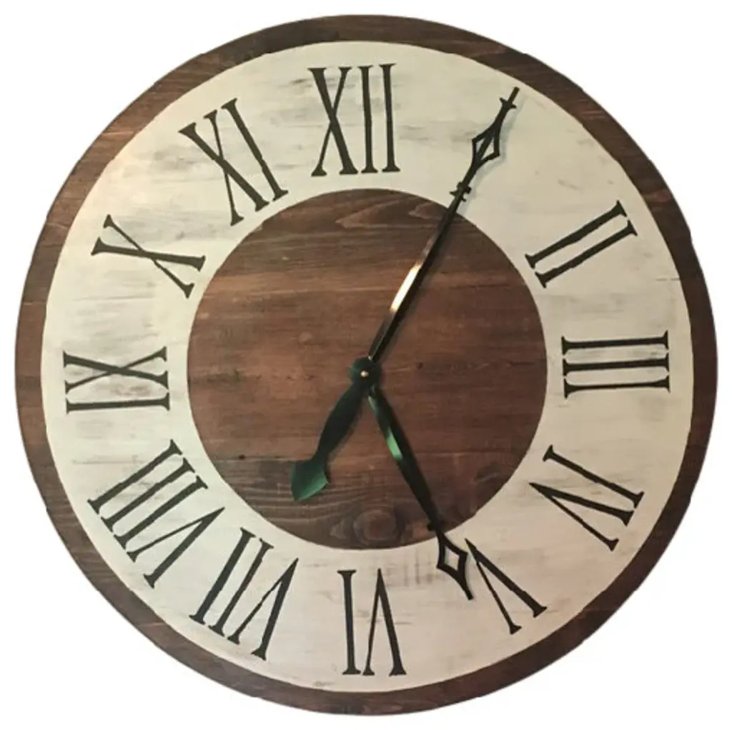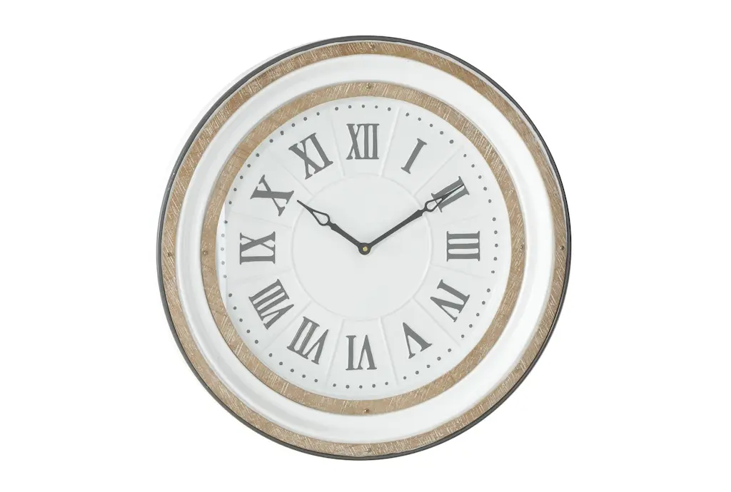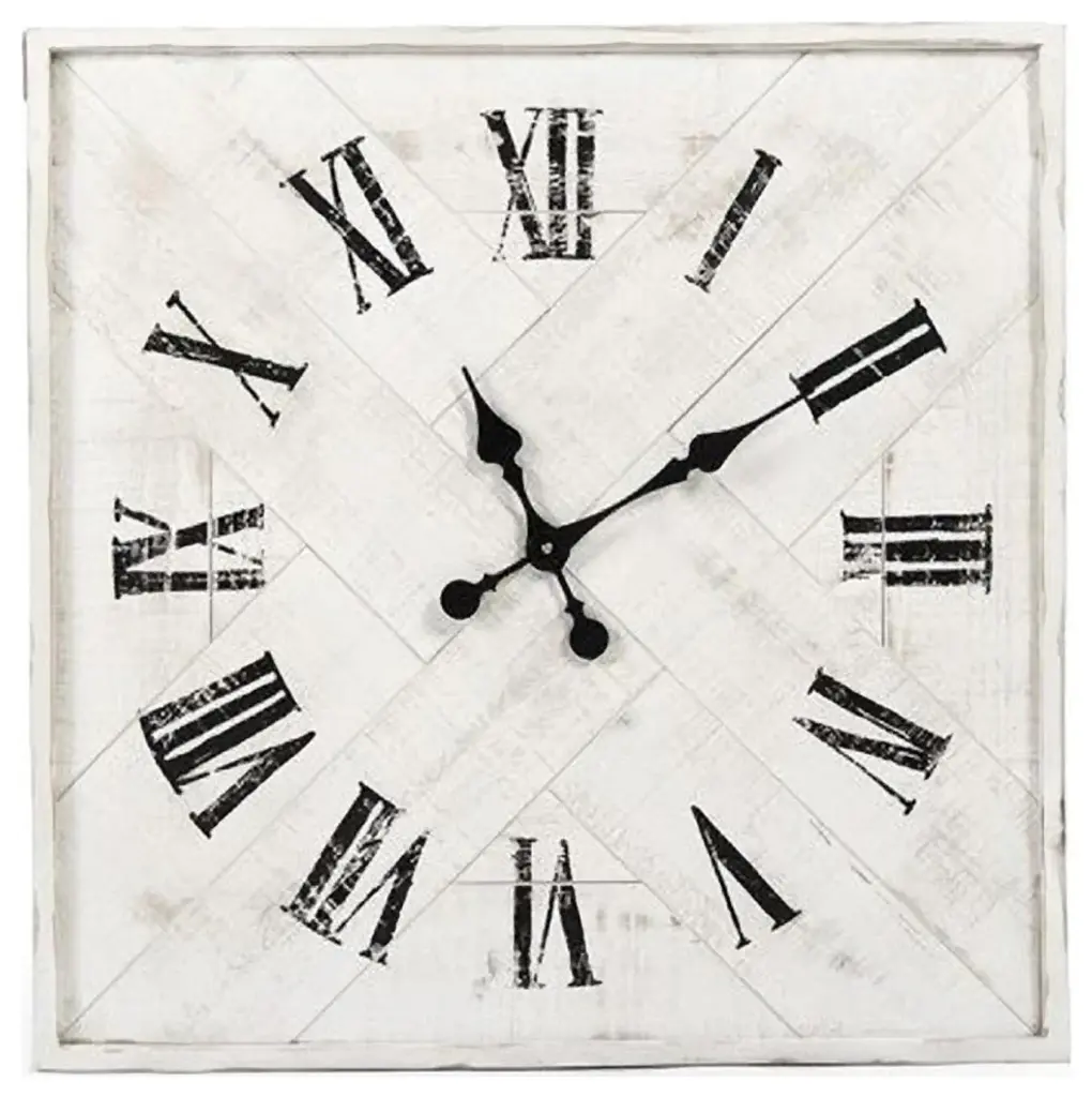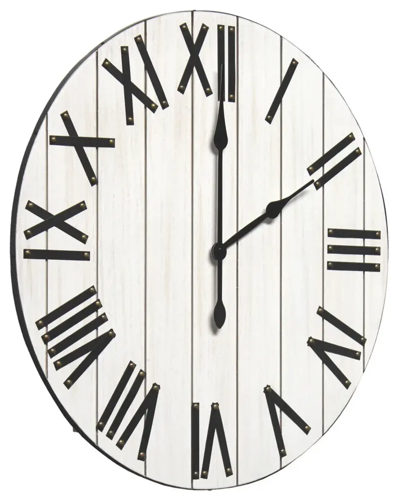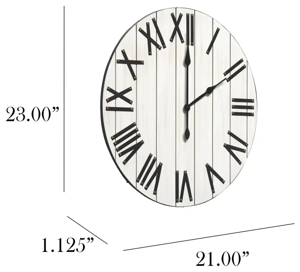 Elegant Designs Handsome 21" Rustic Farmhouse Wood Wall Clock, White WashHandsome 21" Rustic Farmhouse Wood Wall Clock, White Wash This sophisticated wall clock features a vintage finish with classic Roman numerals for a rustic antique look. Create an instant classic in your home decor with this 21" wall clock. It''s the perfect addition for the kitchen, living room, bedroom or foyer!Black Metal Pinned Roman numeralsWhite Wash finishMeasures 21"L x 1.13"W x 23"HUses 1 x AA battery (not included)Brackets for hanging included on back Rustic farmhouse styleFinish/Color: WHITE WASHProduct Dimensions (W x D x H): 1.125 x 21 x 23