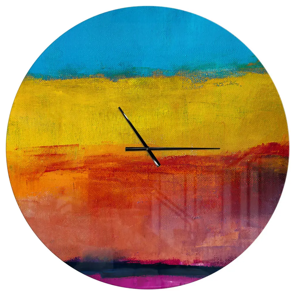 HangTime Designs presents the art of Dlynn Roll on this unique wall clock. Each image is beautifully printed reverse on the backside of acrylic. An attached frame allows for the clock to float off the wall. Quartz movement is operated by one AA battery. Made in the USA.