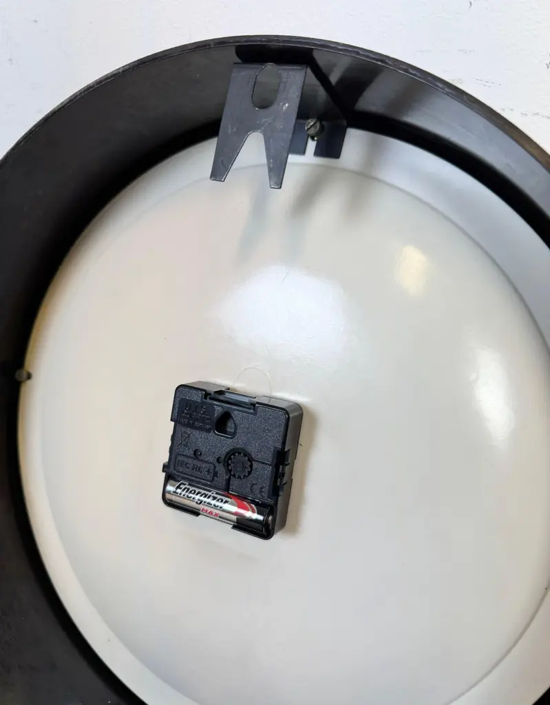 This wall clock was produced by Pragotron in former Czechoslovakia during the 1960s. It features a brown bakelite frame, a plastic dial, an aluminium hands and a convex clear glass cover. The piece has been converted into a battery-powered clockwork and requires only one AA-battery. Measures: diameter 32 cm. The weight of the clock is 1,4 kg.