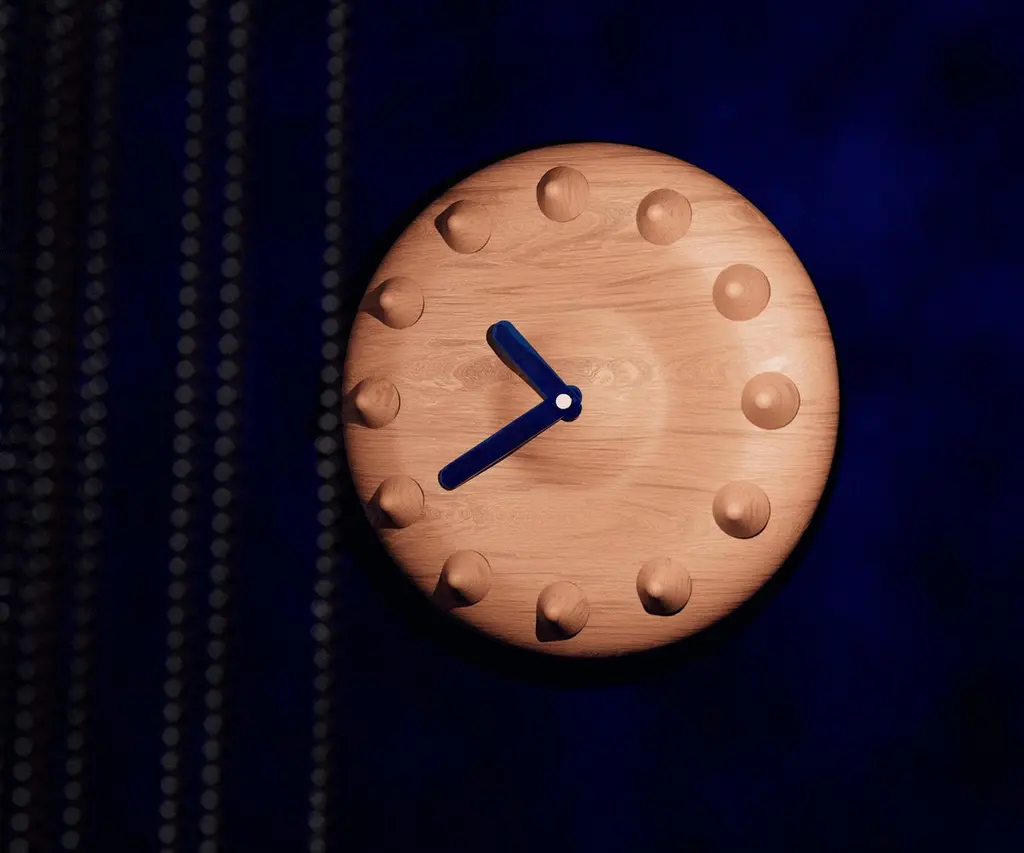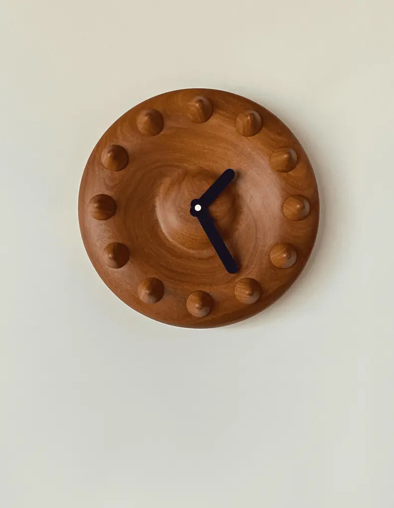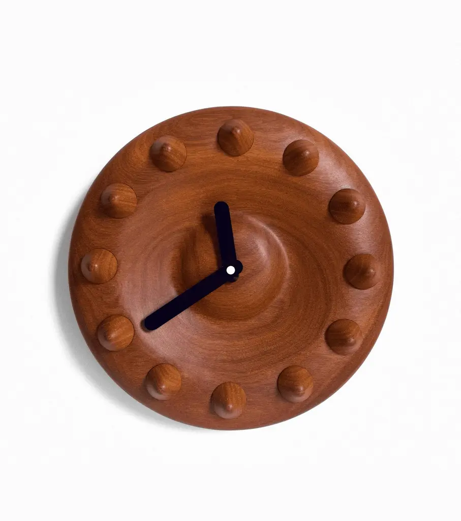 The Jambu wall clock is a hand-turned and carefully finished piece, with flowing lines and pointed shapes that invite you to stop and observe. The strangeness of the different is contagious and joyful. We are the movement of present time.Jambu wall clock with geometric hour markers, designed for indoor use. Made from a solid piece of Brazilian Cumaru wood, with a natural satin finish. Translucent blue acrylic hands and Quartz precision mechanism.As a natural material, wood varies in colour, grain and density, characteristics accentuated by the handcrafted process. Every detail is respected and valued, guaranteeing the uniqueness of each piece.To preserve the integrity of the wood, use only a dry cloth, flannel or duster for cleaning. Avoid damp cloths and do not use chemical products or water directly on the surface.Images for illustrative purposes only. The appearance of the product may vary according to specifications, batch of material and handcrafted finish.