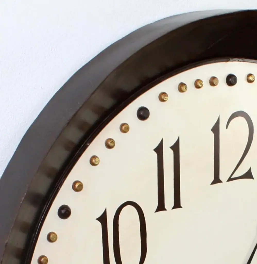 Classic and retro, our luxe clock is an elegant and functional piece of art for the wall. The studded accents perfectly complement the hand finished wood face. The deeply beveled, thick iron frame has a rich brown and black finish. Available separately in a larger size.• 31" dia x 3" deep. Weighs 11.5 lbs.• Handcrafted Iron and Wood• Wire hanger for easy and secure mounting. Uses AA batteries (not included)• Heirloom Quality - Expertly hand crafted and hand finished. Due to the hand crafted nature of this piece, each piece may have subtle differences.