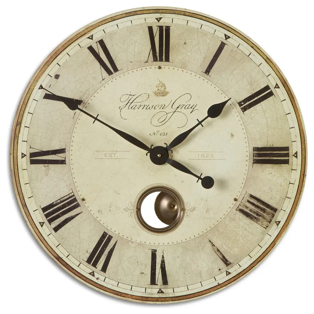 Weathered, Laminated Clock Face With Brass Center Components And Internal Pendulum. Includes one 23" clock - larger size available separately!- 23" dia x 2" deep. Weighs 3 lbs.- Hardwood Composite, Brass, and Aluminum- Quartz movement ensures accurate timekeeping. Requires one "AA" battery (not included)- Heirloom Quality - Expertly hand crafted and hand finished. Due to the hand crafted nature of this piece, each piece may have subtle differences.
