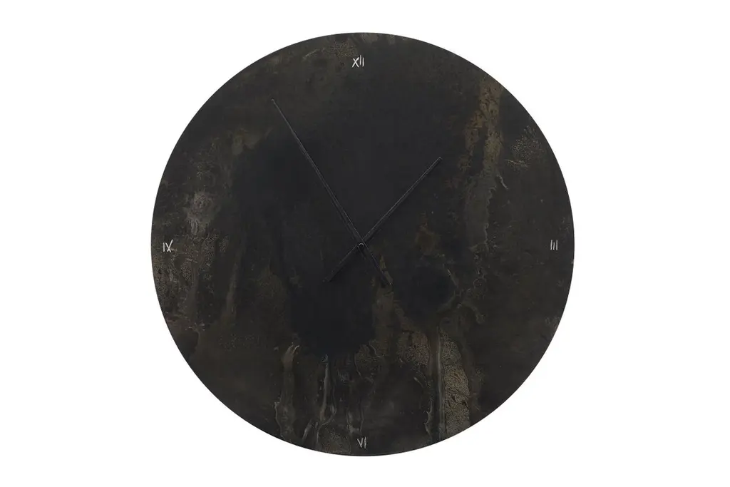This impressive wall clock is made from steel which is cut and then spot heated with a blowtorch and painted with different black oxides to evoke a warm, vibrating depth to a commonly cold material. The thin gauge steel is then laminated to a walnut-ply core. The numerals are hand-etched by the artist .The high-torque clock motor runs on a single AA battery and adjusts automatically to daylight savings time in the US. This is a bespoke piece so custom dimensions, materials, colors and finishes (both interior and exterior) can be accommodated. Please inquire for pricing.All Stefan Rurak studio pieces are designed and handcrafted in Brooklyn, New York.