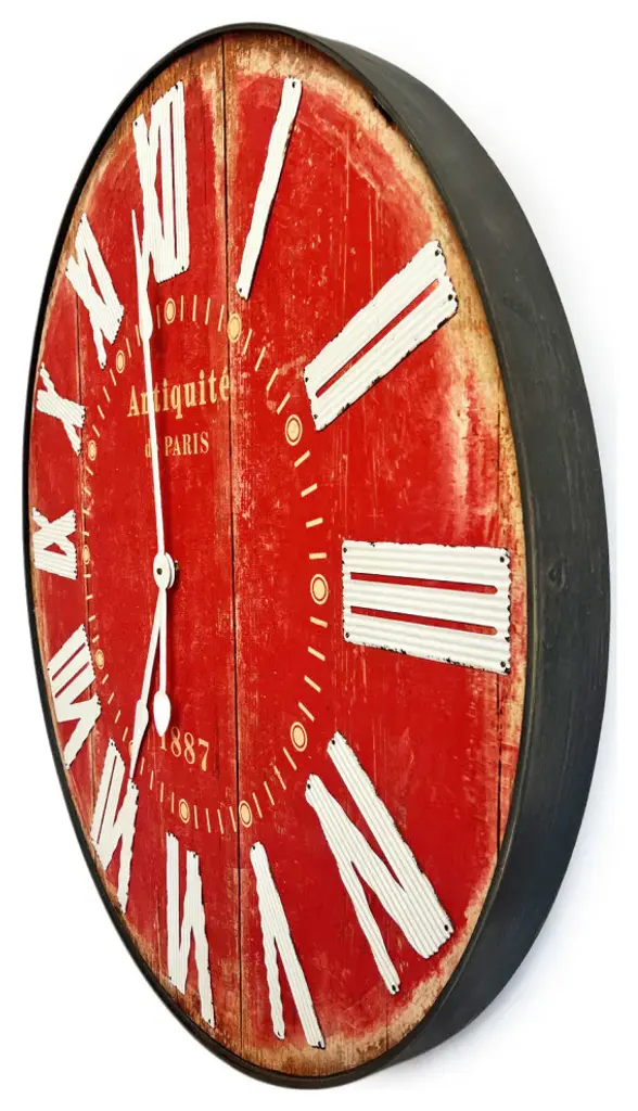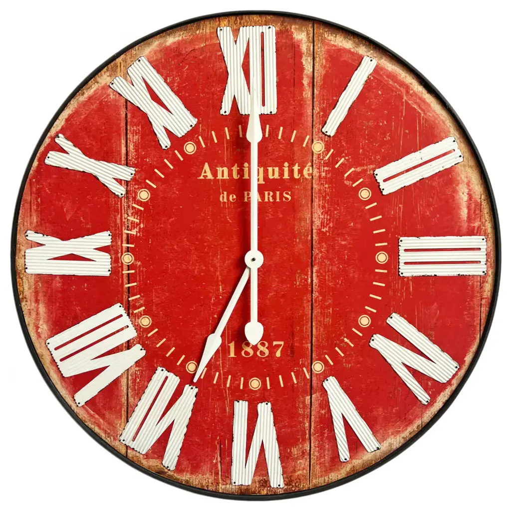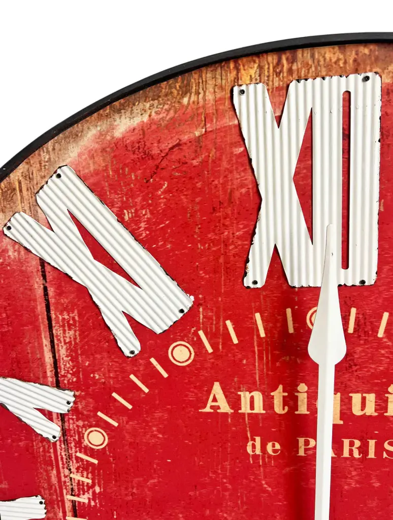 Charming large vintage style red wall clock. Rustic distressed finish with white metal Roman numerals and clock hands. Classic colors and large size makes this clock a wonderful fun statement wall piece for your space.