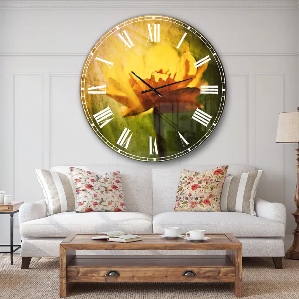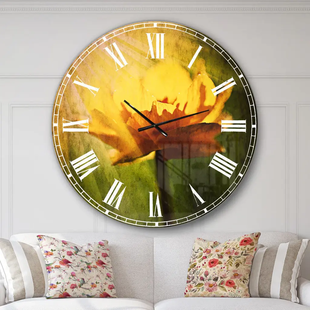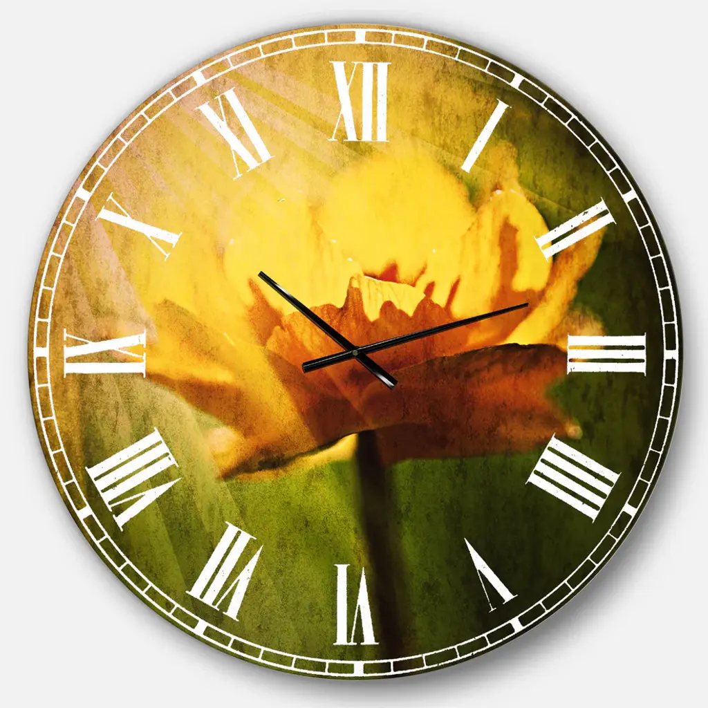 A beautiful addition to any home or office, this Traditional round wall clock is made on 100% solid aluminum. It has a highly reflective glossy finish creating a sleek modern look. This Large Yellow Flower in Spotlight wall clock arrives completely ready to hang on the wall. Simply insert the �AAA� battery included with your order.Available in several size, this Modern Oversized Clock makes it the focal point of any room.Features - Ultra Gloss Coating ensures colors are extra vibrant with light reflection. - 1mm Aluminum grade sheet metal. - 1-inch mounting frame gives the illusion of artwork floating on the wall. - Mounting brackets and instructions are included. - High quality digital images are created directly into a glossy aluminum panel, producing a stunning and captivating print in the glossy finish of the metal. - Looks better than any photo paper and guaranteed to last at least 20 years. - Easy to clean with a microfiber cloth. - "AAA" battery included with your order. - Easy to hang. - Style: Traditional - Material: Metal - Shape: RoundSee Options drop down for available sizes.